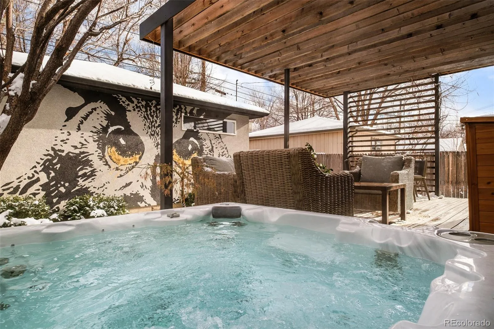 A rare blend of classic bungalow charm and refined modern luxury, this fully remodeled South Bonnie Brae residence captivates from the very first moment. Soaring 9.5-foot ceilings and expansive new windows invite streams of natural light to dance across 5-inch solid white oak flooring, creating an atmosphere of effortless elegance. The designer custom kitchen is a true showpiece, boasting Bosch stainless steel appliances and an extraordinary 12-foot honed Carrara marble island with waterfall edge. The serene primary suite features a walk-in closet and spa-worthy bath with heated floors and Carrara marble finishes. Thoughtful upgrades continue outdoors with professional landscaping, a large east-facing deck and a hot tub designed for year-round enjoyment. A newly built detached two-car garage with epoxy floor coating, new HVAC and turnkey systems add peace of mind. With close proximity to Gaylord Street, Washington Park and easy access to Cherry Creek, this home embodies elevated Denver living.