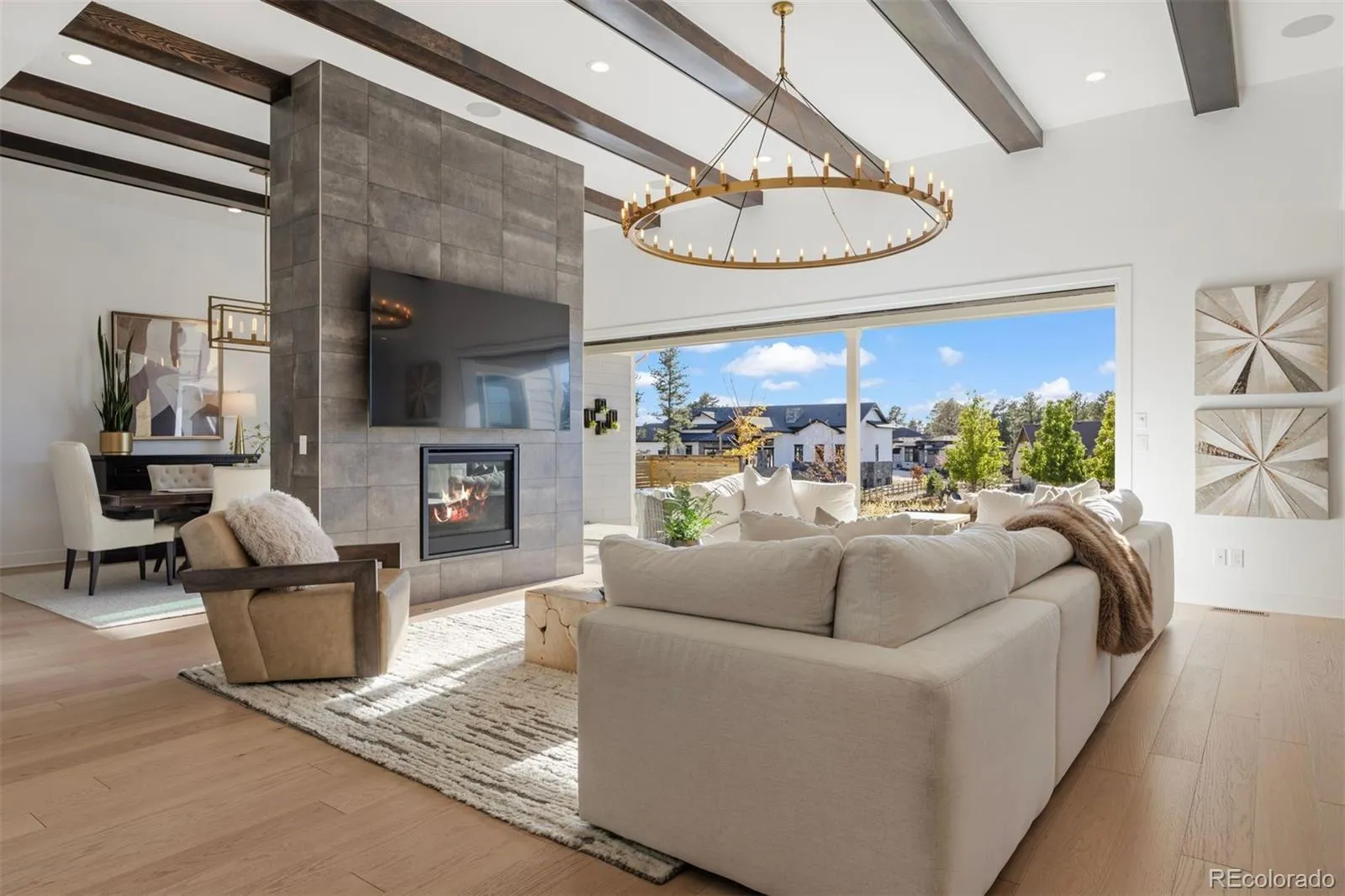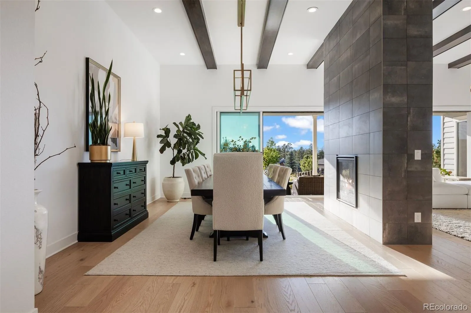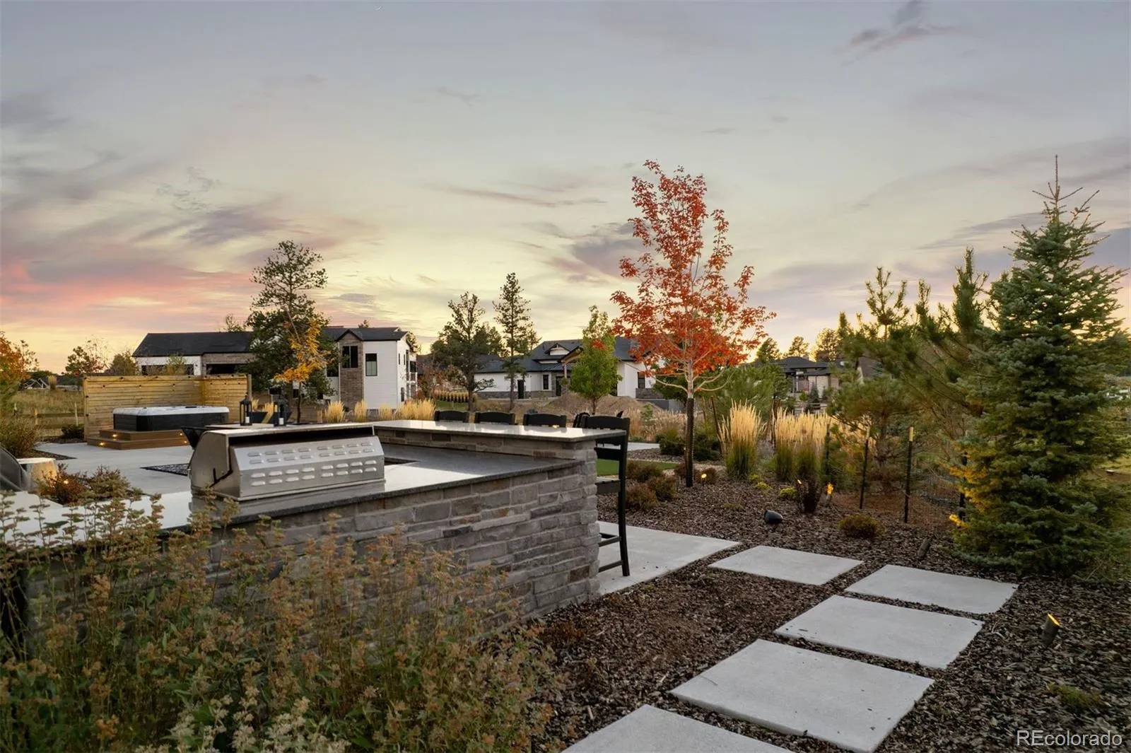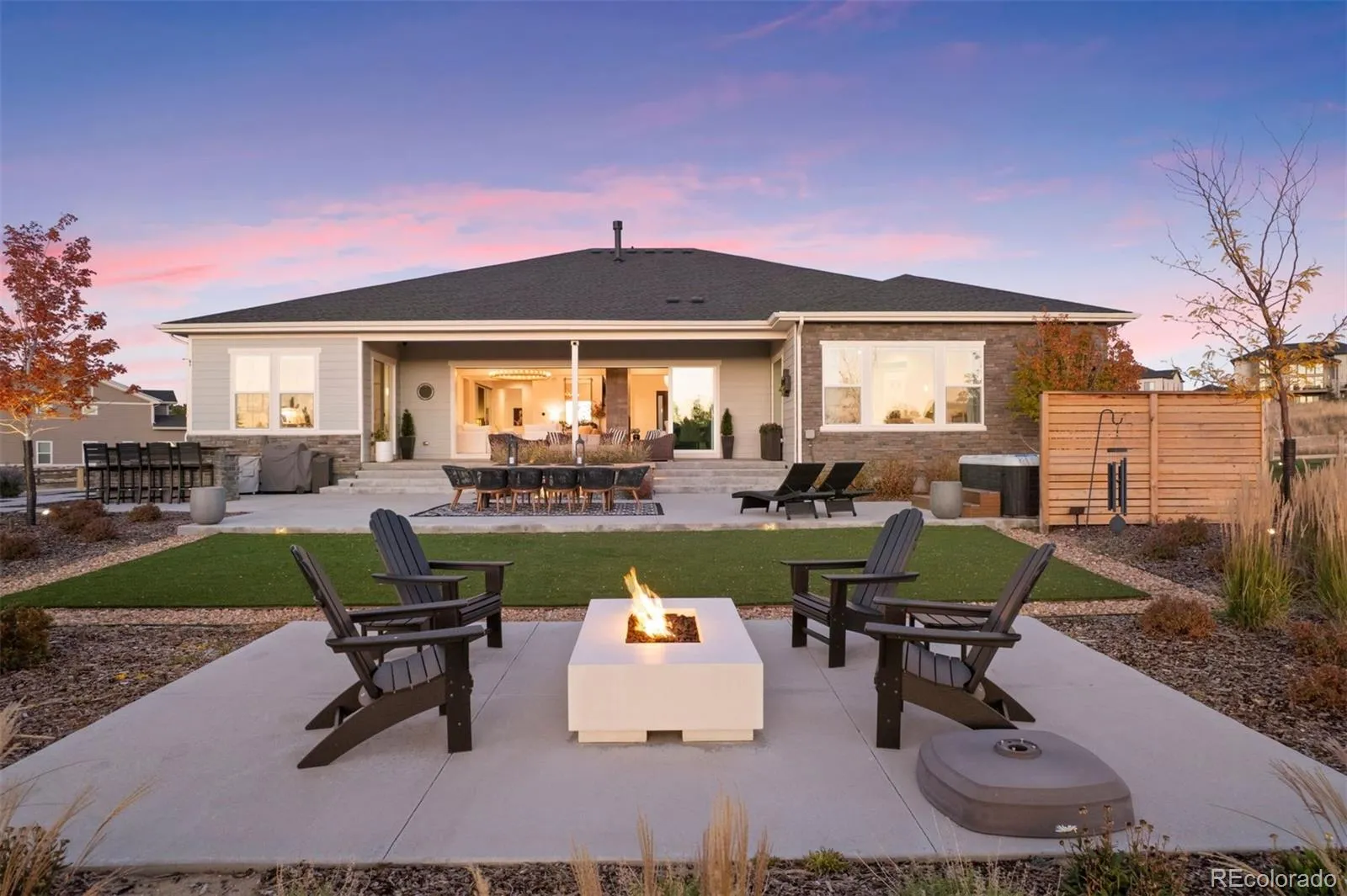Nestled on a premier private homesite in the coveted Timbers at the Pinery, this exceptional ranch-style home offers refined Colorado living at its finest. Featuring four bedrooms and five bathrooms, the residence is filled with natural light, soaring ceilings, and exquisite craftsmanship throughout. The welcoming entry opens to 12-foot beamed ceilings and an open floor plan that seamlessly connects the dining area, custom two-sided fireplace, and spacious living room. Expansive 24-foot stacked sliding patio doors create effortless indoor-outdoor living. The gourmet kitchen overlooks the living space and showcases a 10-foot waterfall island, custom cabinetry to the ceiling, four ovens, a 48-inch professional range, built-in 42-inch refrigerator, designated eating area and a large walk-in pantry. The backyard is a private entertainer’s retreat with an expansive patio, stunning western sunset and mountain views, built-in fire pit, hot tub, built in grill and wet bar area, and ample grassy space. Inside, Restoration Hardware lighting, 8-inch white oak floors, and timeless finishes reflect thoughtful attention to detail. The main-floor primary suite overlooks the backyard and features a spa-like five-piece bath and custom walk-in closet. Two additional ensuite bedrooms, a main-floor office with glass French doors, and a functional mudroom and laundry complete the main level. The remodeled lower level is designed for entertaining with a large recreation room, game room, fully equipped wet bar, surround sound, and Control4 system throughout the home and outdoor spaces. A guest bedroom, exercise room or optional fifth bedroom, and generous storage complete the lower level. Residents of the Timbers have the option to join the Pinery Country Club or the Golf Club at Pradera, offering world-class golf, fitness, swimming, and social amenities. This is more than a home—it’s a true reflection of the Colorado lifestyle.