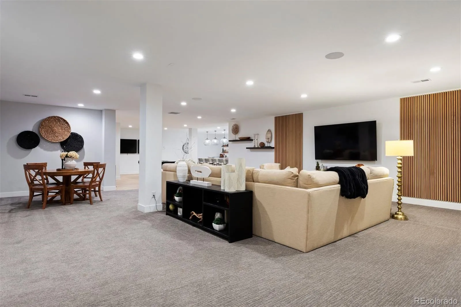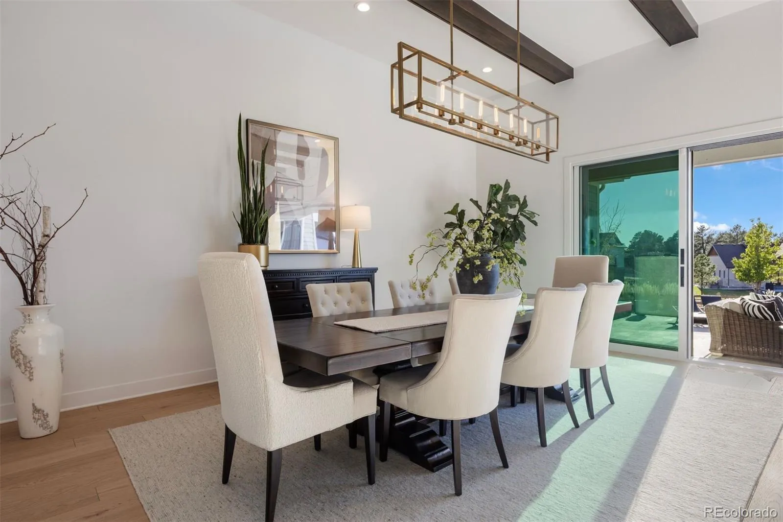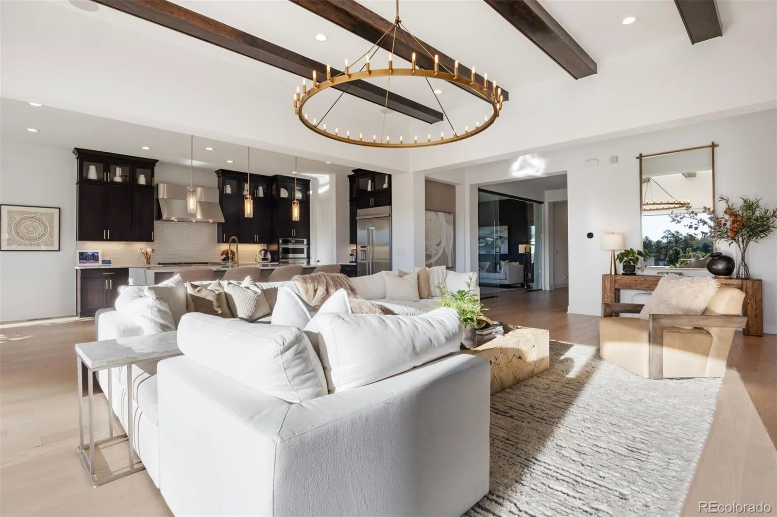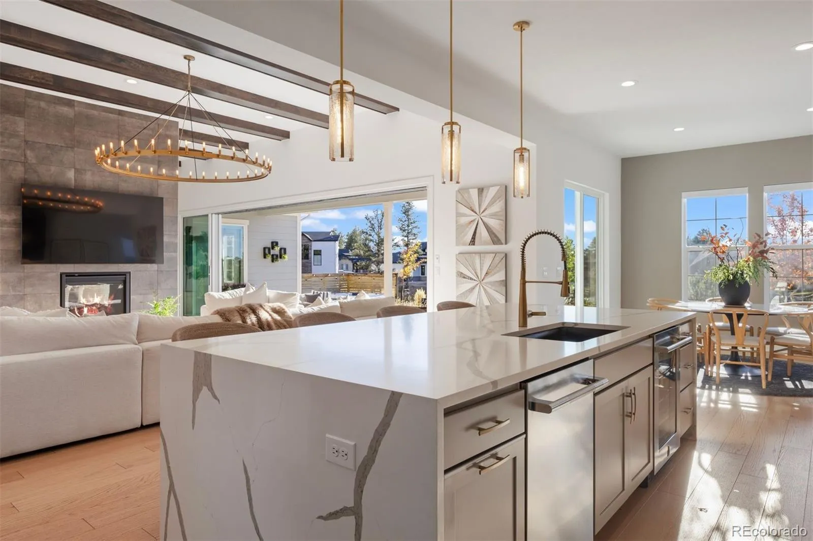 Nestled on a premier private homesite in the coveted Timbers at the Pinery, this exceptional ranch-style home offers refined Colorado living at its finest. Featuring four bedrooms and five bathrooms, the residence is filled with natural light, soaring ceilings, and exquisite craftsmanship throughout. The welcoming entry opens to 12-foot beamed ceilings and an open floor plan that seamlessly connects the dining area, custom two-sided fireplace, and spacious living room. Expansive 24-foot stacked sliding patio doors create effortless indoor-outdoor living. The gourmet kitchen overlooks the living space and showcases a 10-foot waterfall island, custom cabinetry to the ceiling, four ovens, a 48-inch professional range, built-in 42-inch refrigerator, designated eating area and a large walk-in pantry. The backyard is a private entertainer’s retreat with an expansive patio, stunning western sunset and mountain views, built-in fire pit, hot tub, built in grill and wet bar area, and ample grassy space. Inside, Restoration Hardware lighting, 8-inch white oak floors, and timeless finishes reflect thoughtful attention to detail. The main-floor primary suite overlooks the backyard and features a spa-like five-piece bath and custom walk-in closet. Two additional ensuite bedrooms, a main-floor office with glass French doors, and a functional mudroom and laundry complete the main level. The remodeled lower level is designed for entertaining with a large recreation room, game room, fully equipped wet bar, surround sound, and Control4 system throughout the home and outdoor spaces. A guest bedroom, exercise room or optional fifth bedroom, and generous storage complete the lower level. Residents of the Timbers have the option to join the Pinery Country Club or the Golf Club at Pradera, offering world-class golf, fitness, swimming, and social amenities. This is more than a home—it’s a true reflection of the Colorado lifestyle.