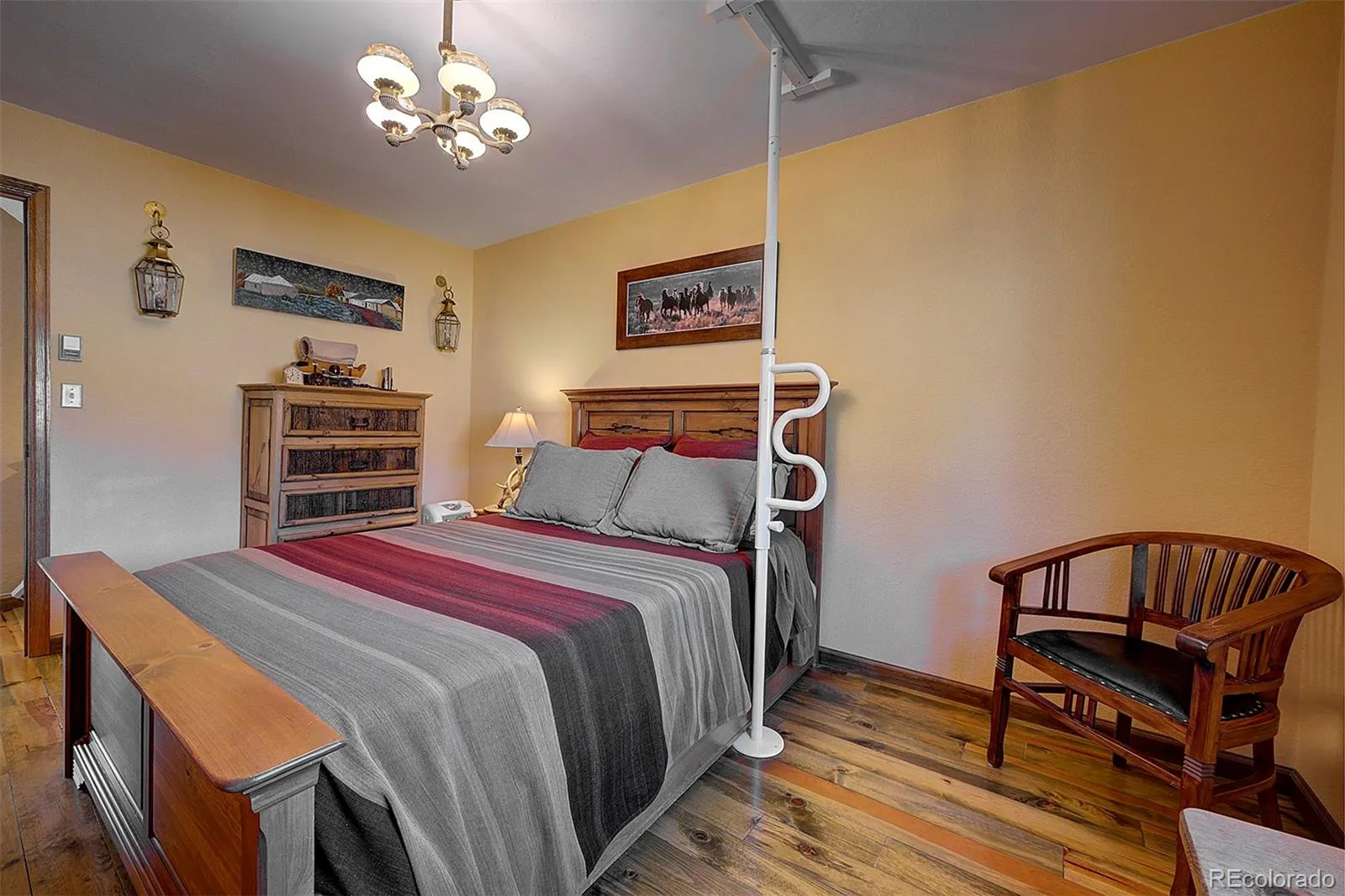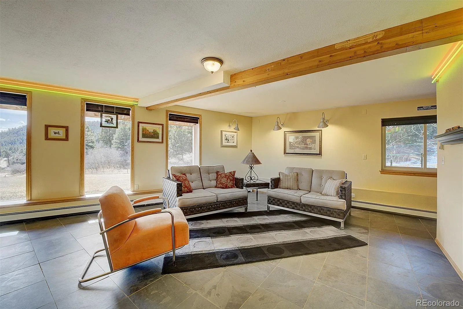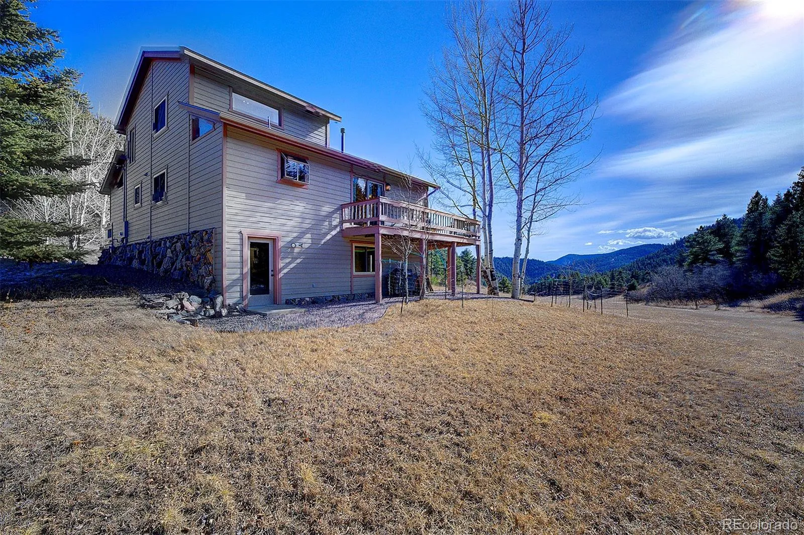 Bathed in natural light and framed by soaring windows, this inviting mountain home blends rustic elegance with open design. The main living areas feature vaulted ceilings with exposed wood beams, warm hardwood floors, and expansive walls of windows that capture peaceful views of the surrounding landscape and flood the space with sunlight throughout the day. A striking stone fireplace anchors the great room, creating a natural gathering place.