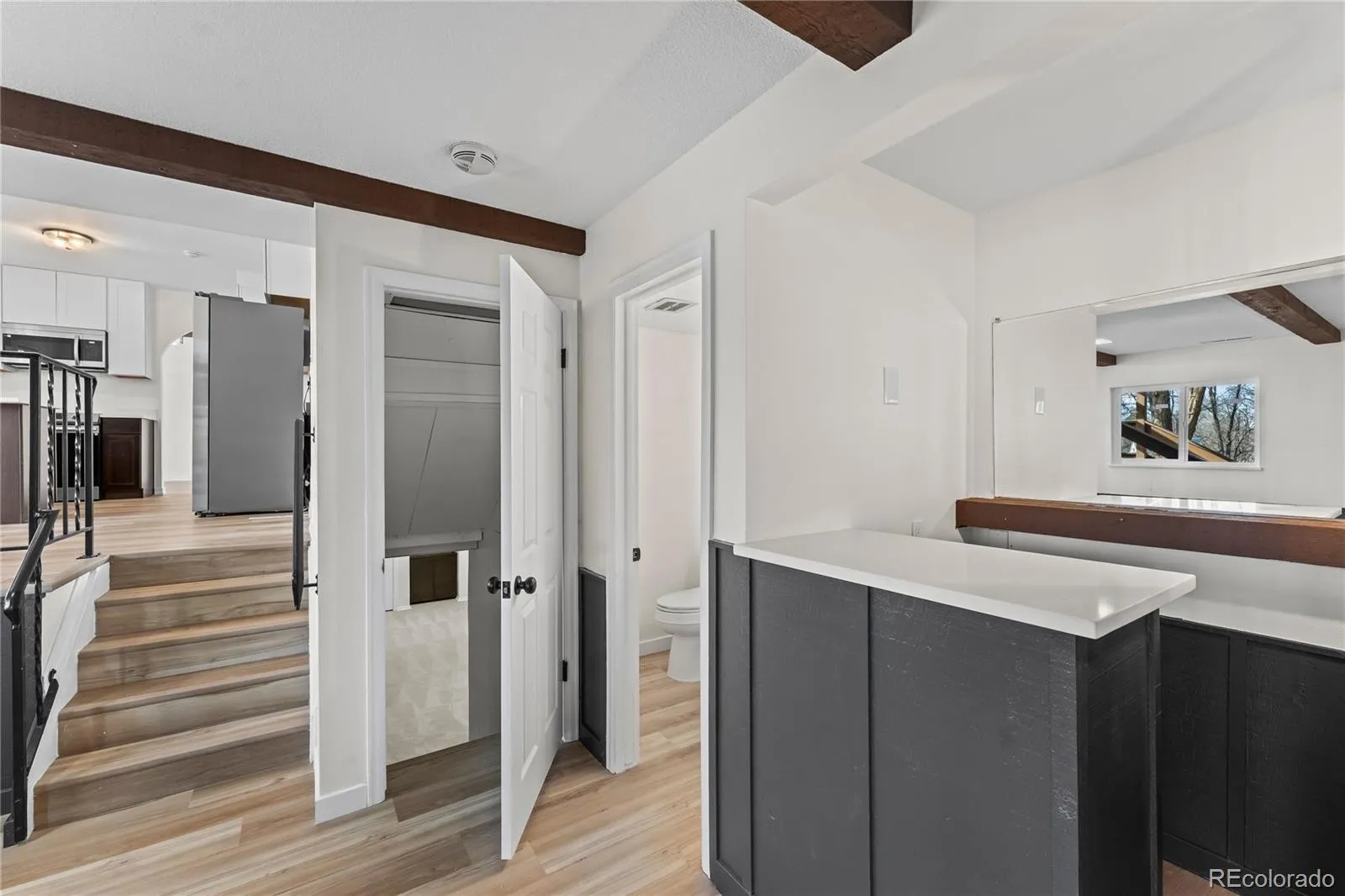 Welcome to your own private sanctuary in the coveted Valley Hi Golf Course Subdivision. Tucked at the edge of the golf course, this beautifully renovated home offers magnificent views of Pikes Peak that greet you the moment you enter the neighborhood. Set on a generous 0.33-acre lot with mature landscaping and exceptional curb appeal, the property features a graceful circular driveway and serene, park-like surroundings. Step inside to discover a light-filled, modern interior finished with thoughtful elegance: Dramatic vaulted living room with exposed original wood beams, cathedral arches, luxury vinyl plank flooring & a large bay window with views! The formal dining room ideal for gatherings. Completely reimagined kitchen featuring 42″ cabinetry, sleek quartz countertops, brand-new stainless steel appliances, and a sunny breakfast nook. Upstairs you’ll find a generous primary suite boasting a spacious walk-in closet and a luxurious en-suite bath with a walk-in rain shower and breathtaking mountain views. Two additional bedrooms and a full bath complete the upper level. The lower level offers a warm family room w/ a classic brick fireplace, half bath & mini-bar area. The finished basement provides excellent flexibility: a large rec room/flex space plus an additional bedroom. Outside, the backyard feels like your personal Colorado retreat: professionally Xeriscaped with low-maintenance beauty, a large composite deck under a stylish pergola, and ample space for relaxation and entertaining. A second oversized driveway at the rear easily accommodates extra vehicles, an RV, or boat. Recent high-quality updates: Brand-new roof (Class 4 hail-resistant shingles), Fresh interior and exterior paint, Luxury vinyl plank flooring, new carpet, remodeled bathrooms, modern glass lighting fixtures. Situated directly across from the Valley Hi Golf Course and Clubhouse, this rare combination of privacy, panoramic views, modern upgrades, and golf-course proximity will not last long!