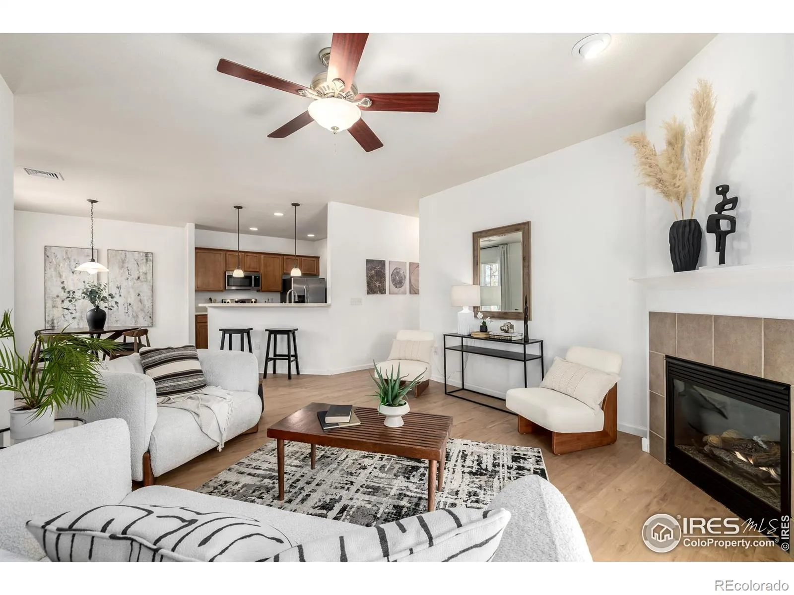 Set within the welcoming grounds of The Timbers Condominiums, this thoughtfully updated first floor residence offers the ease of condo living with the spatial comfort and privacy of an elegant townhome. Light moves freely through an open and intuitive layout, creating a home that feels both grounded and expansive from the moment of entry. New luxury vinyl flooring carries a warm, cohesive tone throughout the interior, guiding the eye from the living area to the kitchen and dining space in one continuous rhythm. The living room unfolds with generous proportions and a striking fireplace that serves as an architectural focal point, inviting quiet evenings and easy gatherings alike. Adjacent, the kitchen balances beauty and function with excellent storage, stainless steel appliances, and a clean lined breakfast bar that naturally connects conversation, cooking, and dining. Both bedrooms are positioned for comfort and flexibility, offering space for rest, work, or guests, while the primary suite includes an ensuite bath and ample closet storage. Large sliding doors extend daily living outdoors to a covered patio, an ideal setting for morning coffee or a peaceful close to the day. Beyond the front door, the community elevates everyday life with resort inspired amenities including a sparkling pool, fitness center, exercise room, and clubhouse, all surrounded by well maintained grounds that encourage connection and recreation. The location places shopping, dining, parks, and nearby campuses within easy reach, supporting both convenient living and strong rental potential. A refined, low maintenance home that blends style, flow, and lifestyle in one cohesive offering, designed for those who value light filled spaces and effortless comfort.