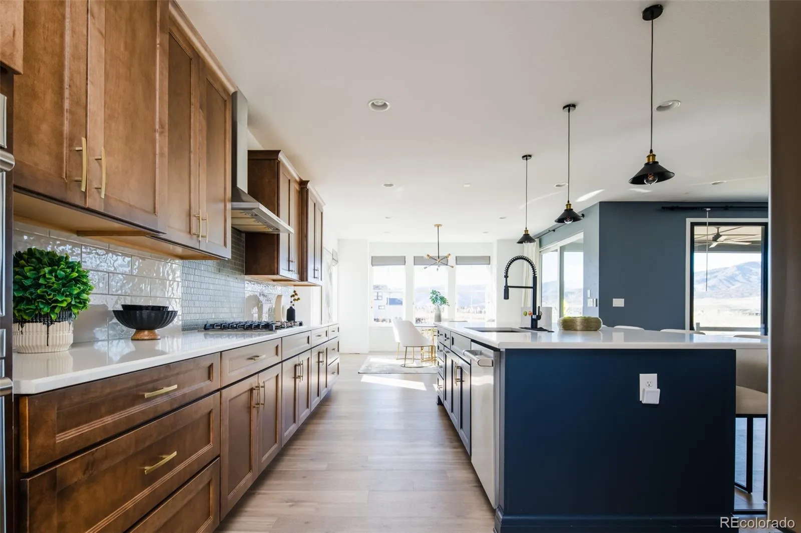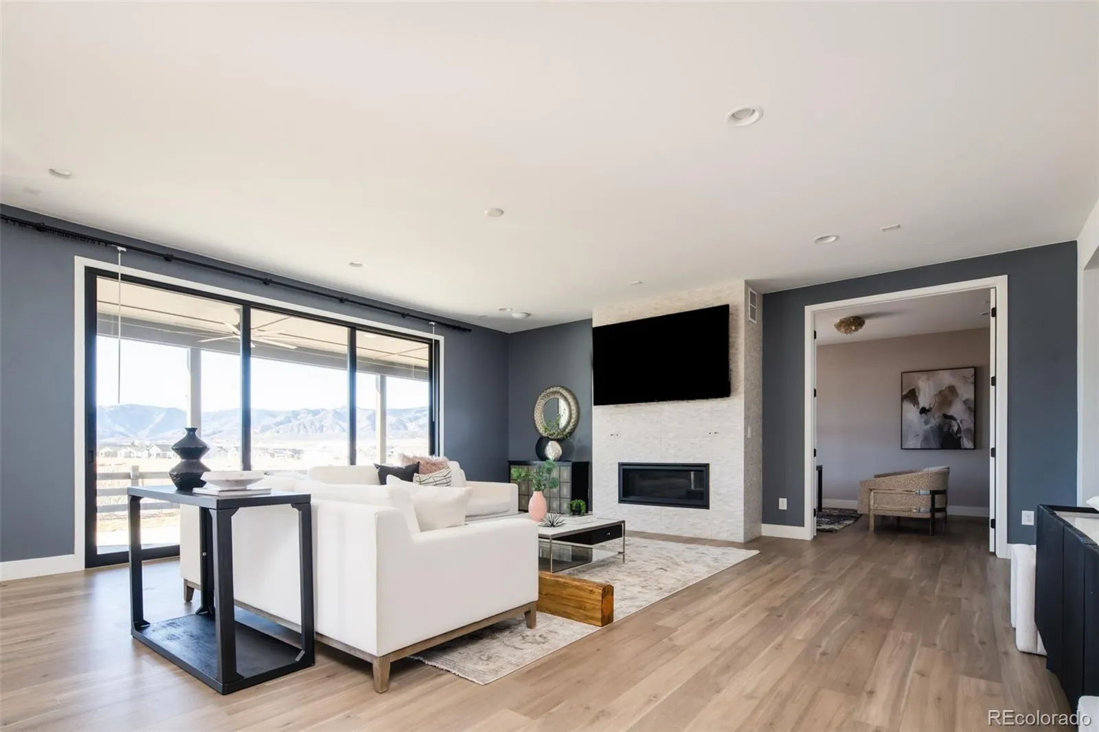 Situated near scenic parks and trails, this 5,243-sq-ft home is a stunning beauty with breathtaking views of The Foothills and Rocky Mountains sits on one of the largest lots in Solstice. Charming front and back porches capitalize on a desirable lot, while an outdoor space with a fire pit is perfectly positioned for picturesque relaxation with family and friends. Inside, an inviting foyer reveals a functional home office adorned with custom built-in shelving – ideal for work or study, as well as a ½-bath with decorative tile, before divulging a great room with fireplace and 3-panel glass door that opens onto an extended covered patio, featuring sunshade blinds, ceiling fans and a well-appointed cook station. Bordering the living room is an light flooded dining area, gourmet kitchen equipped with premium stainless-steel appliances, a center island with bar-height seating, massive pantry, and a wet bar with a beverage refrigerator. Steps from the kitchen is a convenient mudroom providing access to an expansive three-car garage. Upstairs, a spacious loft with vaulted ceiling enhances the home’s airy feel and gives way to a luxurious primary suite offering magnificent views, a generous walk-in closet and a spa-like ensuite with marble floors, a soothing soaker tub and a linen closet. A full-bath with double-sinks and a private shower/toilet area services two additional secondary bedrooms; as well as a laundry room with utility sink. The impressive basement features a large family room, 2 additional bedrooms and a ¾-bathroom. Residents of the award-winning Solstice Neighborhood enjoy exclusive access to a fully equipped fitness center and resort-style pool. Close proximity to Highline Canal and Chatfield State Park and Reservoir, as well as area retail, restaurants and more.