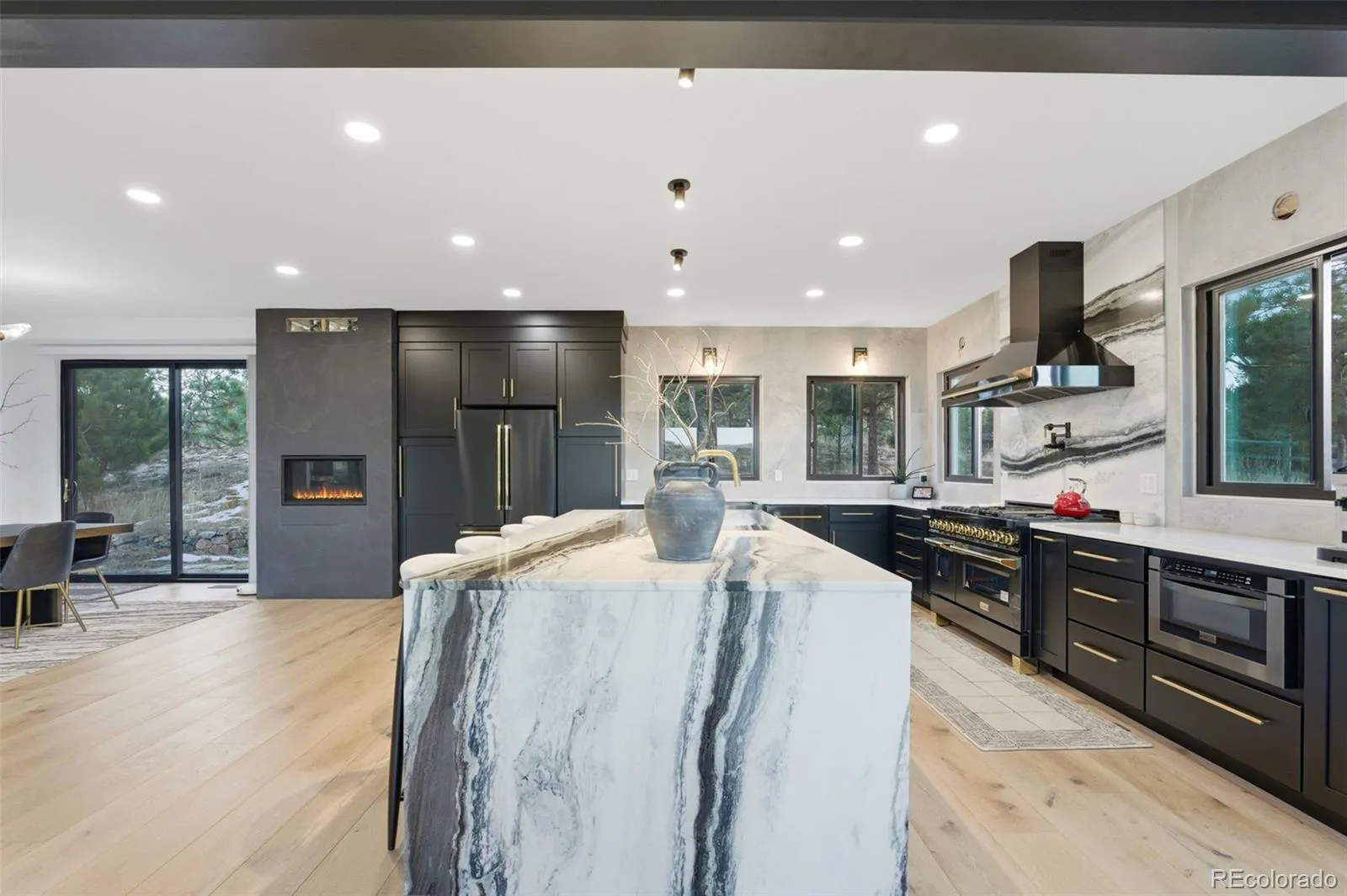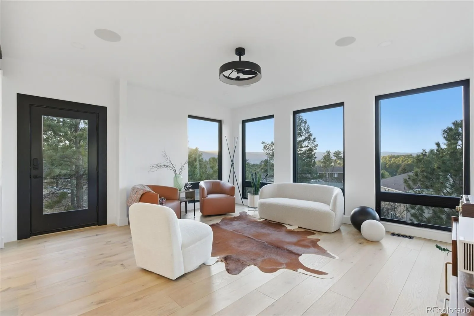 Once-in-a-lifetime opportunity to own a fully reimagined luxury mountain retreat, offered at an incredible value. This stunning property has been completely transformed with custom, designer-level finishes throughout. Every inch has been thoughtfully renovated, starting with the show-stopping modern kitchen featuring black ZLINE appliances, an 8-burner range with hood and pot filler, drawer microwave, wine refrigerator, and an extraordinary granite island with dramatic waterfall edges—truly the heart of the home. The open-concept main level blends rustic warmth with contemporary design, offering a formal living room, dining area, and flexible space ideal for entertaining, a home gym, or creative use. A powder bath and dedicated office with French doors and patio access complete the main floor, providing both functionality and style. Escape to the luxurious primary suite, where a Juliet balcony frames breathtaking views of Pikes Peak. The spa-like ensuite bath features heated polished marble floors, dual vanities, a soaking tub, walk-in closet, and a second Juliet balcony with sweeping panoramic views. The walk-out basement lives large and is designed for entertaining and relaxation, featuring a home theater with a level-5 finish projector screen, wet bar with granite countertops and ample storage, and an additional wine refrigerator. Two generously sized lower-level bedrooms—one with a massive walk-in closet—offer flexibility for guests, multigenerational living, or a growing family. Perched on a private 1.2-acre lot, this home offers space, privacy, and serenity, while still enjoying a close-knit community feel and quick access to I-25 for easy commutes to Denver, Castle Rock, or Colorado Springs. Outdoor recreation is abundant with nearby Fox Run Regional Park and Palmer Lake, offering fishing, hiking, biking, and paddleboarding just minutes away. Luxury mountain living, redefined—this is a rare opportunity you won’t want to miss.
