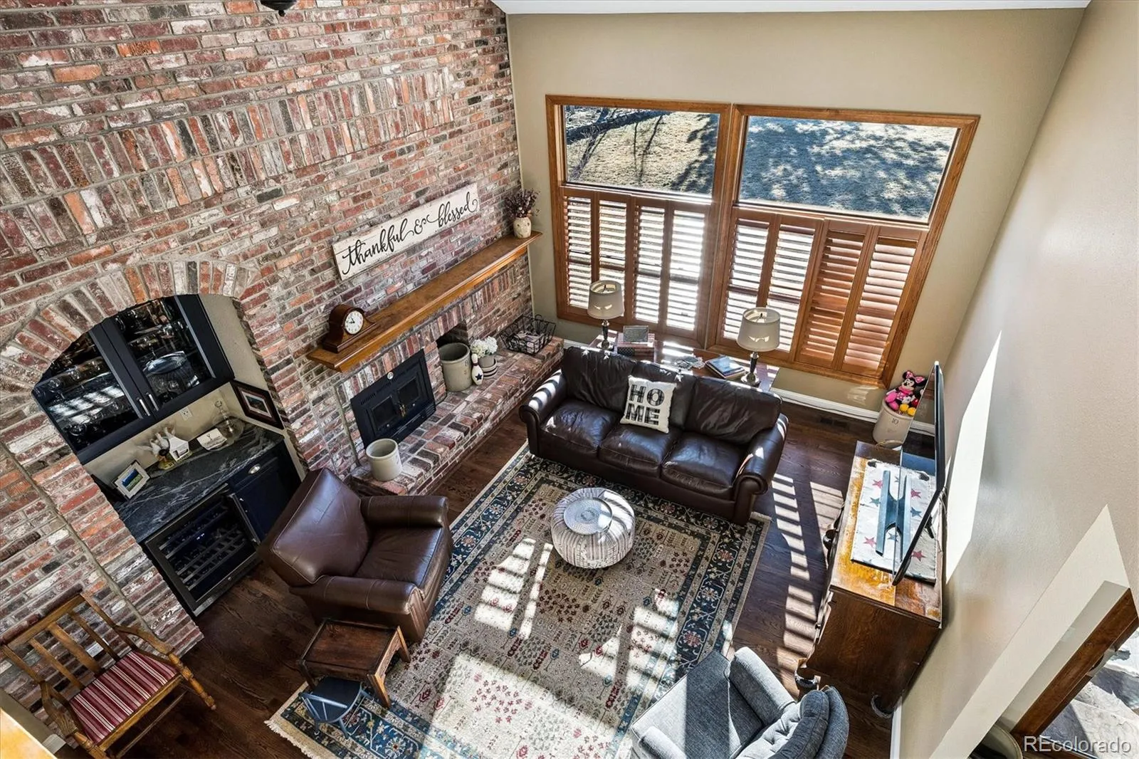 The vaulted family room features warm exposed brick, a cozy wood burning fireplace, and a custom wine bar with built in Avallon wine cooler(plumbing exists to convert to a wet bar) — the perfect gathering space. High-end oak hardwood flooring flows throughout the main floor of the home.