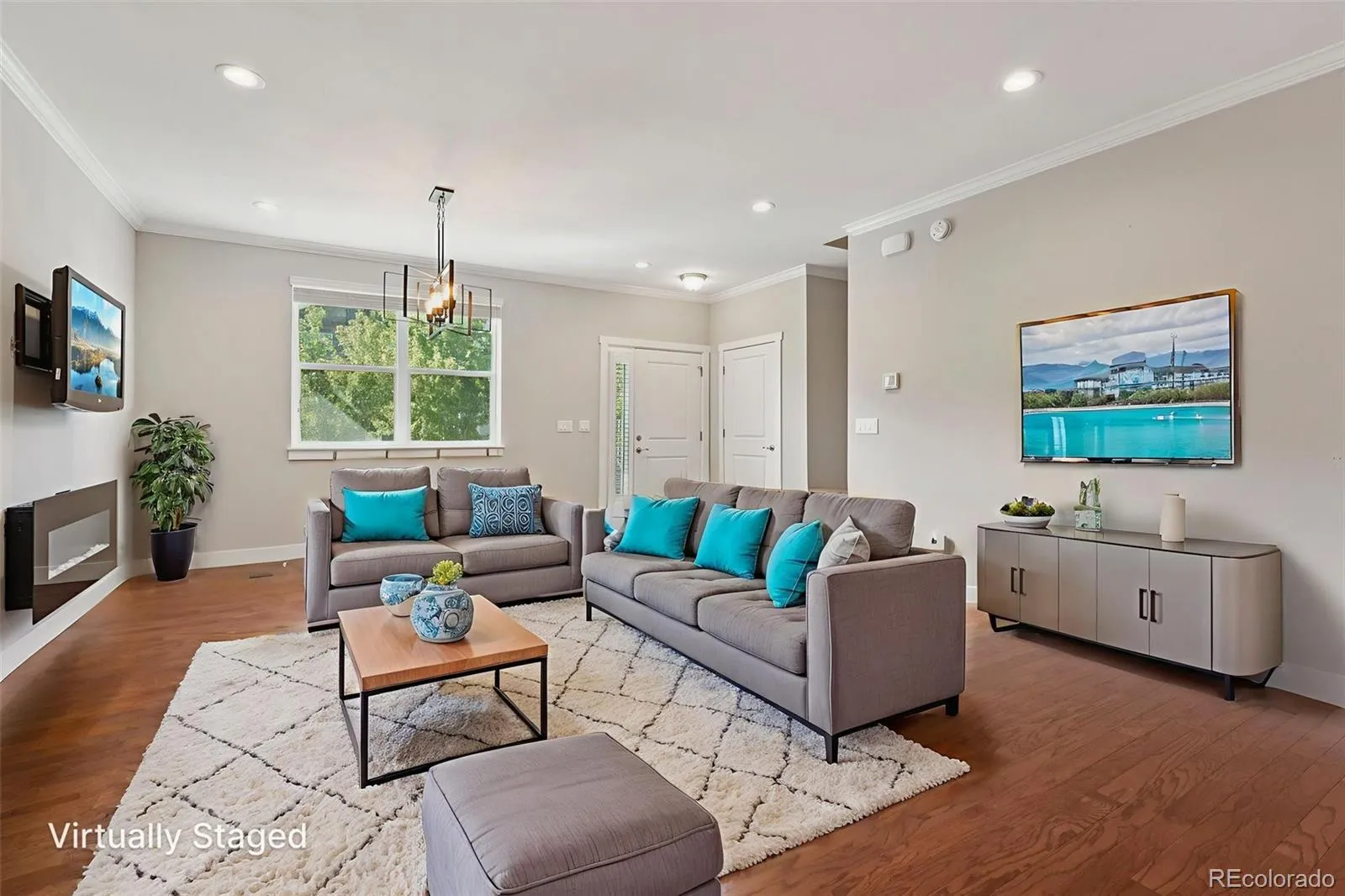 Step inside this modern townhome and immediately feel the pull of the Rocky Mountains right from your front door. Designed with unique touches not found elsewhere in the community, this home boasts an open, light-filled layout that feels both spacious and inviting. The chef’s kitchen is a showstopper with crisp white cabinets, a contrasting extended island, granite countertops, soft gray subway tile, matte-black designer lighting, and a stainless-steel farm-style sink and appliances. A custom double-door pantry keeps all your essentials organized and within reach. Warm hardwood floors flow across the main level while crown molding adds an extra touch of elegance. Thoughtful interior lighting on every floor keeps the space bright, and the modern electric fireplace makes cozy evenings effortless. Upstairs, choose between two incredible suites, each featuring large walk-in closets and spa-inspired bathrooms with upgraded tile and double vanities. Step out onto the upper-level balcony to soak in breathtaking mountain views or breeze through laundry in the conveniently located upstairs laundry room with built-in shelving. The finished basement with high ceilings and multiple windows provides a versatile space perfect as a third bedroom with an ensuite or a large recreation area. Enjoy crisp, clean water every day thanks to the advanced water filtration and softening system. With abundant storage and a two-car garage, there’s room for all your gear. Beyond your doorstep, the neighborhood offers excellent schools and direct access to the 23-acre Dry Creek Park, complete with trails, disc golf, picnic spots, playgrounds, and even a sledding hill. You’re also just minutes from shopping, dining, cinema, Whole Foods, and more, making this home the perfect blend of comfort, style, and convenience.