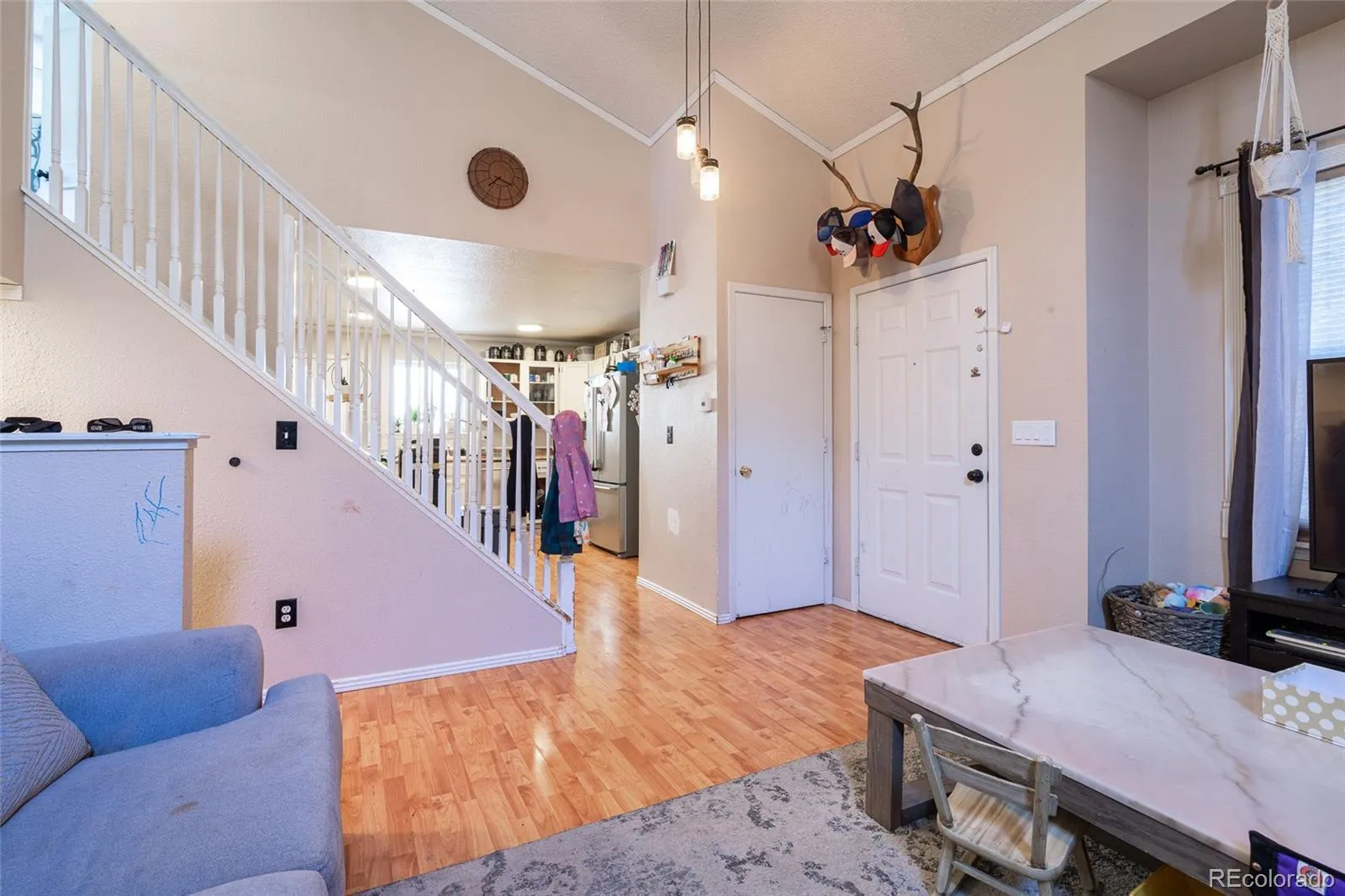 The main level features a living room, kitchen with a small dining area, and access to both the backyard and attached garage. The upper level offers two bedrooms and a full bath. The lower level includes a flexible living area with a fireplace, a 3/4 bath, laundry area, and direct access to the yard. This level is currently being used as the primary bedroom.