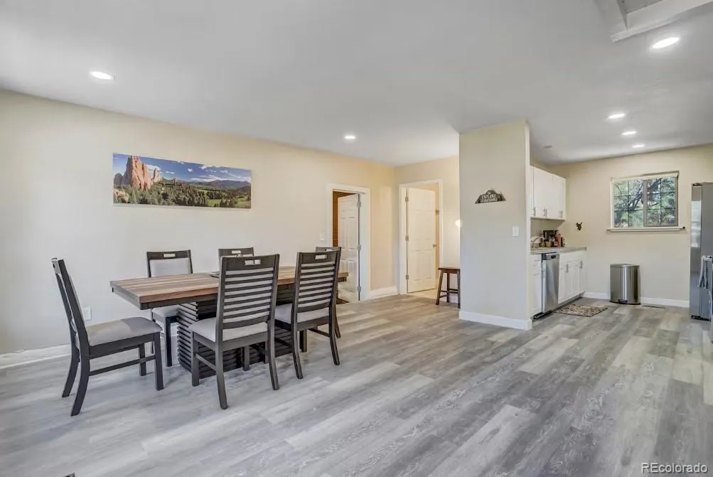 Outdoor living is a standout feature, highlighted by a large, sectioned backyard perfect for yard games, gatherings, or simply soaking up the Colorado sunshine. A six-seat outdoor dining table enhances the alfresco experience, and the property’s forested surroundings provide beautiful seasonal views and a peaceful retreat feel.