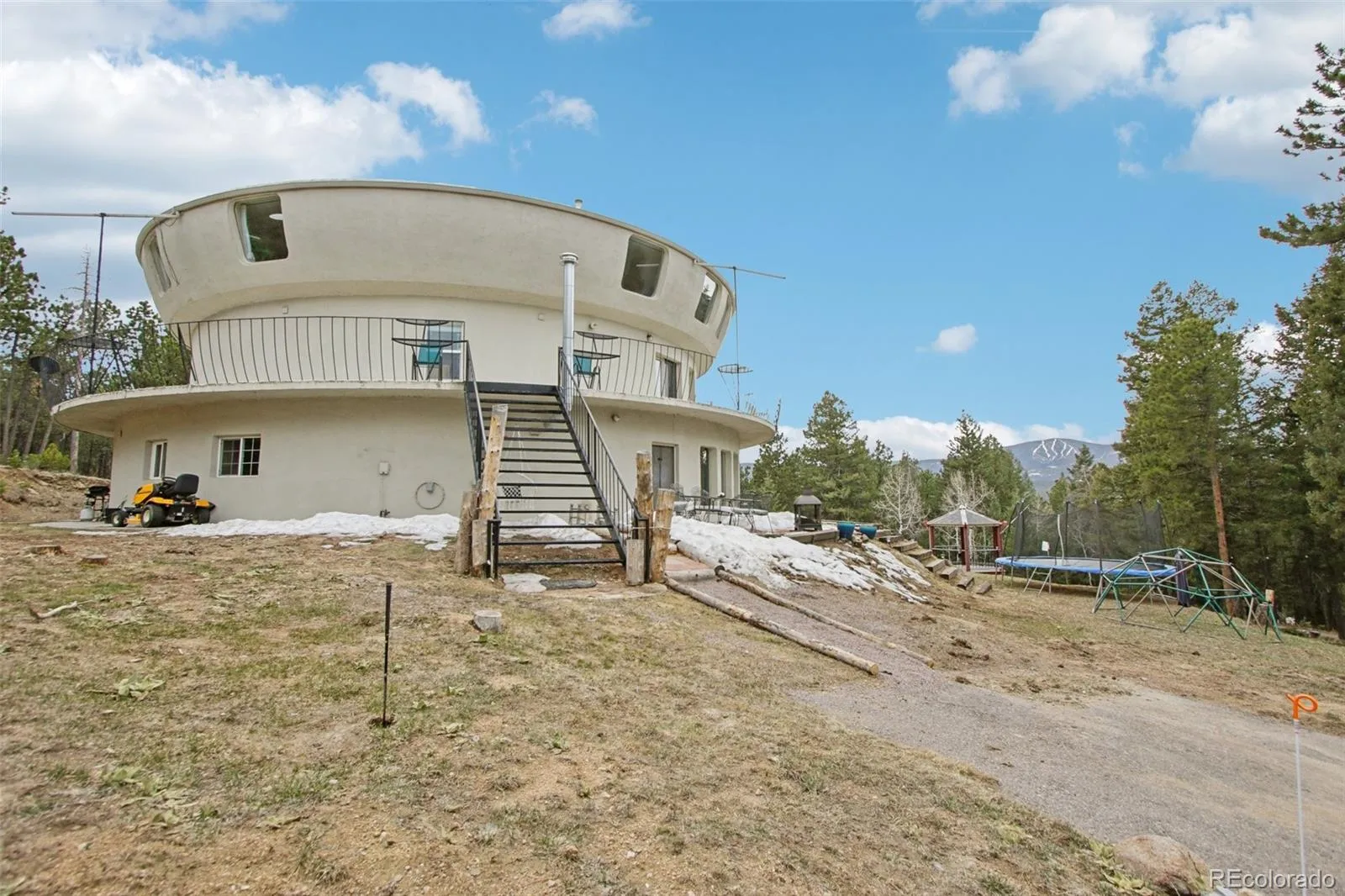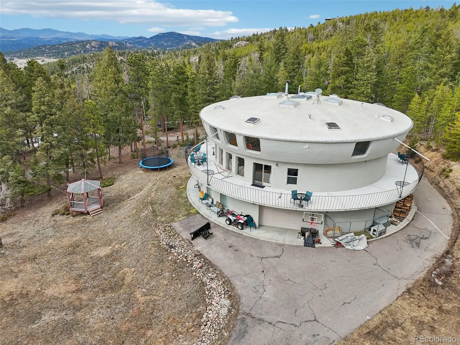 Perched at the highest point of Evergreen Meadows, this custom-built circular showpiece is more than a home; it is a private mountain sanctuary. Spanning over 6,000 square feet of living space, this residence sits on a prime 3.2-acre lot that borders 1,000 acres of Mountain Parks open space with direct, unobstructed views of Mt. Evans from every single window. Designed for large-scale entertaining & everyday comfort, the chef’s kitchen features a massive granite island with a breakfast bar, an 8-burner gas stove with a professional hood, & four ovens including Jenn-Air & KitchenAid double sets, along with dual warming drawers & a deep undermount sink. The home features a custom circular staircase connecting three levels, offering privacy & flexibility and making it ideal for multigenerational living, extended stays, or guests. The second floor includes a spacious family room with a curved wall of windows, a fireplace, & wet bar, while the expansive 360-degree wrap-around balcony delivers breathtaking mountain air & views. The third level offers a light-filled space with a private sauna & kitchenette that can function as an entertainment area, guest retreat, or additional living space, & is easily adaptable into an atrium, home gym, studio, or other flexible use depending on the next owner’s vision. With primary suites located on both the main & third levels, the layout allows for comfortable separation of space while remaining connected. Built with peace of mind in mind, the home features fire-resistant construction. The beautifully wooded lot offers usable, gently sloping land with a gazebo, no HOA, & the freedom to enjoy your property as you choose. Additional highlights include an oversized two-car garage & unlimited parking throughout the property, all just 25 minutes to C-470 & 35 minutes to Denver while feeling a world away.