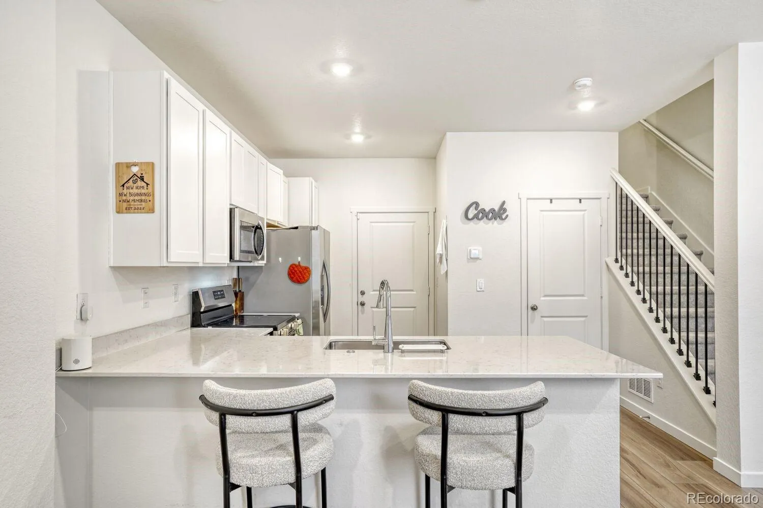Move-in ready! Built in 2024, this beautifully designed 2-bedroom, 2-bath townhome offers modern style, thoughtful upgrades, and low-maintenance living. The open main level is filled with natural light and contemporary finishes. The spacious kitchen features crisp white cabinets, quartz countertops, stainless steel appliances, and a large island with seating, perfect for everyday living and entertaining. Upstairs, the primary suite provides a peaceful retreat with a walk-in closet and a private en-suite 3/4 bath featuring double sinks for added comfort and convenience. A second bedroom and full bath offer great flexibility for guests, a roommate, or a home office, and convenient upstairs laundry adds ease and function. Enjoy your private front patio and the benefits of a newer build with modern systems and owned solar panels for lower energy costs. An attached 1-car garage provides secure parking and extra storage. Located in a desirable Arvada neighborhood close to parks, trails, shopping, dining, and everyday conveniences, this home offers the perfect blend of comfort and location. Be sure to view the 3D virtual tour for an interactive walkthrough experience! Don’t miss this turnkey opportunity!