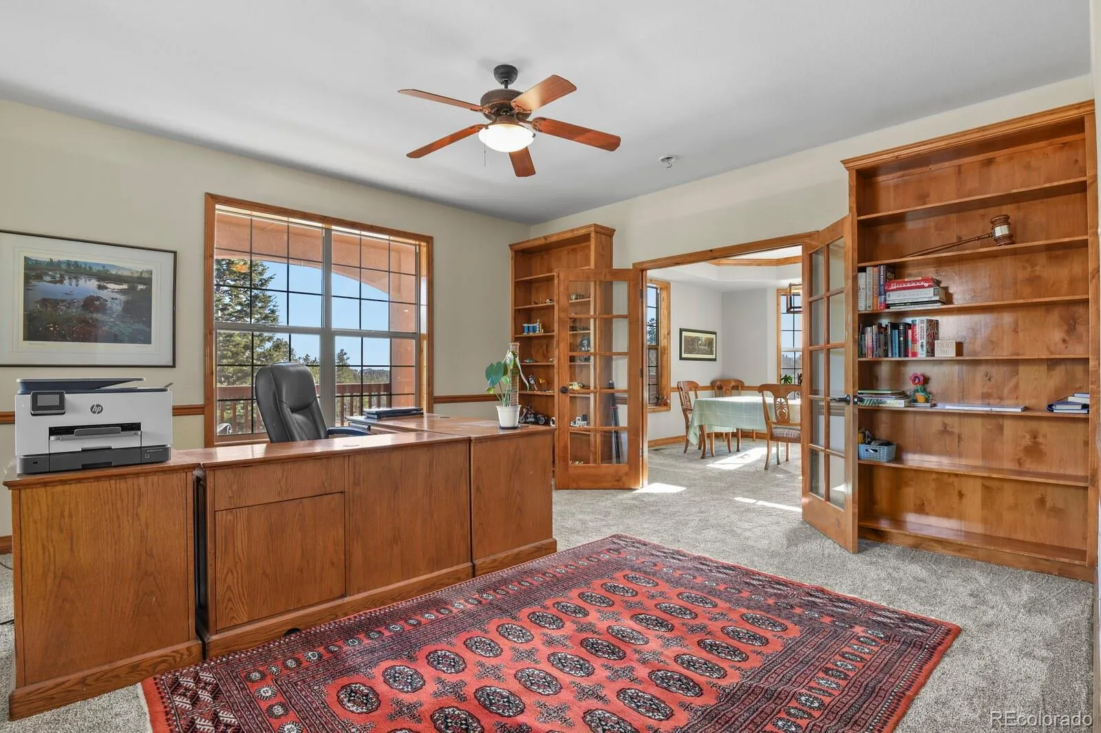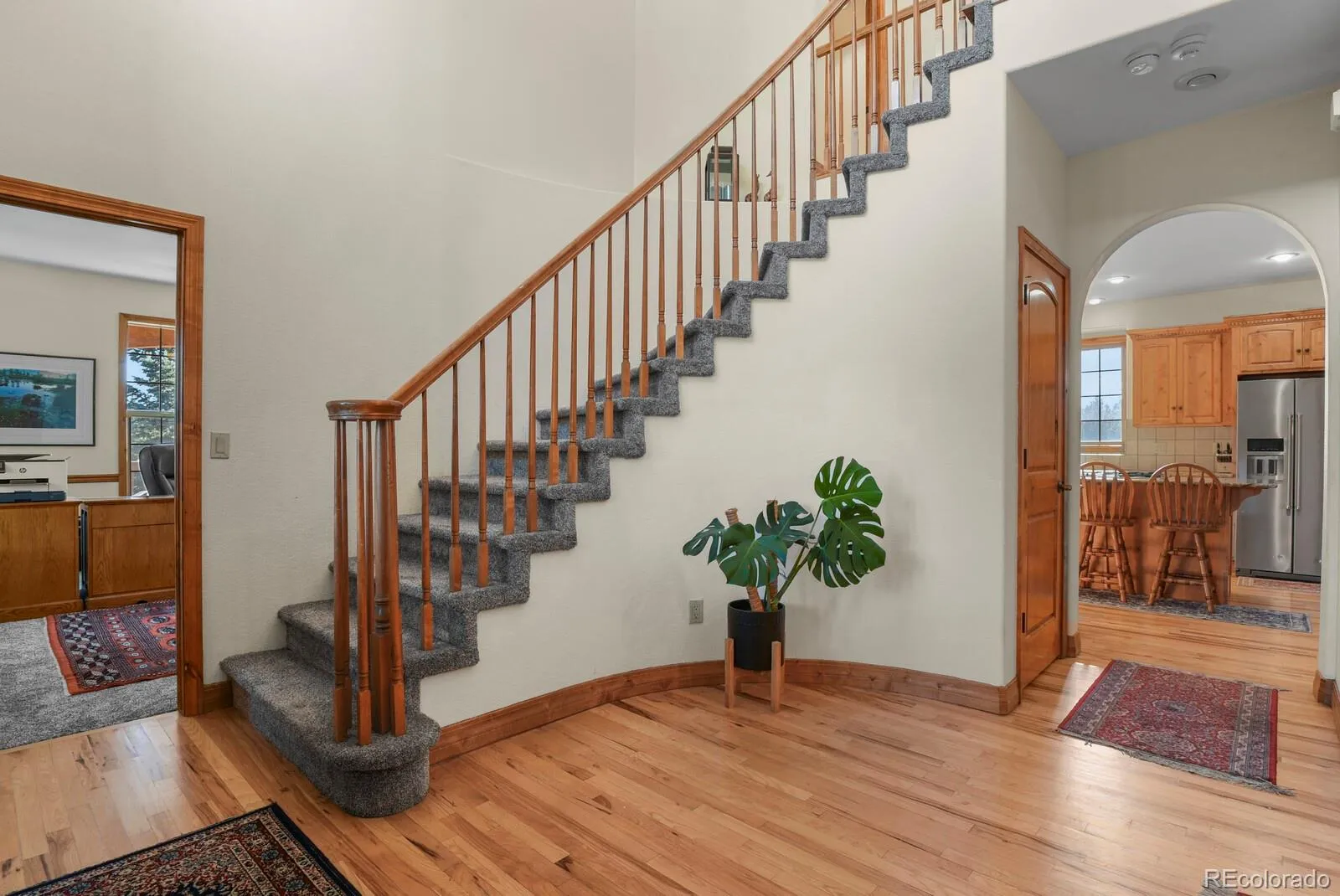 Welcome to 17255 Lamplight Drive, an exceptional residence in the highly sought after Timberview neighborhood. Offering refined living on a rare 0.86 acre corner lot surrounded by mature pine trees and mountain views, all with the convenience of public water and sewer. This six bedroom, four bath home is thoughtfully designed for both comfort and functionality, featuring four bedrooms on the upper level and two additional bedrooms in the walk out basement. A dramatic two story foyer welcomes you into the home, setting the tone for the formal dining room and a private office with French doors and custom built in shelving. Mountain views are enjoyed from the kitchen, dining room, living room, wraparound deck, primary en suite bathroom, laundry room, and one upstairs bedroom, creating a constant connection to Colorado’s natural beauty. The upper level includes a serene primary suite with high ceilings, en suite bath and walk in closet. The upper level also offers a conveniently located laundry room. The walk out basement offers exceptional versatility with two additional bedrooms, a full bath, and an inviting living area with fireplace and wet bar, ping pong table included along with a bedroom outfitted with a projector and theater screen. Outdoor living is elevated with a built in pizza oven on the walk out patio and a wraparound deck extending from the front entry to the kitchen, ideal for entertaining and enjoying the views. Recent upgrades include new carpet on the main and upper levels, fresh interior paint, refreshed lighting in the kitchen and dining rooms, new paint on the entire deck, and new seal coating on the driveway. This home represents a rare opportunity to own a beautiful property offering space, privacy, and timeless Colorado elegance in a very low inventory community.