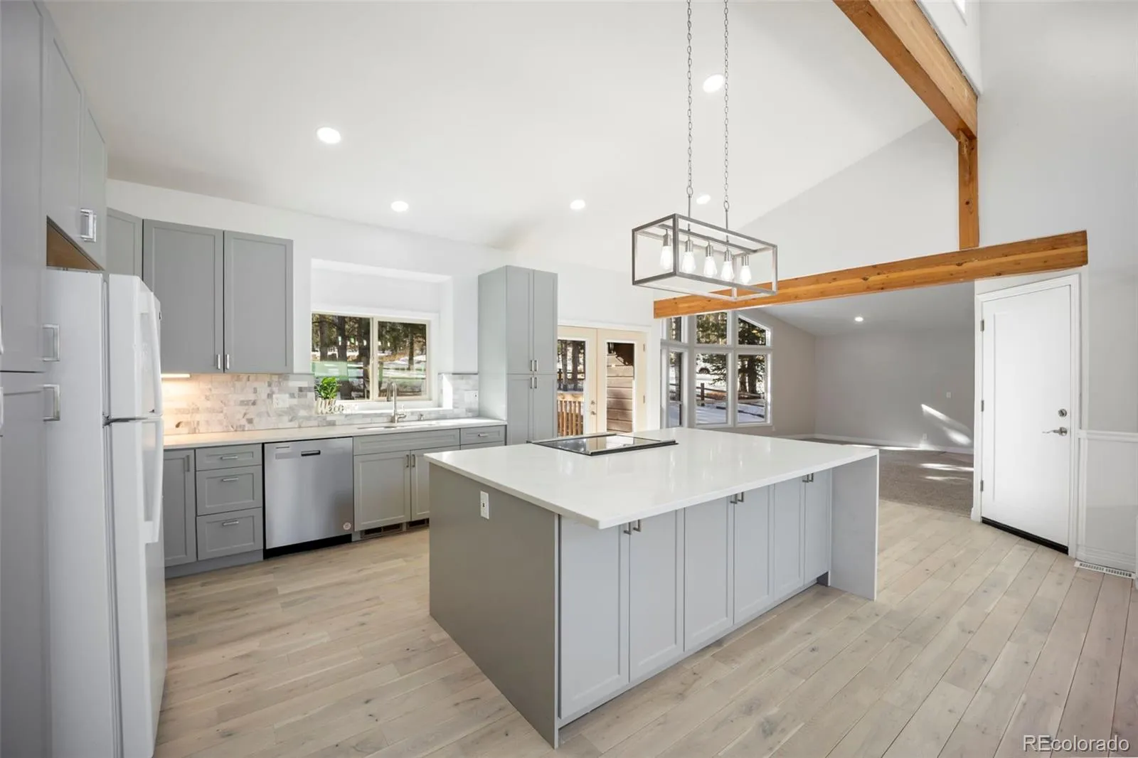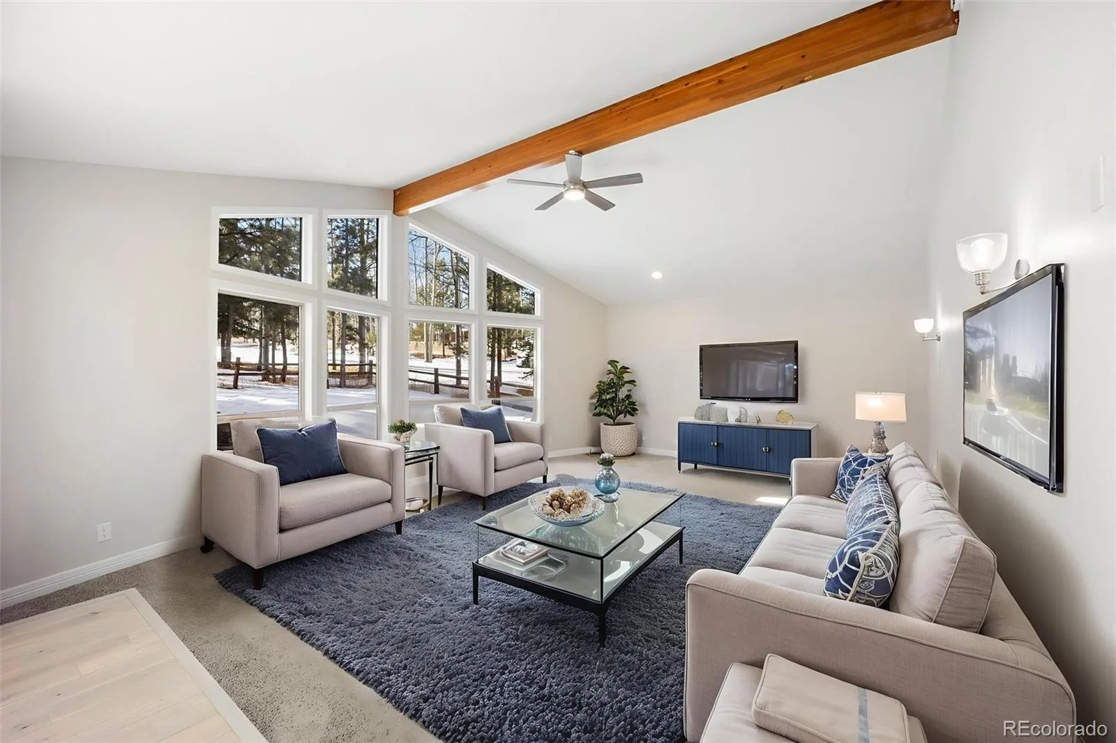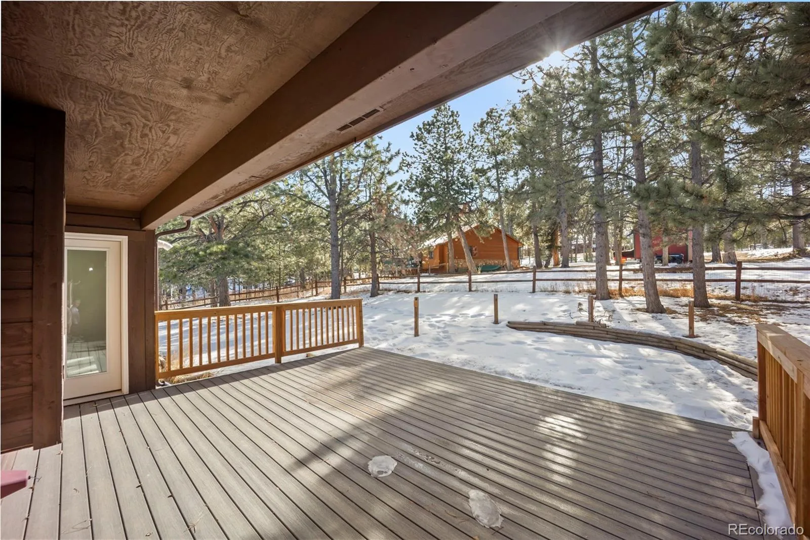 Welcome to mountain living done right in the highly desirable Westwood Lakes community. Set on a spacious corner lot surrounded by mature trees, this beautifully updated home offers the perfect blend of modern comfort and Colorado mountain charm. Originally built in 1993, the home has been thoughtfully reimagined to suit today’s lifestyle. A refined, semi-open floor plan creates an easy flow between living, dining, and kitchen spaces, all filled with natural light from expansive windows and vaulted ceilings. The stunning kitchen anchors the home with quartz countertops, updated cabinetry, and warm wood flooring, making it equally suited for quiet mornings or lively gatherings. The main level features three bedrooms, including a serene primary suite with a private ensuite bath—your own retreat after a day on the trails. Downstairs, the fully renovated basement expands your living options with two additional bedrooms, a dedicated office, and flexible space perfect for guests, hobbies, or work-from-home life. Recent upgrades provide peace of mind and true move-in readiness, including a new roof and furnace (2024), on-demand water heater, fresh paint, updated windows, and brand-new Trex decks in both the front and back—ideal for morning coffee, evening sunsets, or entertaining under the pines. Whether you’re looking for full-time mountain living or a refined escape from the city, this home delivers comfort, style, and a lifestyle that invites you to slow down, breathe deep, and enjoy everything Woodland Park has to offer. Nothing to do but move in and start living.