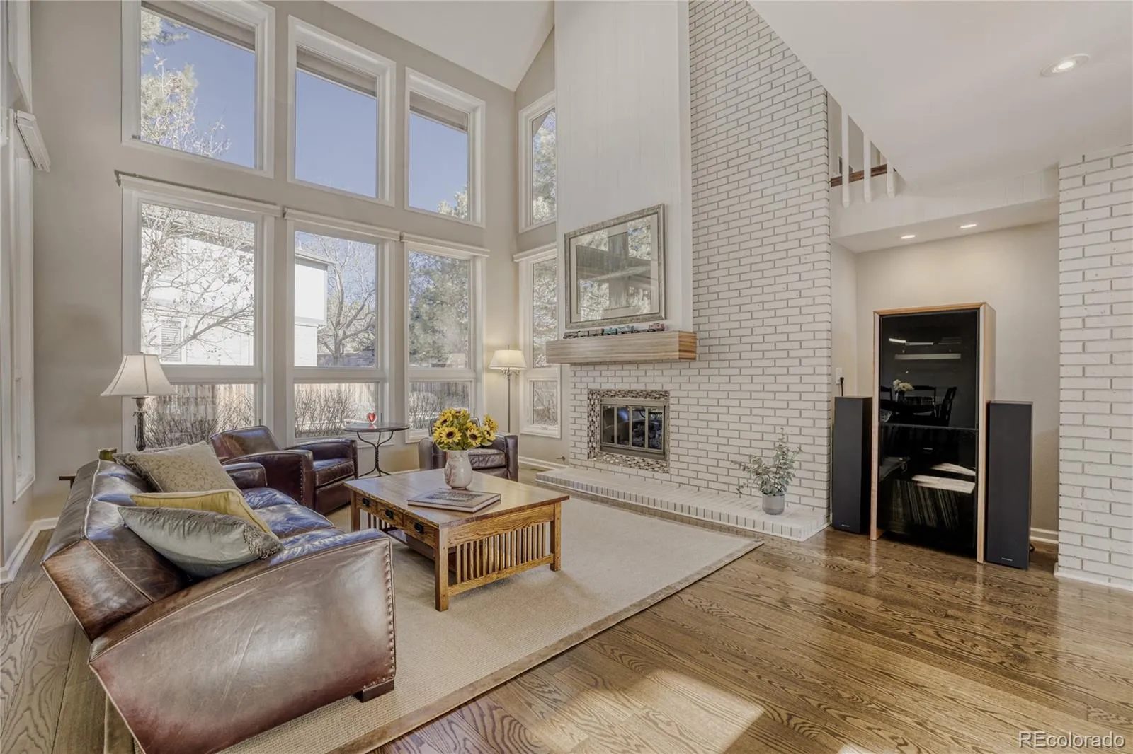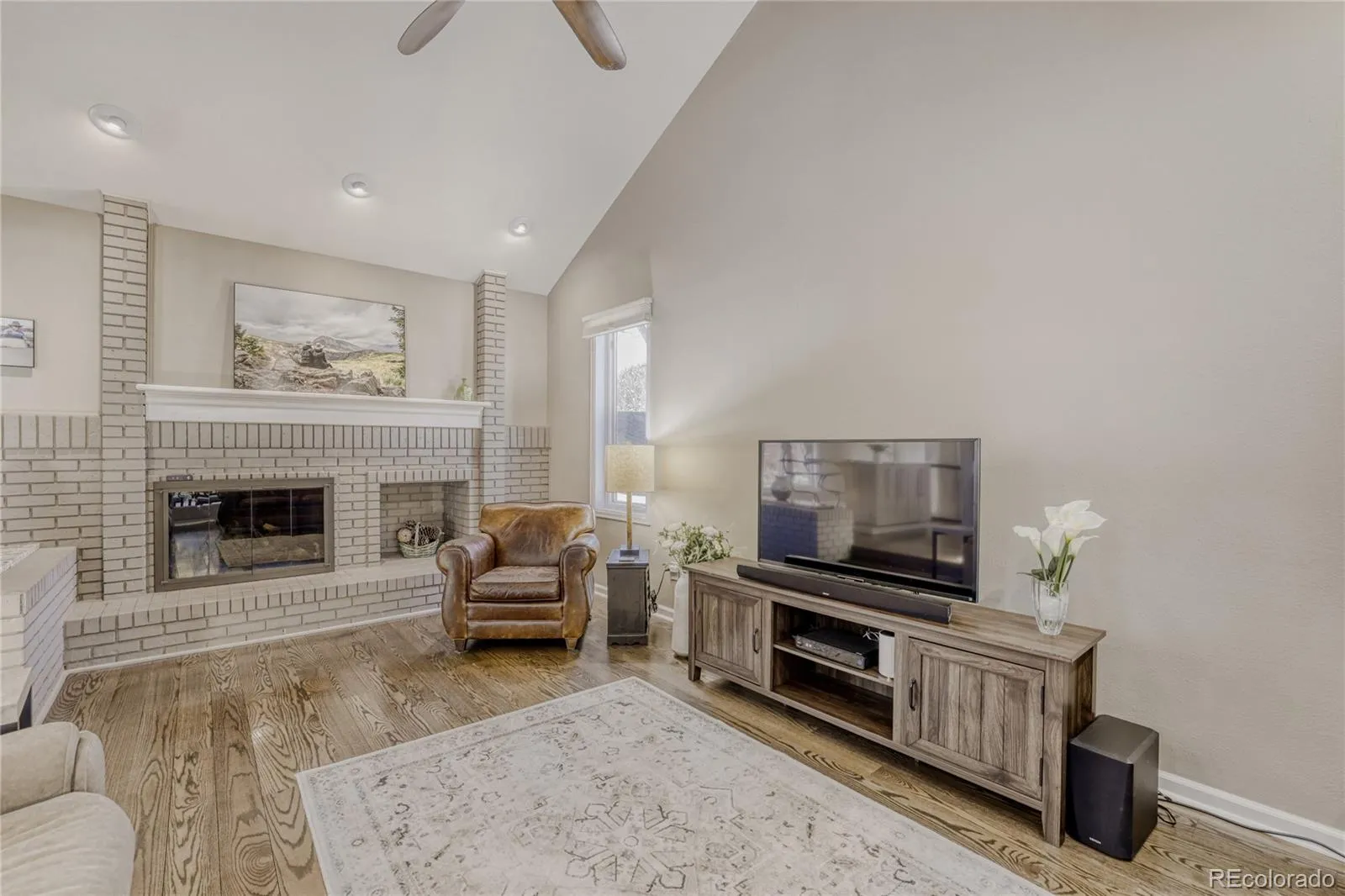 Vaulted ceilings, expansive windows, and an open, flowing floor plan fill the interior with natural light throughout. The thoughtfully designed kitchen connects seamlessly to both the formal dining room and a sunny breakfast area, overlooking the beautifully landscaped, park-like backyard. The inviting family room features a dramatic vaulted ceiling and striking brick accent wall with a wood-burning fireplace, creating a warm and elegant gathering space that opens directly to the outdoor patio.