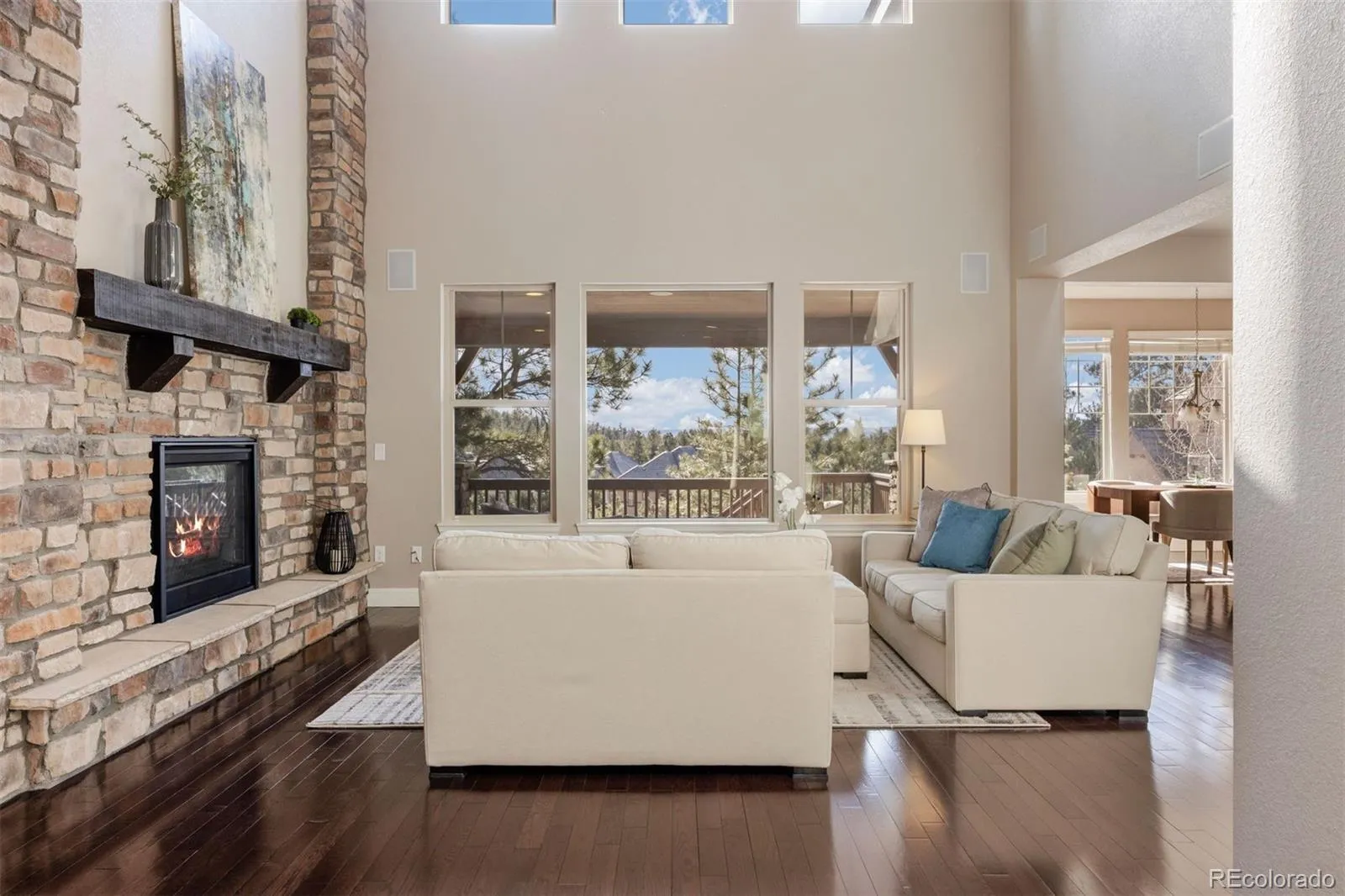 Set within the gates of the prestigious Village at Castle Pines neighborhood, this exceptional 4 bedroom | 5 bathroom residence offers open-concept living framed by coveted mountain views. With quick I-25 access just minutes to Gate 2, the location of this home balances convenience with the privacy and security that define this community. On entering, expansive windows capture the peaks beyond, while a clean, light-filled aesthetic creates an atmosphere that feels both current and enduring. Soaring ceilings with exposed wood beams elevate the great room, where a stone fireplace anchors the space with warmth and presence. The kitchen is designed for entertaining and family gatherings, featuring rich espresso cabinetry, granite counters, a generous island, and an appliance suite with double ovens and a gas cooktop. A sunlit breakfast nook transitions seamlessly to the covered Trex deck, where mountain views, cliffside scenery, and mature pines provide a welcome outdoor setting. A sizable dining room sits off the entry, and the main level also includes a flexible bedroom, (currently used as an office) with an en suite full bathroom, ideal for guests or multigenerational living. A well-placed powder room and 3-car garage complete this floor. Upstairs, a spacious loft offers versatile living space for a media lounge or retreat. The primary suite features vaulted ceilings, expansive windows with mountain views, and a large bathroom with dual vanities, soaking tub, and glass-enclosed shower. Two additional en suite bedrooms and an upper level laundry room complete this level. Downstairs, a large, unfinished basement presents exceptional potential for future expansion, equity development, storage, and customization. Simply put, this home represents a well-priced entry point into the Village at Castle Pines, where residents enjoy 24-hour gated security, pools, tennis courts, fitness facilities, miles of scenic trails, and much more!