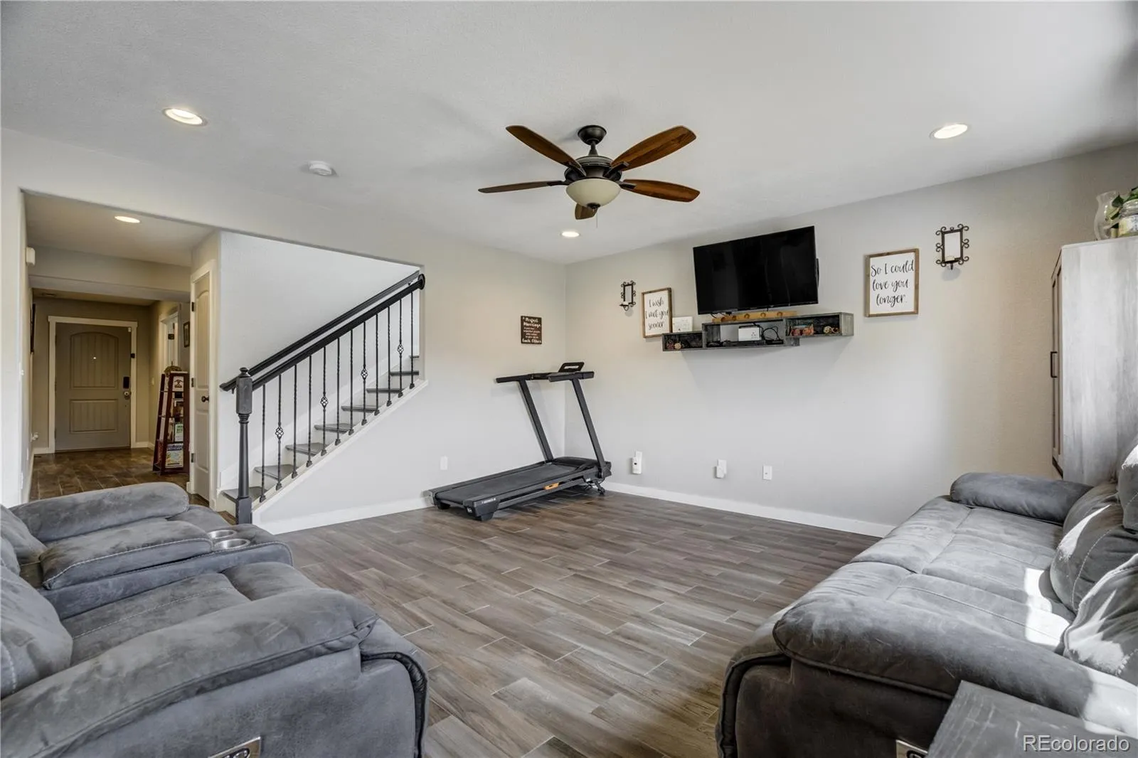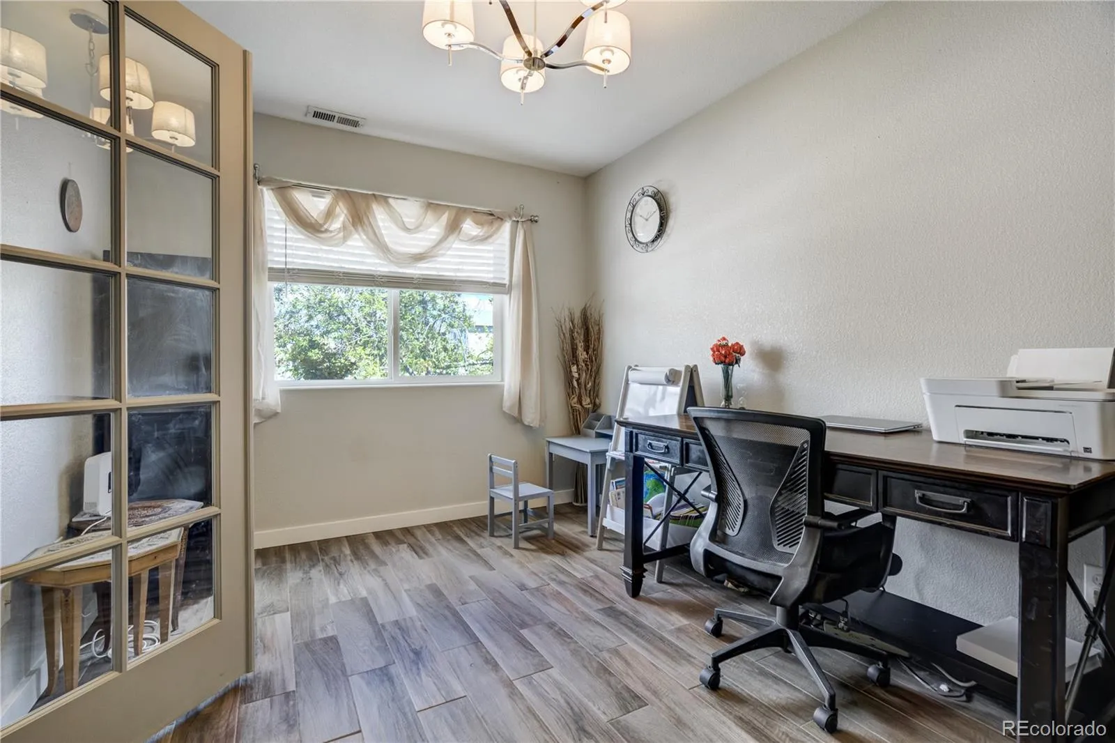 haven of effortless living, where stylish wood-look tile flows seamlessly throughout the main level. A dedicated office