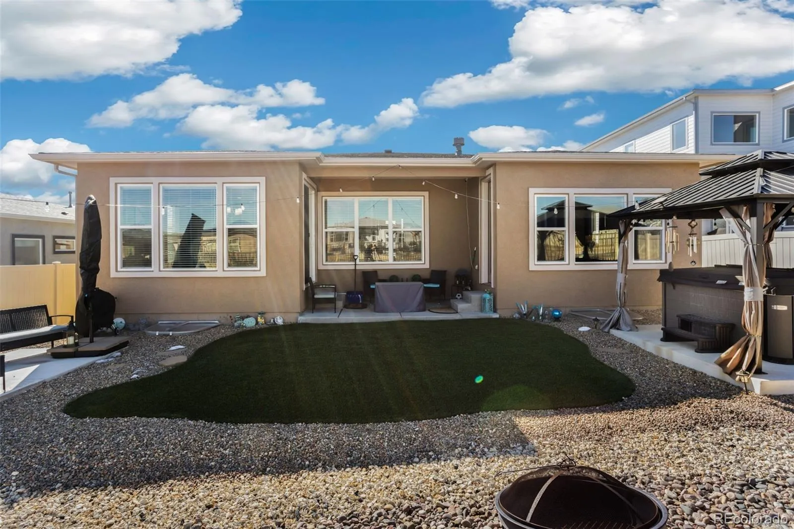 Built in 2021, this well-designed 4-bedroom, 3.5-bath home offers modern finishes, a smart layout, and exceptional flexibility. The main level features two private en suite bedrooms, including a spacious primary suite, making it ideal for multi-generational living or guests. A cozy living room with a gas fireplace anchors the open-concept living space, while the bright kitchen offers abundant natural light and an easy flow for everyday living and entertaining. A convenient mudroom with laundry sits just off the attached 2-car garage, another 1 -car garage attached on the other side, and a half bath completes the main floor. The finished basement adds two additional bedrooms, a full bathroom, and a versatile flex space perfect for a home office or gym. A full wet bar—complete with refrigerator and dishwasher—creates the perfect setup for movie nights, game days, or entertaining, with plenty of room to spread out and relax. Outside, enjoy a low-maintenance xeriscaped and turf backyard designed for entertaining or unwinding in a spa tub. Residents enjoy access to both community clubhouses and amenities, along with a golf course, shopping, and restaurants nearby. A newer home with a rare dual–main-level en suite layout, ample space, and an unbeatable combination of comfort and convenience.