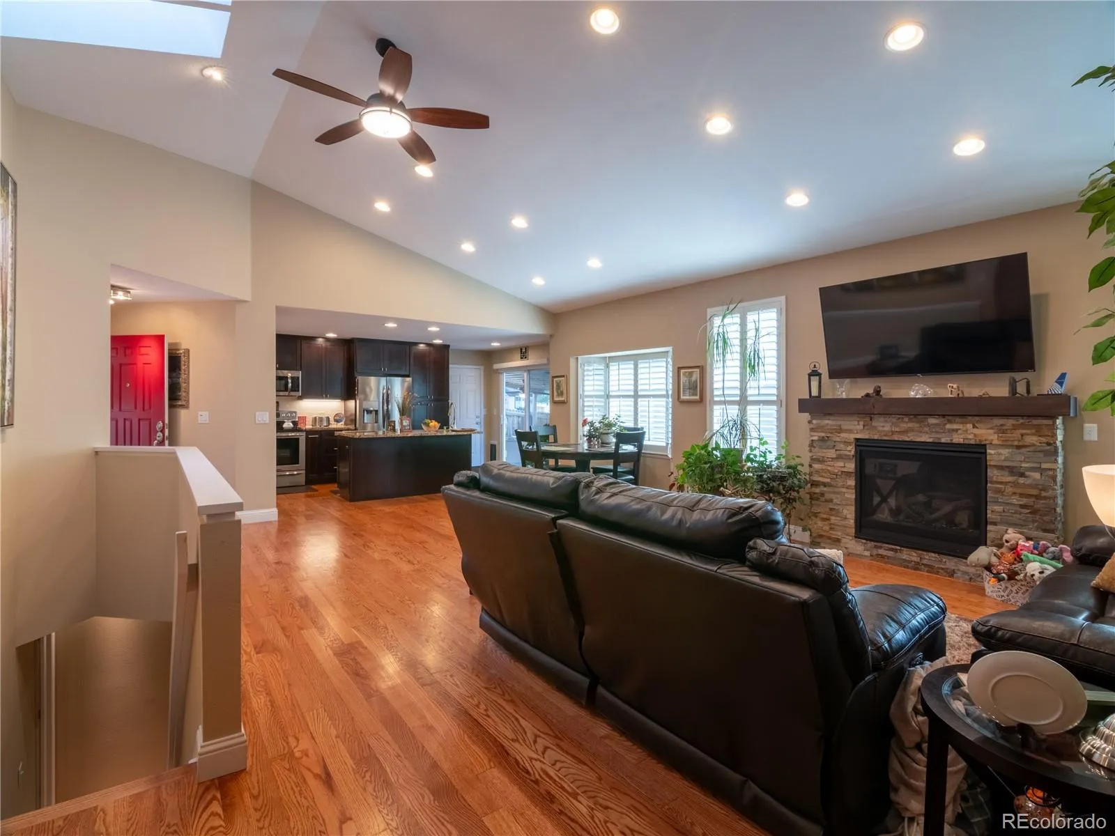 Completely remodeled ranch-style home with an open floorplan featuring a living room with fireplace and adjoining dining area, accented by plantation shutters, ceiling fan, bright skylights, and hardwood floors. Sunny kitchen offers wood flooring, stainless steel appliances, a granite island, and easy access to the outdoor patio for summertime entertaining.