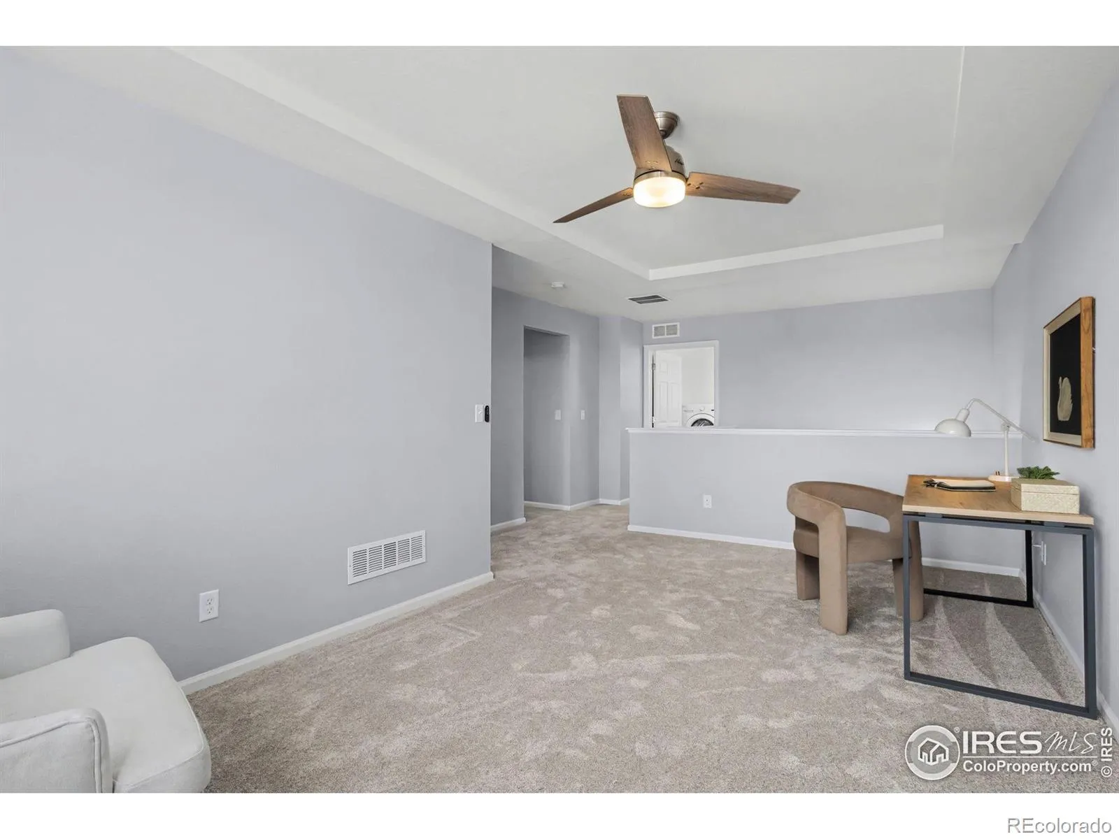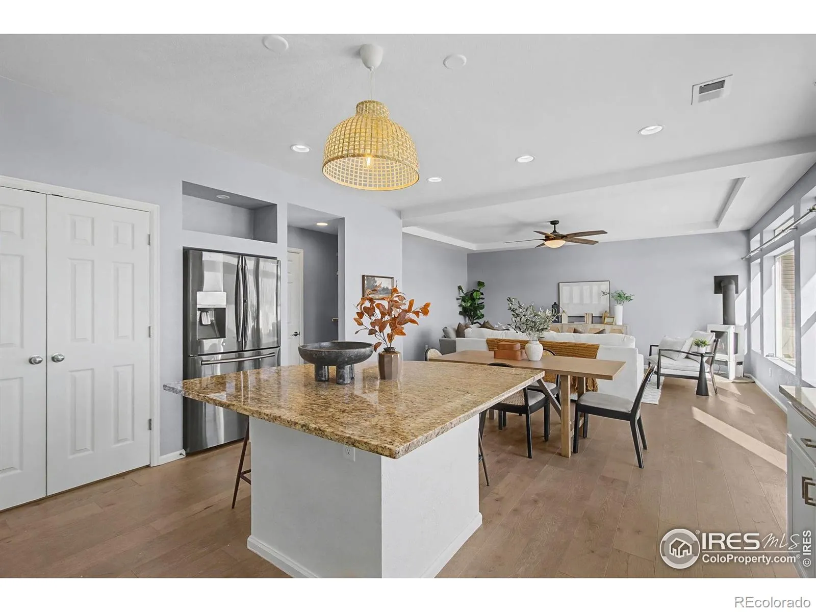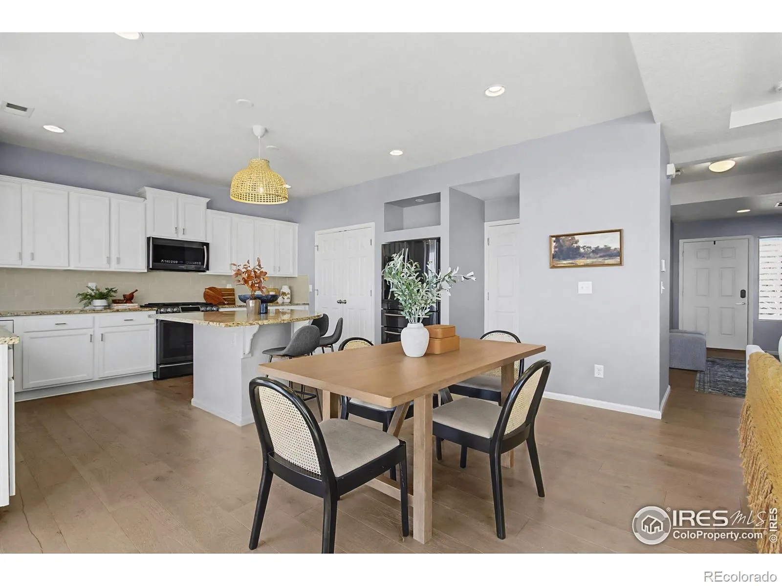 Updated two-story home with open floor plan and refined architectural details throughout. The main level features engineered hardwood flooring, abundant natural light, and a seamless flow between kitchen, dining, and living areas. The kitchen offers a large island, stainless-steel appliances, ample counter space, and modern finishes, while a gas fireplace anchors the living room. The upper level boasts brand-new carpet, a primary suite with ensuite, two additional bedrooms, a full bath, a flexible bonus room for office or media, and upper-level laundry for added convenience. An unfinished basement provides room for future expansion. Enjoy an oversized backyard backing to open space with no rear neighbors and a large patio. Additional highlights include an owned solar system, concrete tile roof, and EV-ready 240V garage outlet. Conveniently located near I-25, shopping, dining, and community amenities including pools, clubhouse, trails, and parks. Home has been pre-inspected for peace of mind.