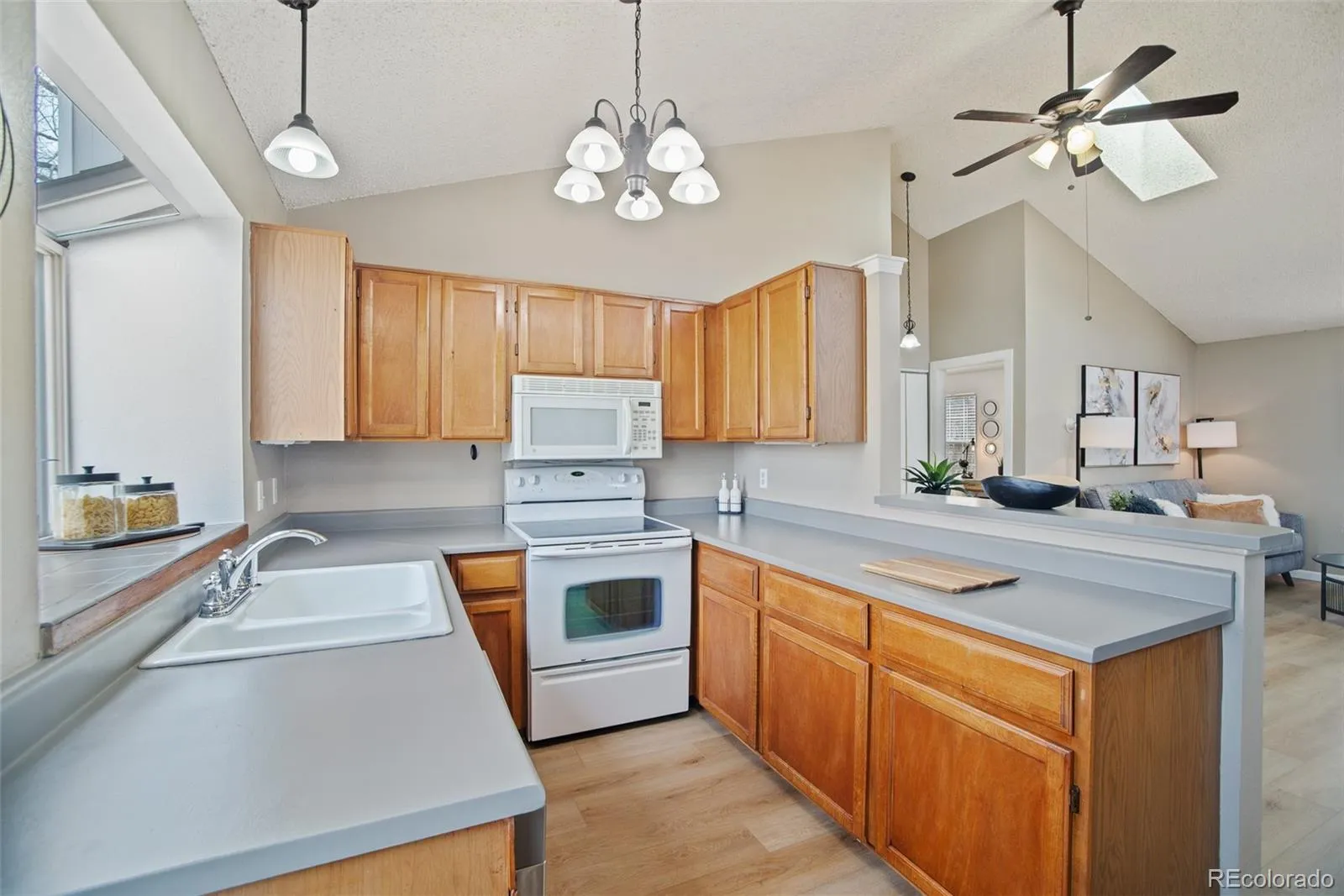 Rare opportunity to own a 2-bedroom, 1-bath end-unit ranch townhome in the desirable Dakota Station community of Littleton. With no neighbors above or below, vaulted ceilings, skylights, and bay windows, this home lives bright, open, and private. The spacious 21×15 living room features soaring ceilings, two skylights, a designer diagonal wood fireplace, and abundant natural light. Enjoy new luxury waterproof/scratch-resistant flooring, newer stackable washer/dryer, newer dishwasher, updated lighting, and all appliances included.