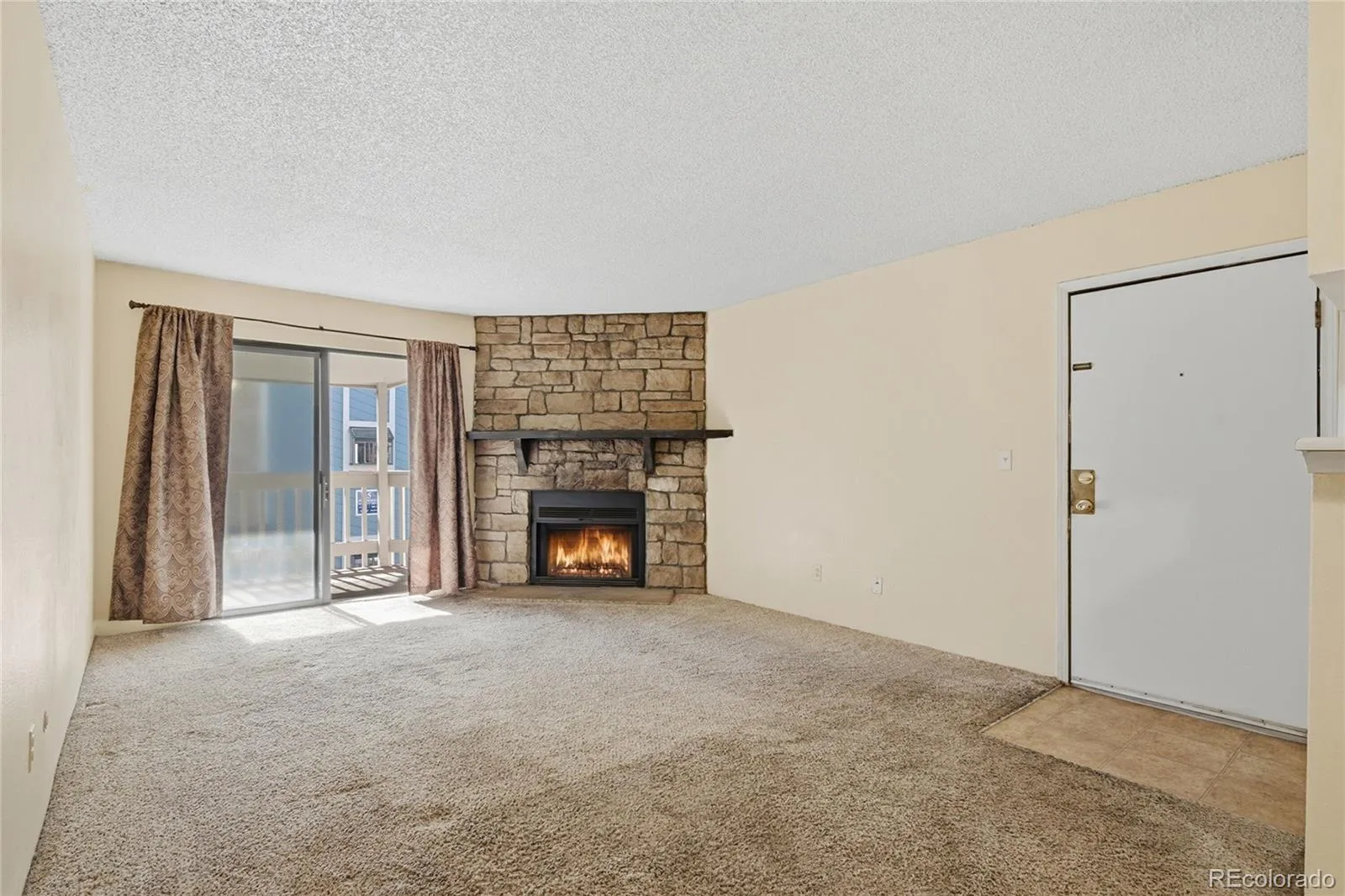 Inside, the living room features a stone fireplace and carpet flooring. The kitchen is equipped with appliances, light countertops, and wood finish cabinetry. The bedroom provides a spacious walk-in closet, while the bathroom is designed with a combined tub/shower for convenience.