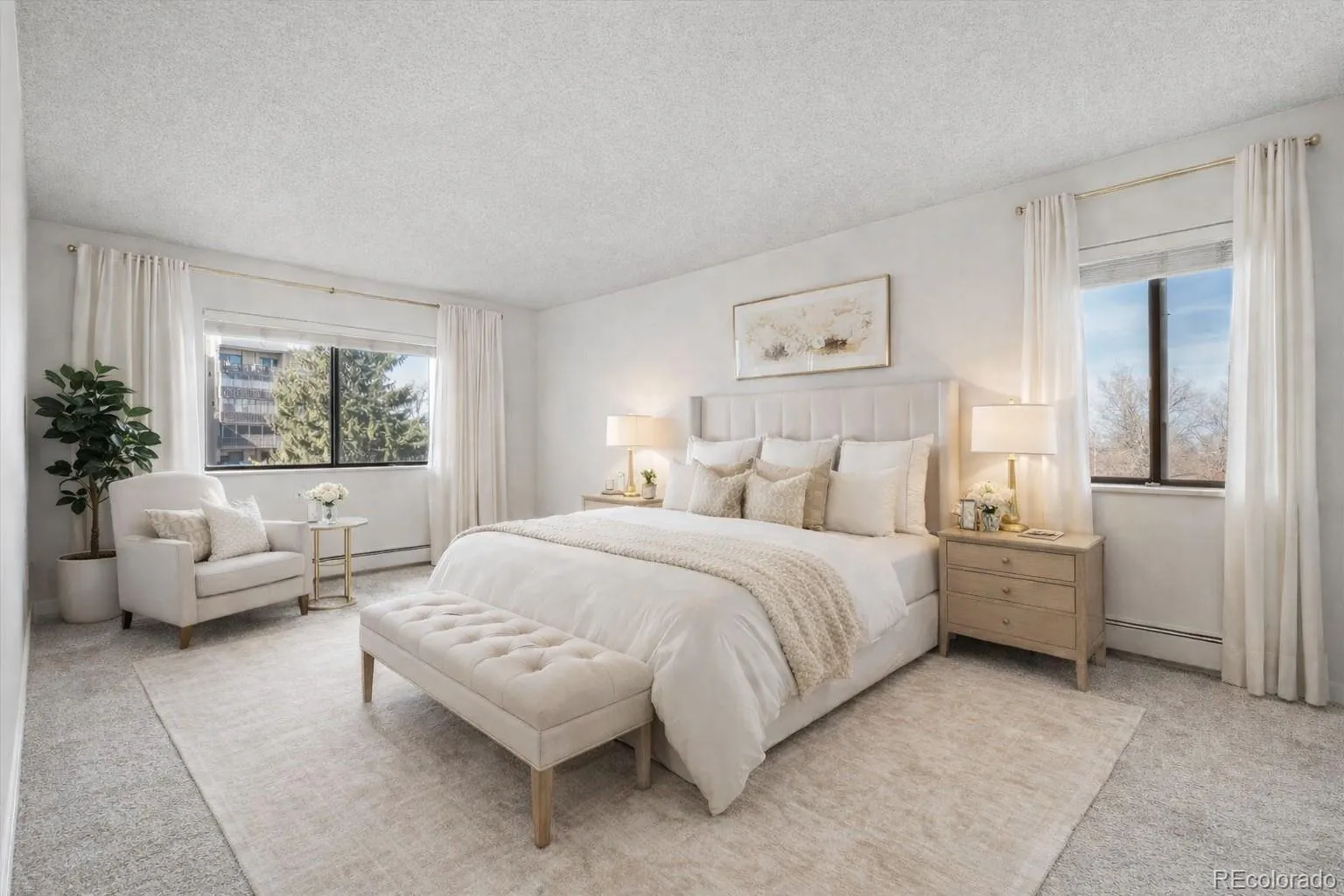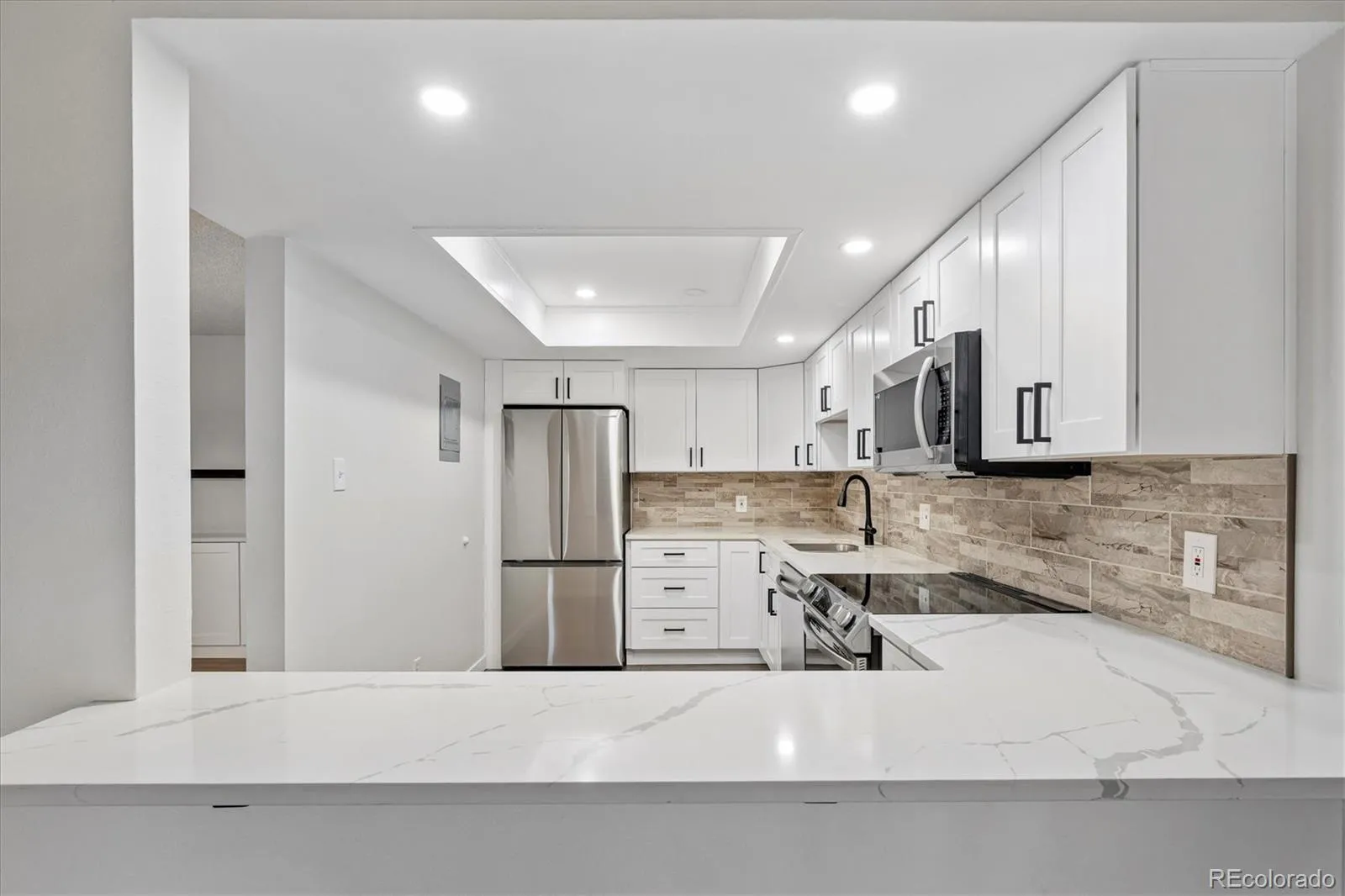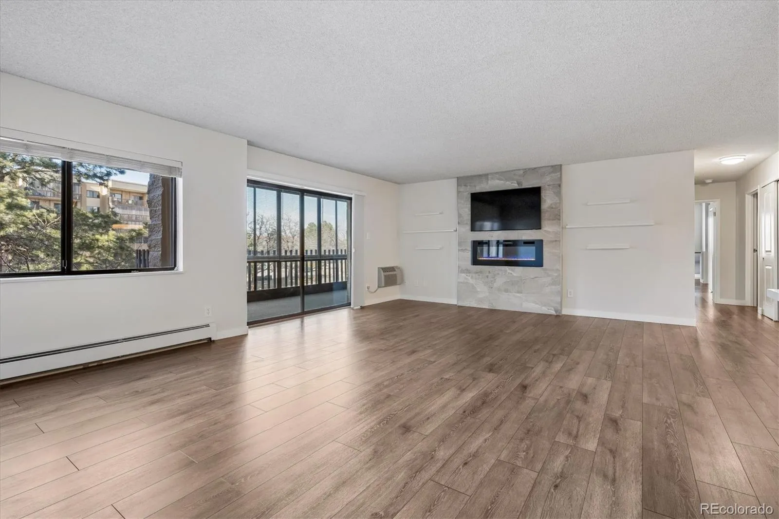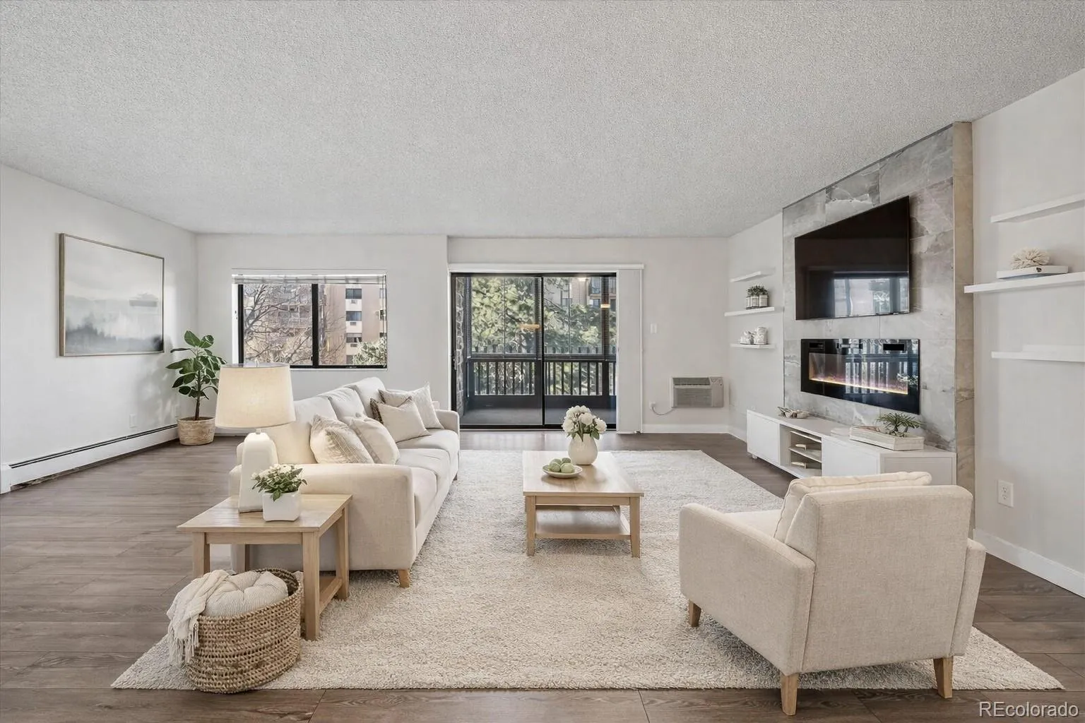 Aggressively priced at $369,000 for a quick sale, this beautifully remodeled end-unit home in Heather Gardens offers exceptional value in a prime corner location overlooking a tranquil greenbelt with mature trees and garden views. The spacious enclosed lanai provides versatile multi-season living and features new blinds and blackout sliding shades for added comfort and privacy. Inside, the living room is both stylish and welcoming, highlighted by wood-look LVT flooring and a sleek linear electric fireplace with TV above. A separate dining area flows seamlessly into the thoughtfully redesigned kitchen.The kitchen shines with white shaker cabinetry with soft-close doors, quartz countertops, decorative tile backsplash, and a complete Samsung stainless steel appliance package, along with an eating bar ideal for casual dining. Extensive updates include new lighting throughout, new switches and outlets, updated hardware, and a new electrical panel.Both bathrooms have been fully renovated with matching modern vanities, tiled shower surrounds, new fixtures, and contemporary finishes. The primary bedroom features plush neutral carpeting, while the living areas are finished with durable, stylish laminate flooring. Additional conveniences include in-unit laundry and one underground parking space (#62 includes cowboy storage), plus additional storage unit (#312) and direct elevator access to your residence floor.This 2-bedroom, 2-bath residence has been remodeled from top to bottom and stands out as one of the nicest homes currently available in Heather Gardens, Aurora’s premier 55+ community. Residents enjoy outstanding amenities including a multi-million-dollar clubhouse, executive 9-hole golf course, indoor and outdoor swimming pools, fitness center, tennis courts, and a vibrant calendar of social activities.A rare opportunity to secure a turnkey home at an exceptional price — move in and start enjoying resort-style living right away.