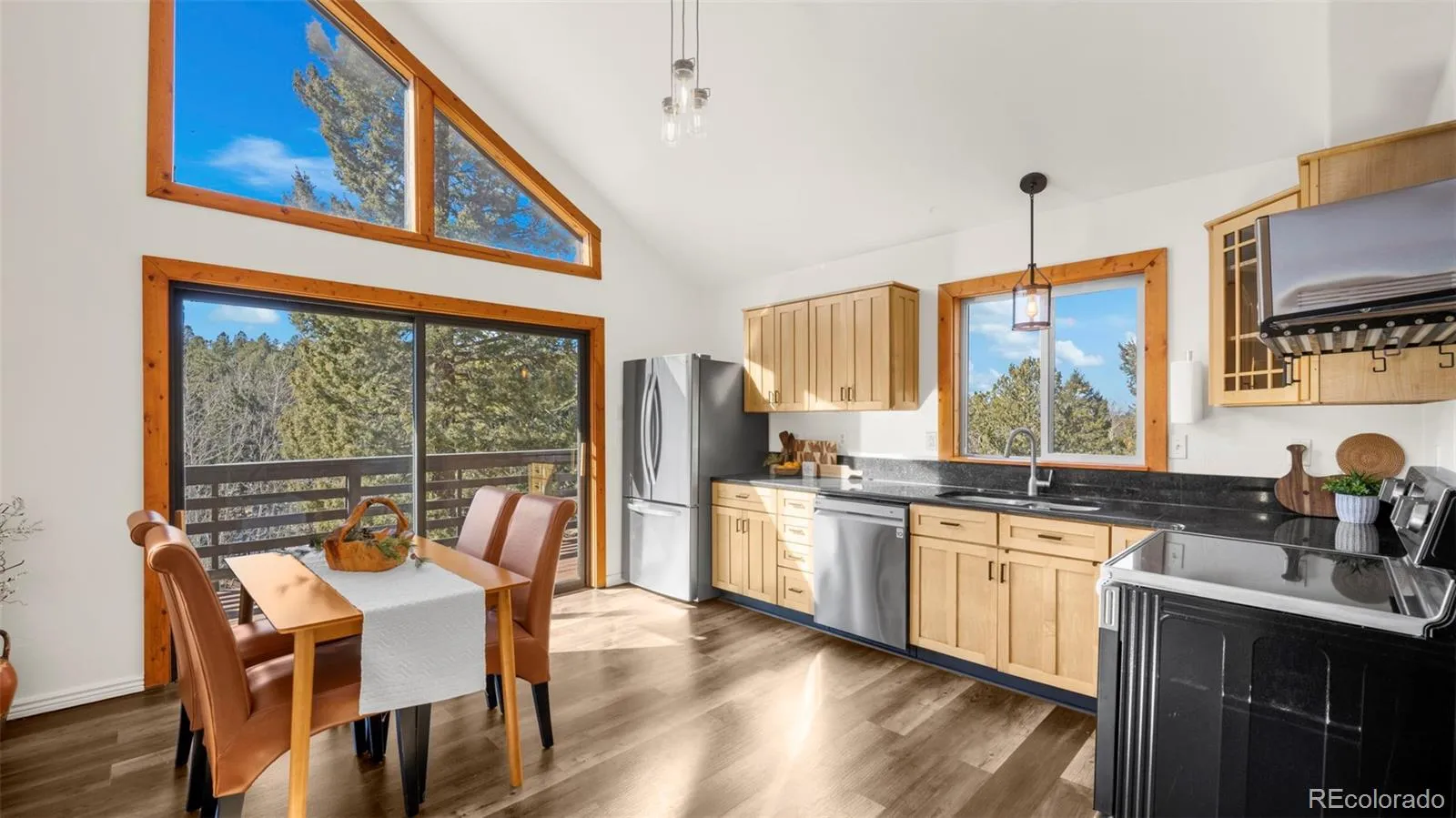 Nestled in a peaceful mountain setting surrounded by a mature mix of pine and aspen trees, this 1,536 square foot raised ranch-style home offers comfort, privacy, and convenient access to nearby amenities. The main level features an open floorplan designed for easy living and entertaining, highlighted by clerestory windows in the living room that fill the space with abundant natural light. Luxury vinyl flooring runs throughout the main level, providing durability and a cohesive modern look. The updated kitchen is well-appointed with LG stainless steel appliances, granite countertops, and ample cabinetry, making meal preparation both functional and inviting. Step outside to the expansive wraparound walkout deck, where you can relax or entertain while enjoying panoramic treetop views of the surrounding hills—a true mountain retreat. The walkout lower level offers excellent flexibility with a comfortable family room, two additional bedrooms, and an updated bathroom, ideal for guests, multi-generational living, or work-from-home needs. Outdoor features include street level RV parking, a fenced dog run, and plenty of usable space to enjoy the natural surroundings. With three bedrooms and two baths, a thoughtful layout, and a serene yet accessible location, this home strikes the perfect balance between mountain living and everyday convenience. A move-in-ready opportunity for those seeking space, light, and a peaceful Colorado lifestyle.