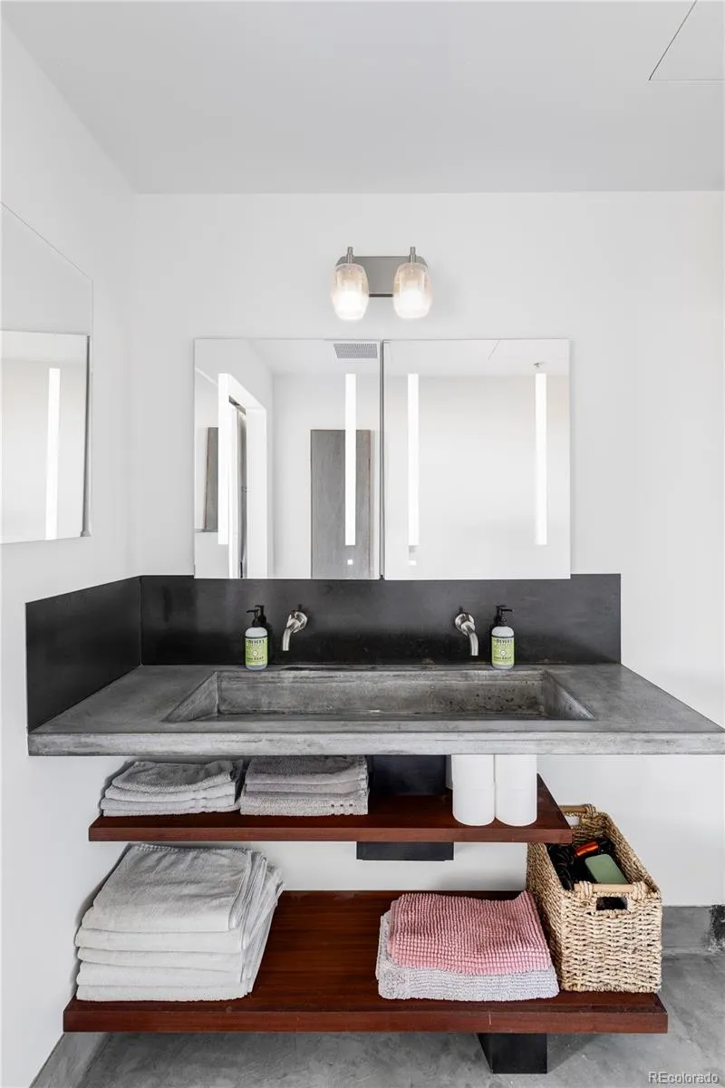 Both spacious bedrooms include en-suite bathrooms, walk-in closets, and automated blackout shades for comfort and privacy. The primary suite also features a custom concrete vanity, floating wood shelving, glass shower, and heated concrete flooring.
