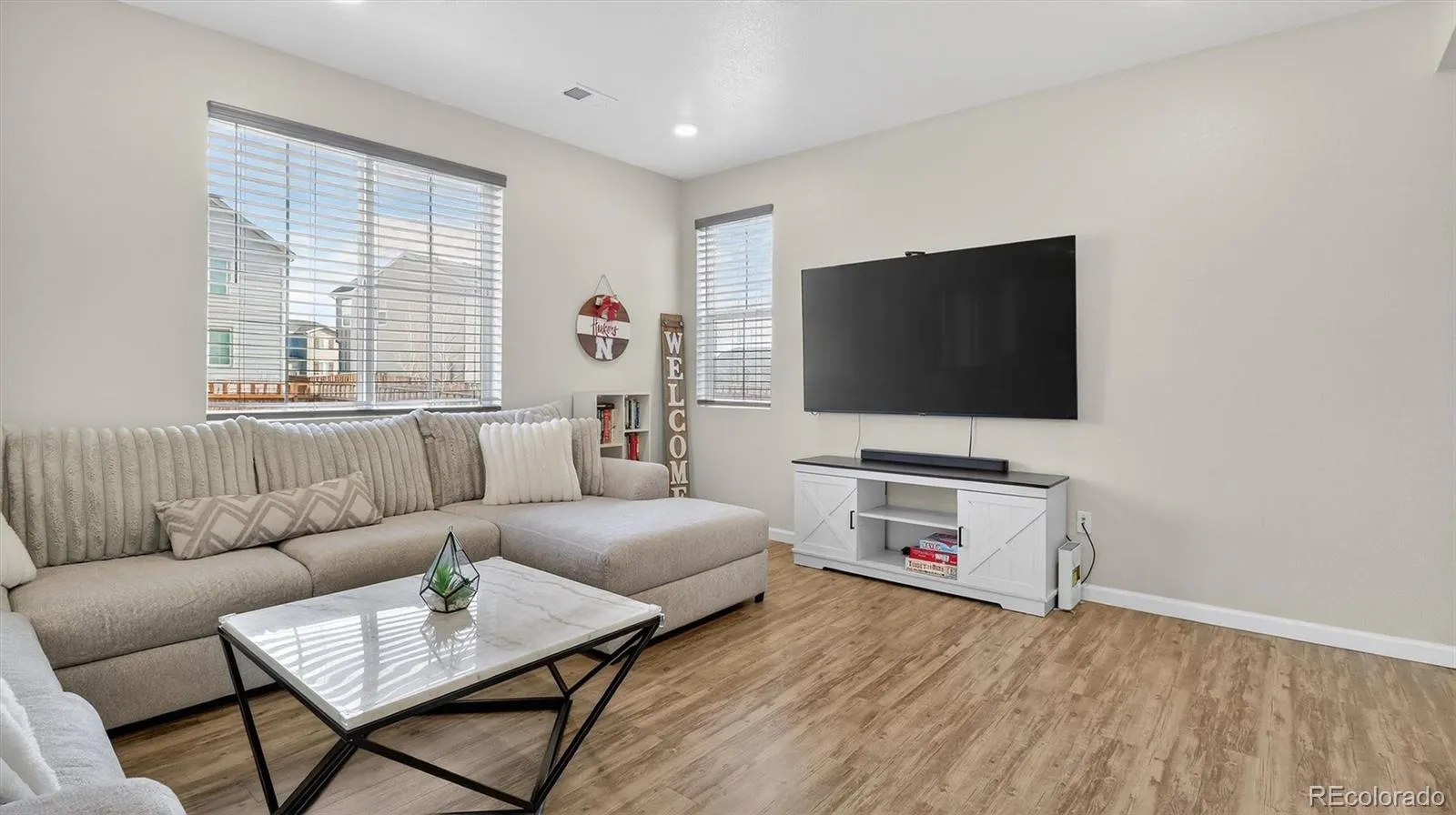 The bright, open main level features a seamless flow between the living area, dining space, and kitchen—ideal for both daily living and entertaining. Large windows fill the home with natural light, creating a warm and welcoming atmosphere throughout.