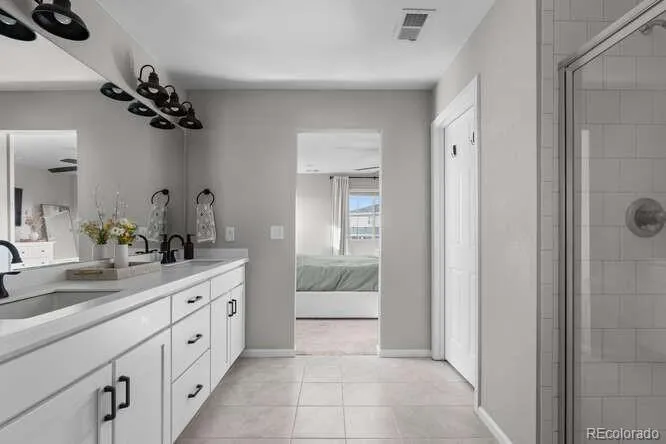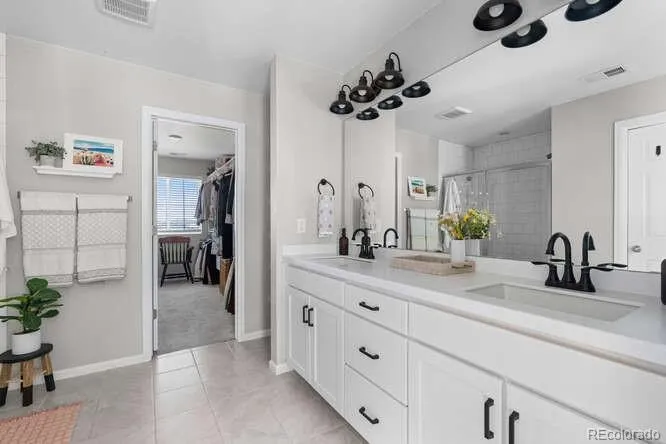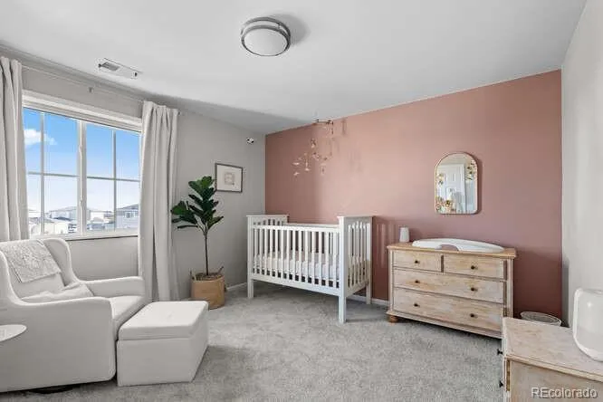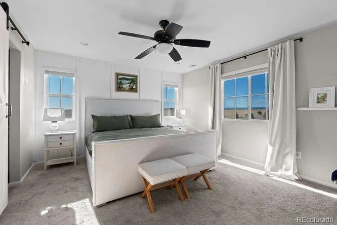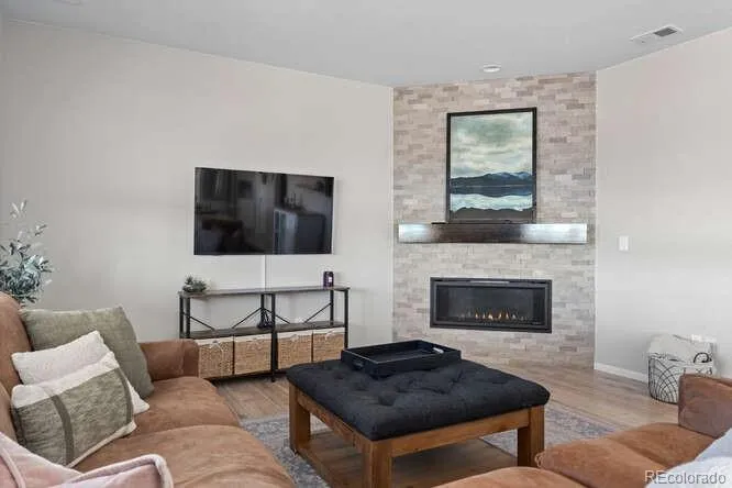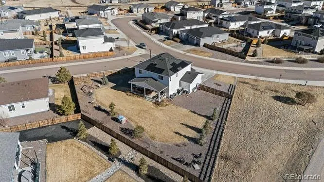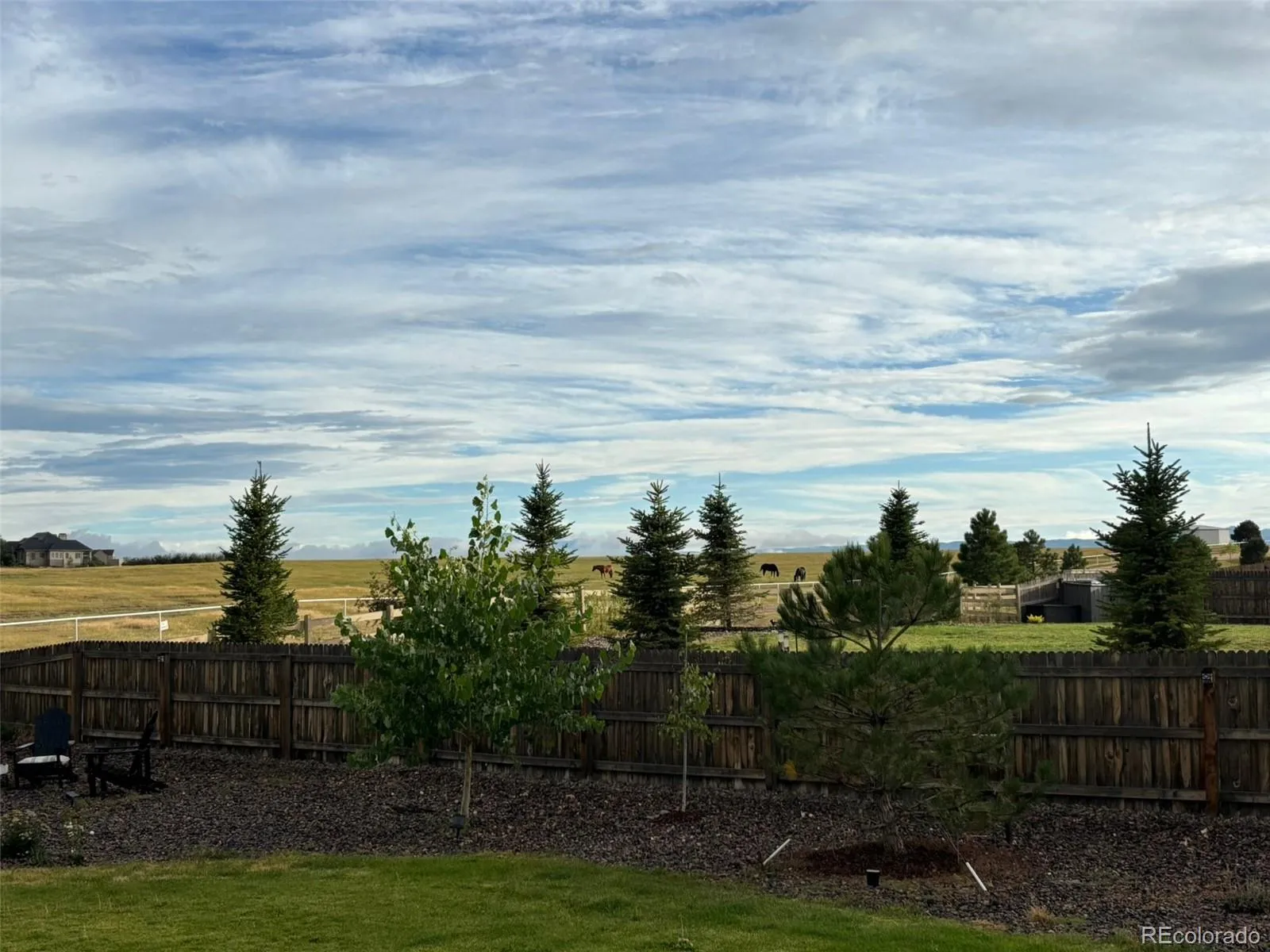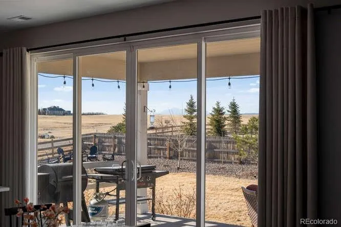 Better-than-new Castle Rock home set on one of the largest and most desirable lots in the area, offering sweeping mountain and Pikes Peak views from the backyard, main level, and primary suite. With open space and horse property just off to the side, the setting feels spacious, private, and truly special—arguably the best lot in the neighborhood. Inside, a welcoming foyer with soaring ceilings and luxury vinyl flooring opens to a bright, open-concept layout. The kitchen features quartz countertops, tiled backsplash, stainless steel appliances, gas range, pantry, and built-in speakers, flowing seamlessly into the dining area and living room anchored by a modern linear fireplace. Large double sliding glass doors open to the covered patio for effortless indoor-outdoor living. The primary suite captures stunning mountain views and offers a generous walk-in closet and dual-vanity bath. A conveniently located laundry room and linen storage sit nearby. The upper level includes three additional bedrooms, all with walk-in closets, and a thoughtfully designed third full bathroom. The expansive backyard provides space to relax, entertain, and enjoy unforgettable sunsets. Additional highlights include a full crawl space, energy-efficient construction, and owned solar panels with a low monthly payment that transfers to the buyer and more than offsets utility costs. An awesome 3-car garage completes the home. Ideally located minutes from downtown Castle Rock, dining, shopping, Red Hawk Ridge Golf Course, Castlewood Canyon, parks, and miles of trails—offering exceptional views, space, and value without the rising cost of new construction.