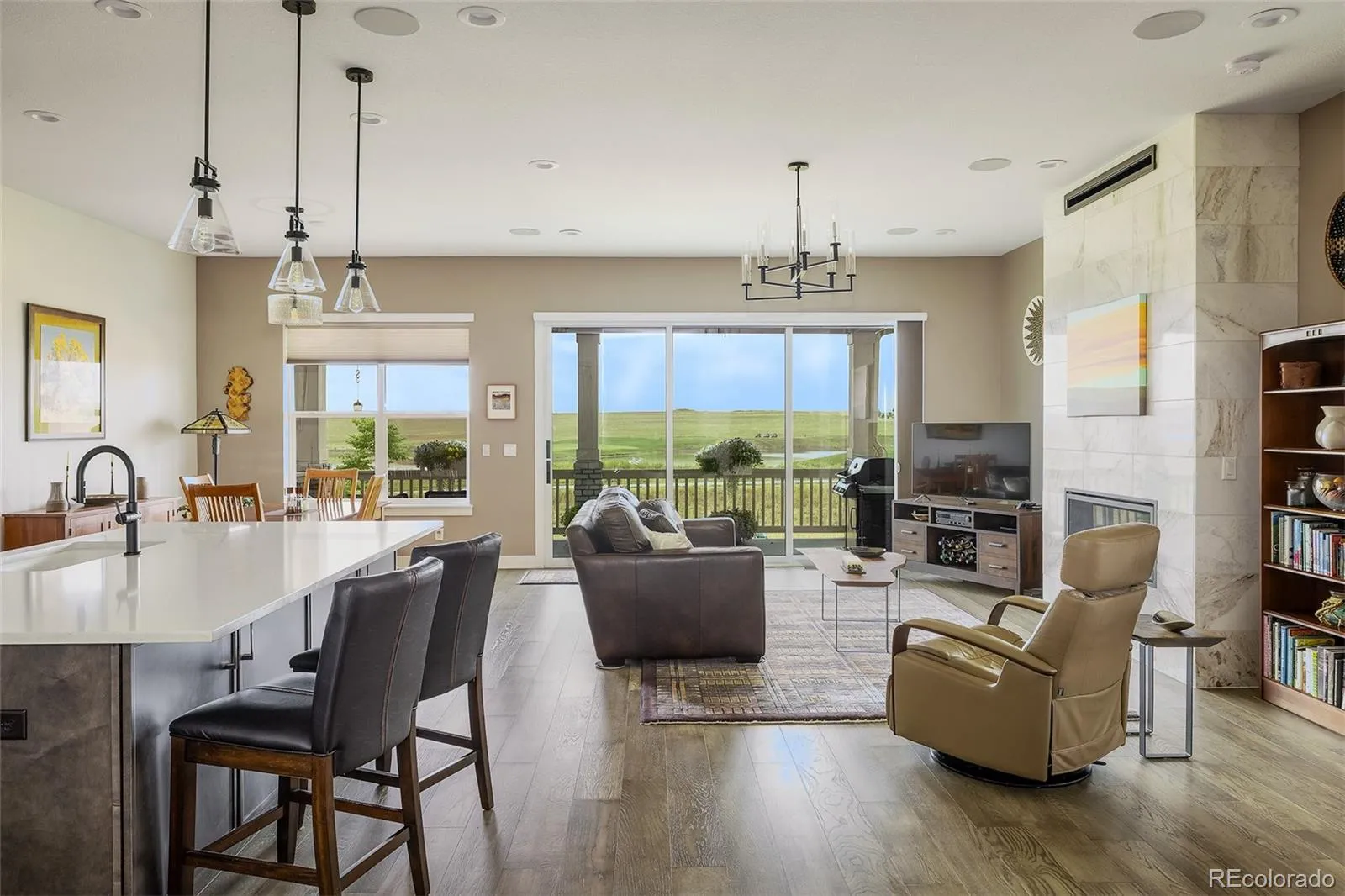 Discover your new home with stunning golf course, lake, & mountain views. This desired ranch-style home comes w/ maintenance-free living in a resort-style community. Situated away from the tee & the green on the 3rd hole of the Heron Lakes TPC golf course, you will enjoy the expansive views out the large windows & 3 panel sliding door. The open-concept design provides the perfect connection for the expanded kitchen, great room, large kitchen island & covered deck. A gas floor to ceiling fireplace & hardwood floors make this a comfortable place to spend your time. On this floor, you will find a spacious primary bedroom with two walk-in closets. Large bathroom with an ultra -shower, double vanity & water closet complete the ensuite. Down the hall, you will find an office (possible 5th bedroom), laundry room, full bathroom, and cozy bedroom with a view of the mountains. Head down the stairs to the garden level to find two large bedrooms w/ walk-in closets and large daylight windows. The rooms’ transom windows extend the natural light into the game room, entertainment area w/ fireplace, and bonus craft room/wet bar/possible kitchenette. Beyond these rooms, you will find the third bathroom & ample storage areas. Light oak wood flooring & custom cabinets create a wonderfully livable area. On the covered deck, you can enjoy the views of the golf course & “Newfound Lake” on Colorado’s warm summer evenings. The deck stairs will take you to the fenced yard & lead you out to the newly designed & installed xeriscape landscaping with bench to view the mountains. Weekly lawn care & winter snow shoveling are provided by the HOA. Enjoy all the amenities that come with owning a home at Heron Lakes. The beautiful clubhouse has two restaurants, a resort-style pool with a swim-up bar in the summer, a year-round state-of-the-art fitness center & miles of walking trails. Also available is membership to the Lone Tree Reservoir where you can boat, paddle, or swim during warmer months.