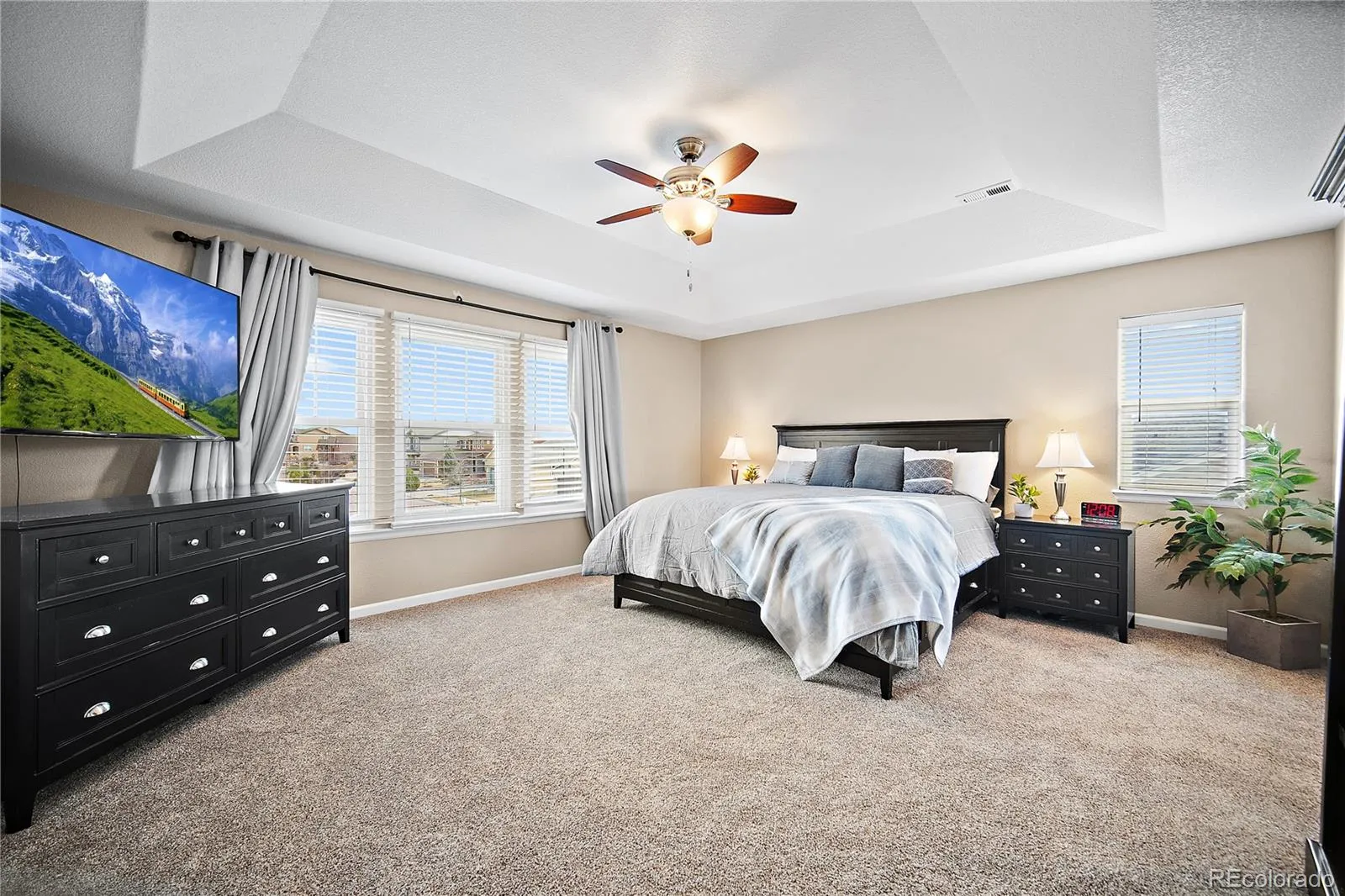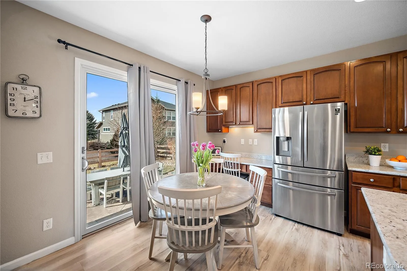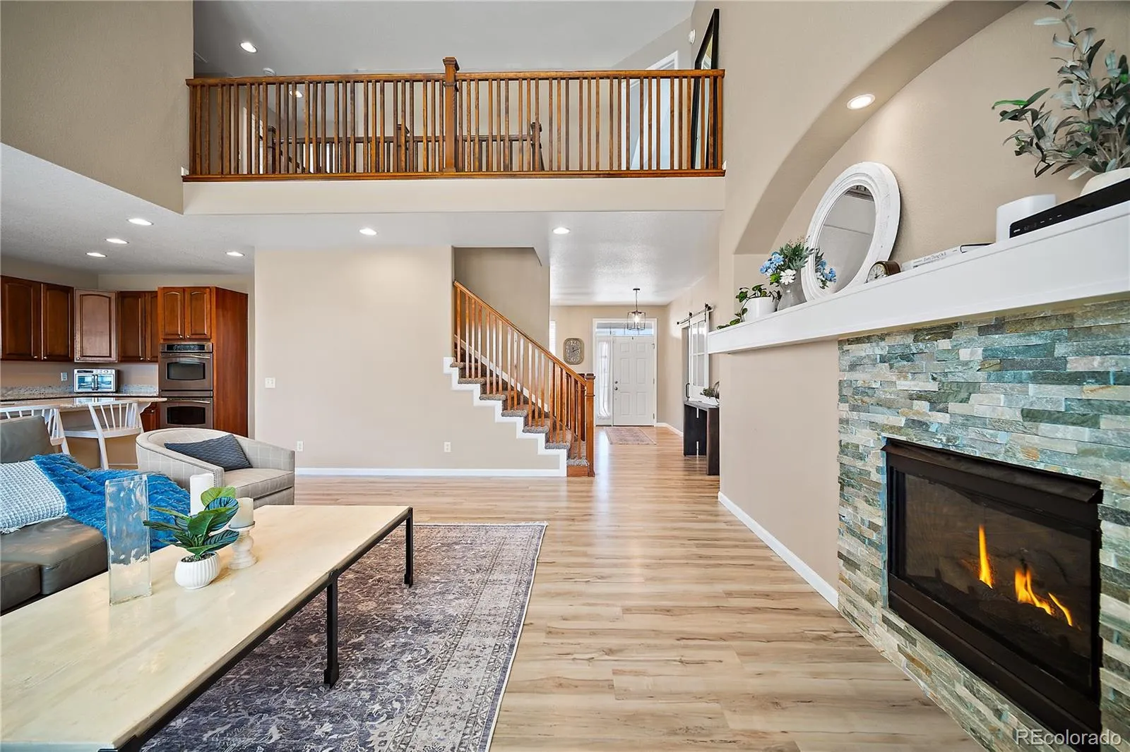 This beautiful 6 bed, 4 bath, 3 car home is located in the coveted Wolf Ranch neighborhood in School District 20. The main level features a formal dining room, main level office with barn door. The living room features a 2 story ceiling with a gas fireplace and stacked stone surround. The spacious eat-in kitchen walks out to the back yard and stamped concrete patio. Just off the kitchen is a spacious laundry room with a walk out to the side yard. There is also a main level guest bedroom and 3/4 bath. Upstairs features the primary suite with trey ceilings , 5 piece spa-like ensuite bath and walk in closet. There are 3 additional bedrooms upstairs and a full bath with double vanity. The recently finished basement boasts a huge entertaining space with a wet bar and walk-in game closet. There is also a bedroom and full bath as well as unfinished storage space. The back yard is fully landscaped with a stamped concrete patio. Wolf Ranch features beautiful community parks and miles of trails. The clubhouse with outdoor pool, dog park, play ground and plenty of outdoor event space. There is even a small fishing lake within the community. Minutes from schools, shopping and entertainment.