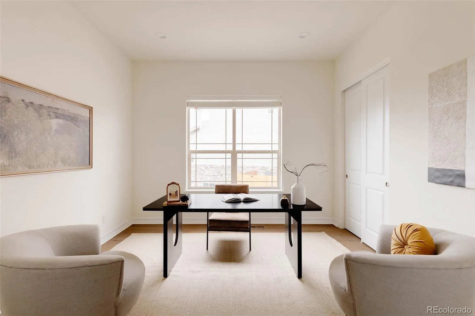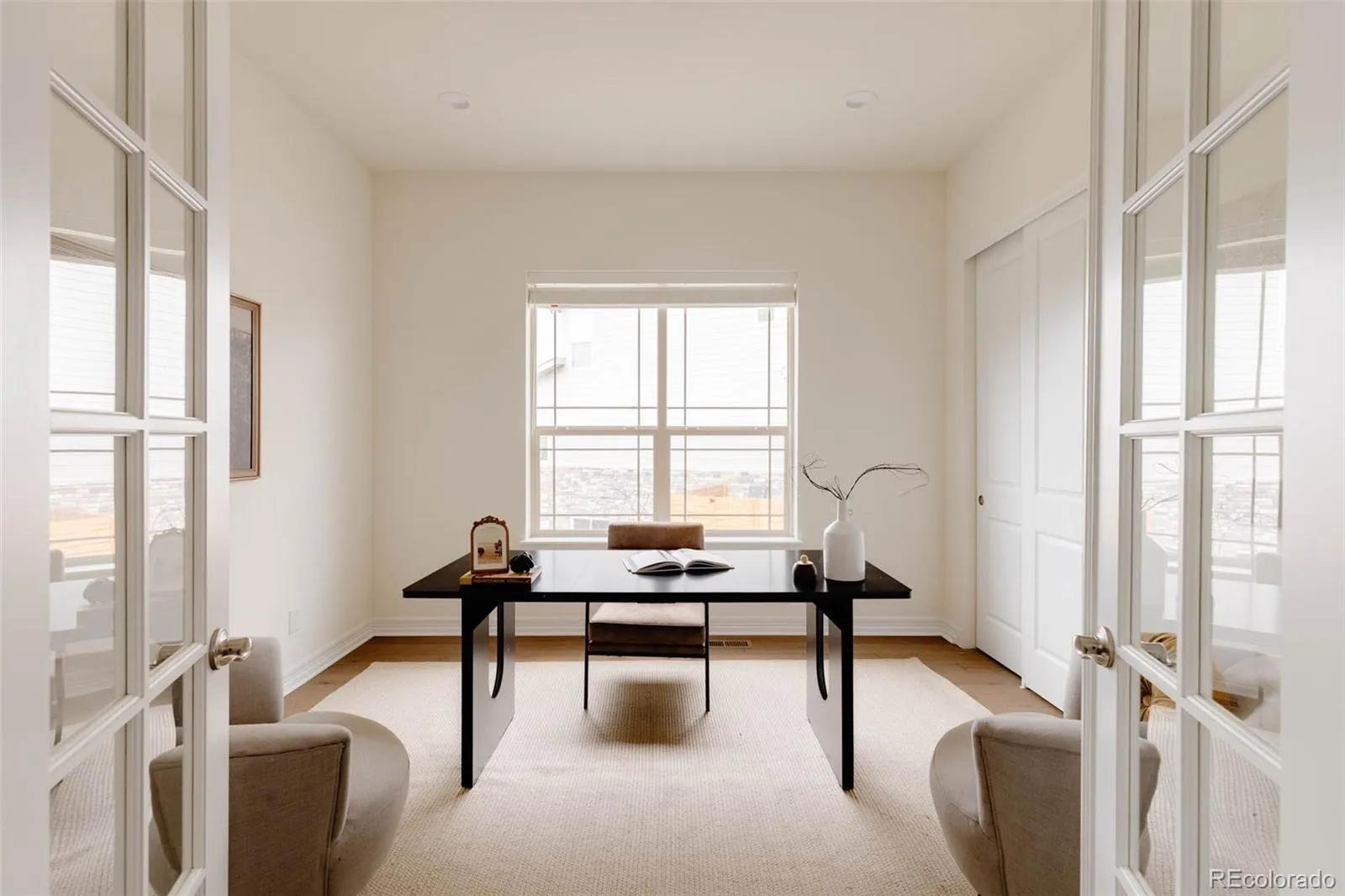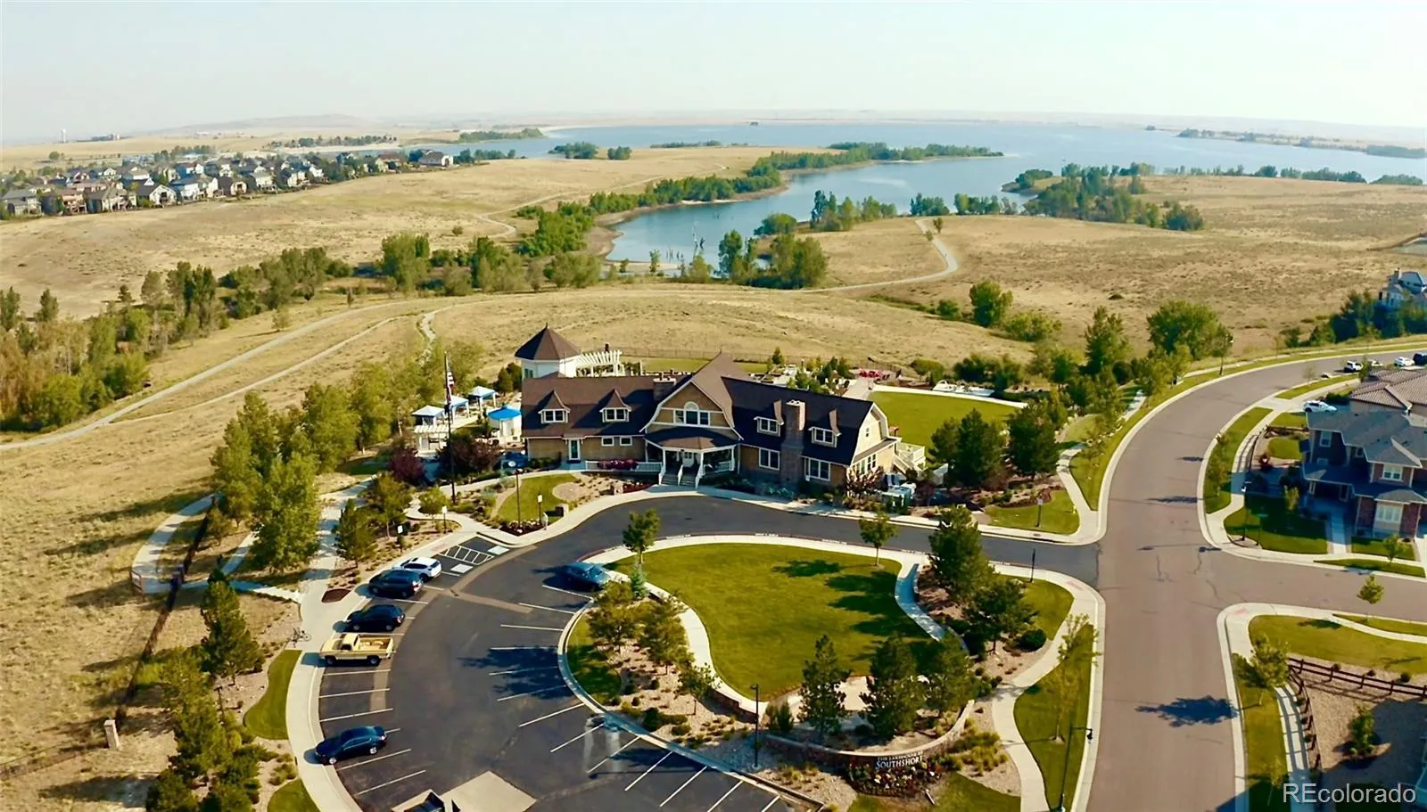 Nestled between 2 resort-style clubhouses & pools, & part of the award-winning Cherry Creek School District, this home offers the best of Colorado living w/scenic trails, vibrant parks, state-of-the-art fitness centers, & the Aurora Reservoir steps away. Inside, the great room impresses with soaring 12ft ceilings & a stunning 15ft stacked slider to access an extended patio, while the dining area has a picturesque view of the reservoir. A gas fireplace with tile surround anchors the space, complemented by engineered wide-plank oak floors & recessed LED lighting throughout. The kitchen shines w/ stacked white cabinetry to the ceiling, quartz countertops, designer lighting, an extended island perfect for entertaining, & upgraded stainless steel appliances including a gas range. A large pantry completes the space. The main level features a secondary bed w/ its own en-suite bath, providing comfort & privacy for guests or family. An additional bedroom with French doors can be used as a study, showcasing water views for an ideal work-from-home retreat. The primary suite is a sanctuary with a luxurious en-suite bath boasting double vanities, upgraded countertops, a large walk-in shower with floor-to-ceiling tile, a soaking tub & a large walk-in closet. The convenient mud/laundry room enhances daily organization. The garden-level unfinished basement is bright with six large windows & ready for your custom vision, including plumbing rough-in. Upgrades include custom blinds, enhanced sound & garage insulation, gas fireplace fan, in-line humidifier, & radon detection system. The 3-car garage is pre-wired for an EV charger; the backyard is wired for a swim spa or hot tub. Outdoors, enjoy a beautifully landscaped yard w/ dual retaining walls & a custom water runoff channel. Relax on an expanded rear deck w/water views. The deck has a gas line, perfect for grilling, while a hot/cold hose bib in the front yard adds convenience. South-facing driveway ensures easy snowmelt in winter.