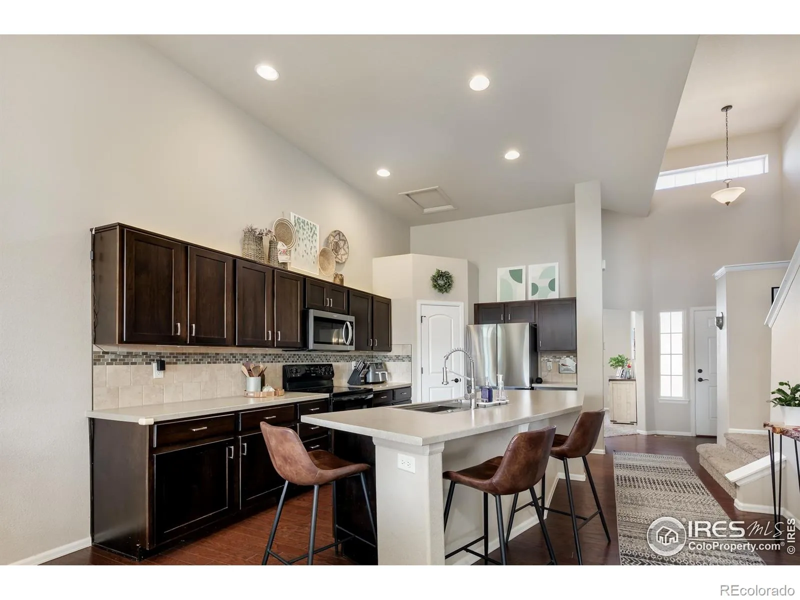 This thoughtfully upgraded home offers exceptional livability, flexible spaces, and a larger-than-typical lot with a fully fenced backyard, setting it apart from other homes in the neighborhood. The open-plan home is anchored by a sunken living room that adds architectural interest while maintaining easy sightlines to the kitchen, making it ideal for entertaining or everyday living. The chef-ready kitchen features a massive center island, abundant storage, an upgraded deep sink, and a premium appliance package that includes a Samsung Bespoke refrigerator, plus new microwave and dishwasher. The layout flows seamlessly, supporting both casual family time and hosting guests. The upper-level primary suite is a true retreat with generous space, a large walk-in closet, and private en-suite bath. The lower-level guest bedroom adjacent to a 3/4 bath with walk-in shower offers privacy for visitors or multigenerational living. Two additional upstairs bedrooms share a full bath, while a front bonus room provides flexible space for a home office, playroom, or media room. The unfinished basement offers excellent future expansion and equity potential. Outside, enjoy professional low-maintenance xeriscaping in front and an expansive backyard with covered porch-perfect for play, pets, and entertaining (deluxe playset included). An extended-depth garage provides abundant storage without sacrificing parking. Ideally located near neighborhood parks, Willow Bend Park & Natural Area, Boyd Lake, walkable schools, and just minutes from downtown Loveland, Fort Collins, and Longmont-this home delivers comfort, upgrades, and space rarely found together.