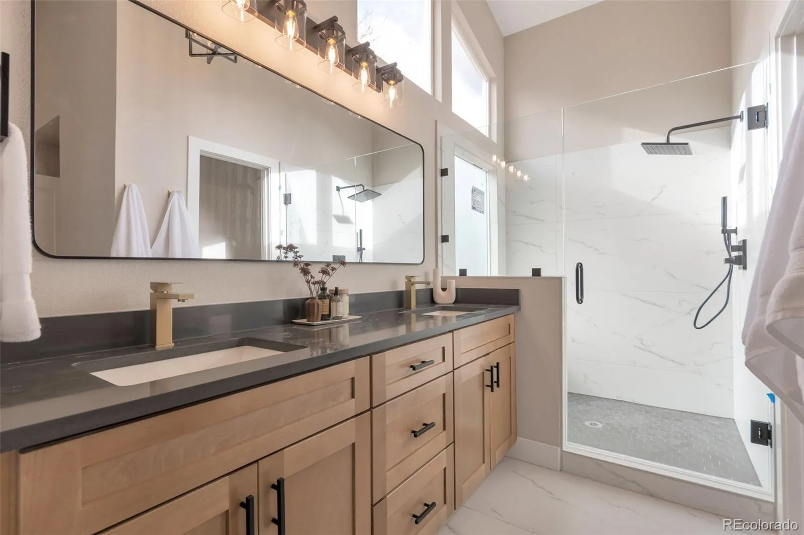The spacious primary suite is a private retreat with direct deck access and golf course views, ideal for morning coffee or peaceful evenings. The luxurious primary bath includes double vanities, an oversized shower, and a generous walk-in closet. A second main-level bedroom sits adjacent to a full bath, perfect for guests.