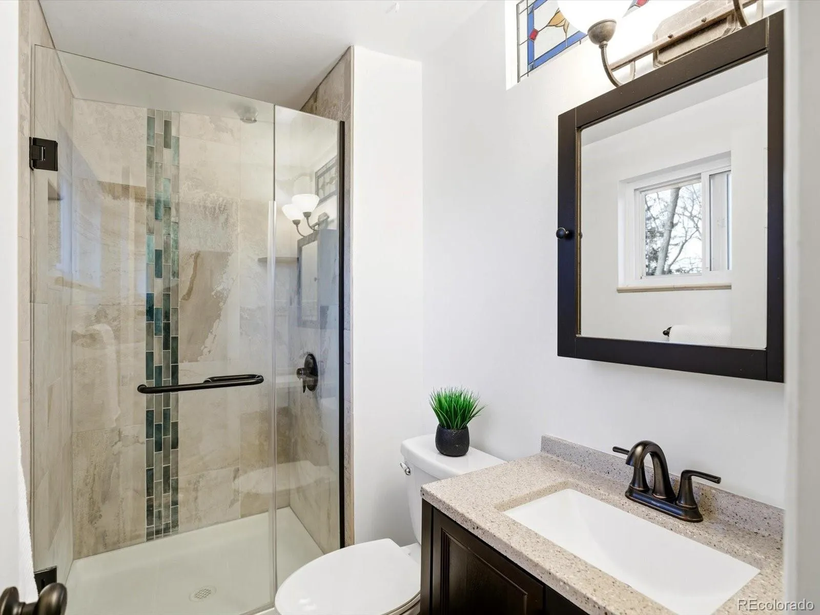 Outside, the fully fenced backyard offers a flat, usable space with a rachio irrigation system, framed by mature trees, creating privacy and shade. A concrete patio provides room for outdoor dining and entertaining, while the front porch enjoys mountain views.
