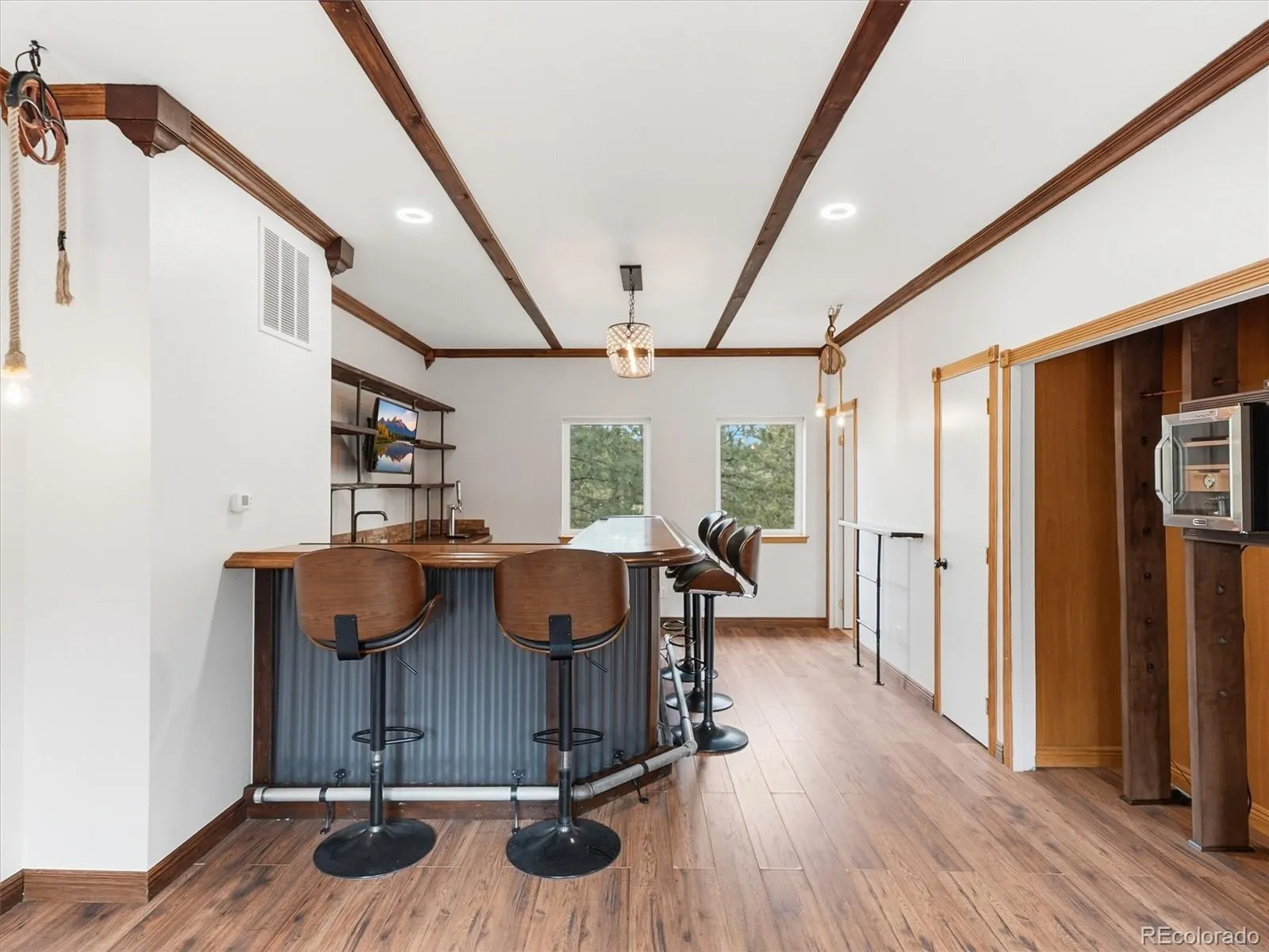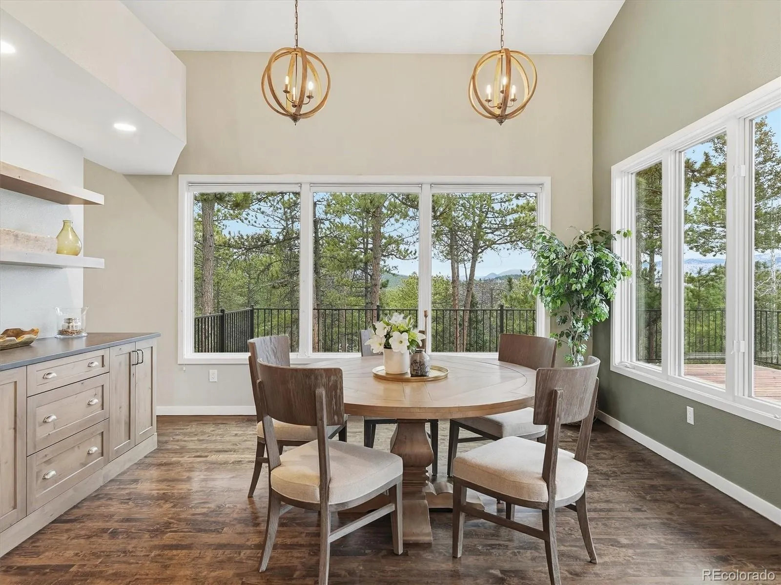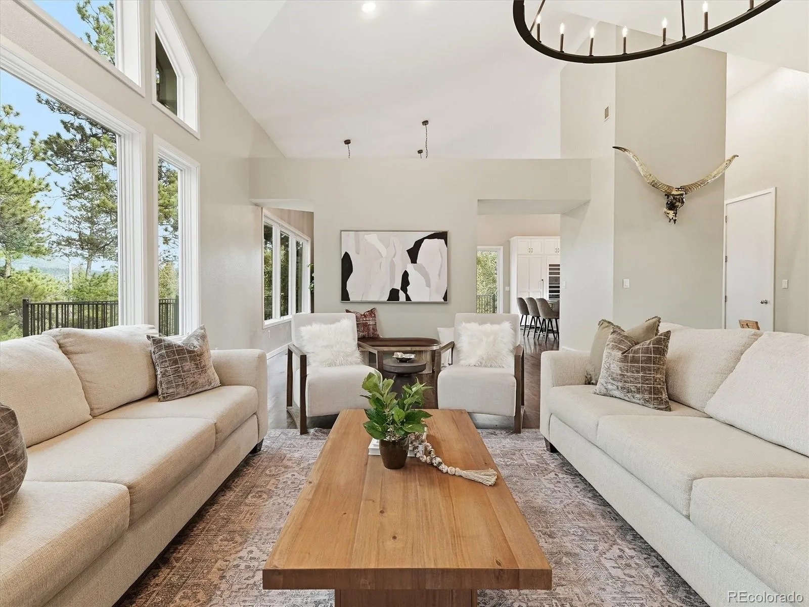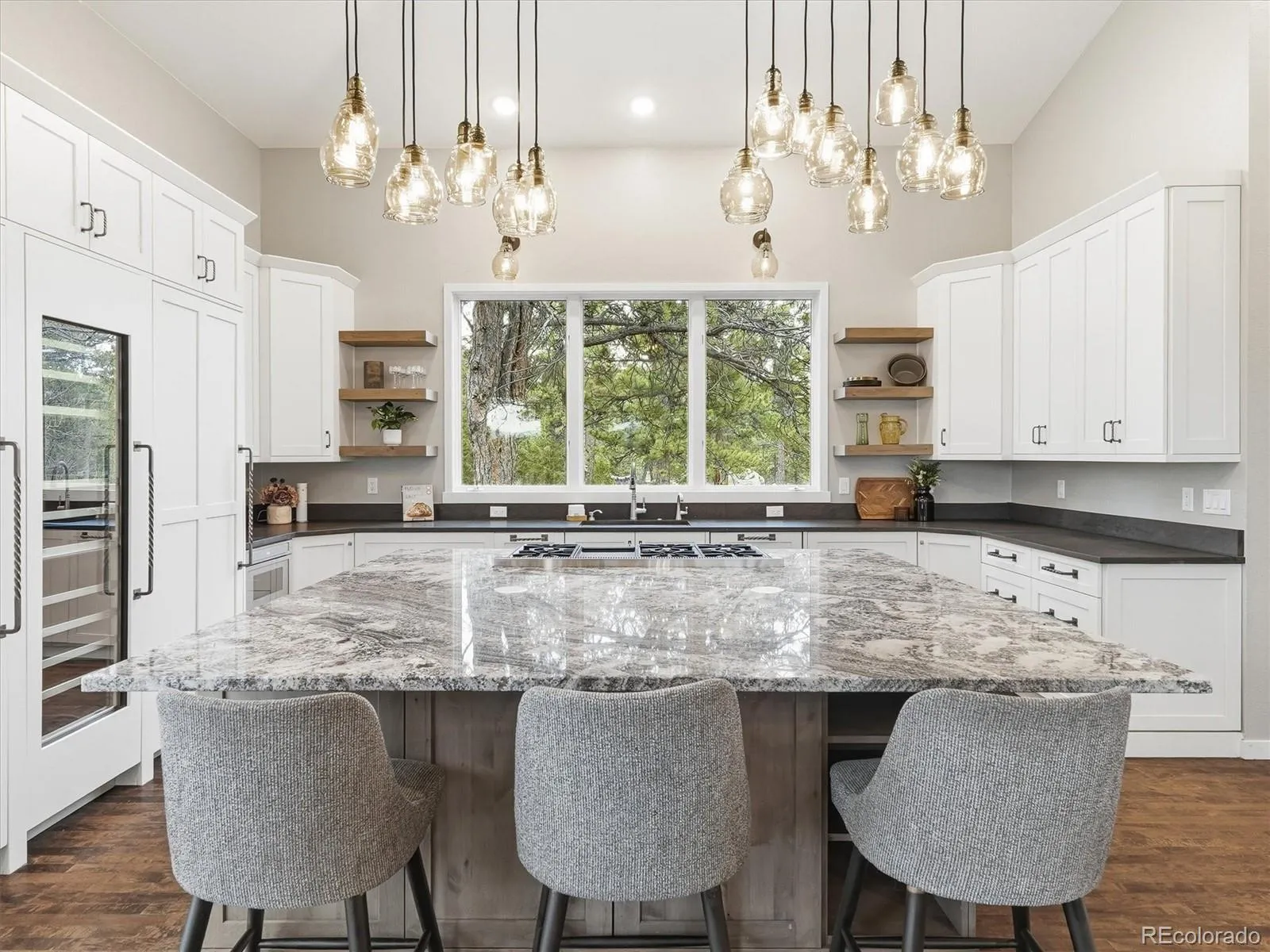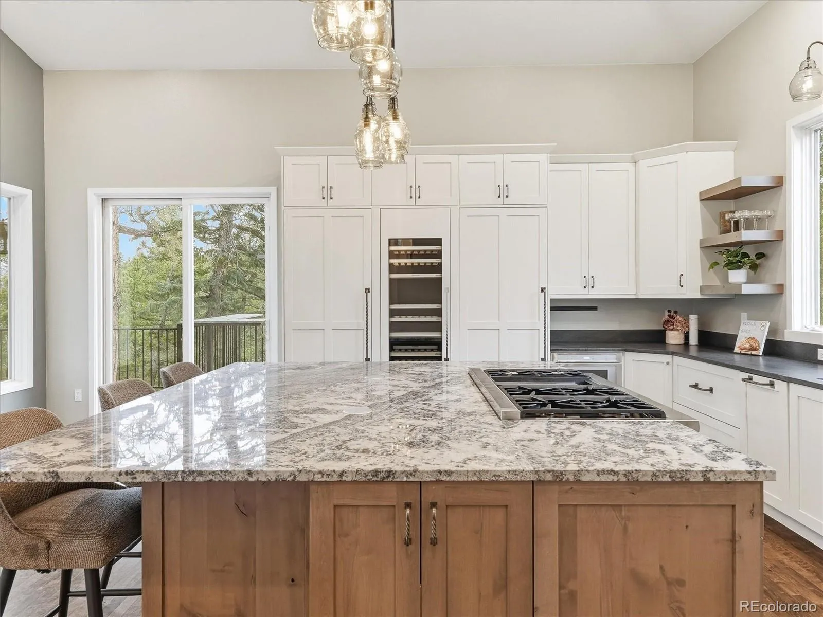 This updated mountain contemporary oasis in one of the most convenient locations in Evergreen has everything you could ask for in a luxury foothills home. Step through the grand entrance and you’ll be immediately greeted by a great room with soaring ceilings, fireplace, tons of natural light, and massive windows framing mountain views. The nearby kitchen is a chef’s dream, with an eight-burner, double-oven Thermador gas range and built-in Sub-Zero fridge, freezer, and wine fridge. Like to host? With plenty of seating at the huge granite island, an open concept layout, and a gorgeous wrap-around, hardwood deck featuring views of the Continental Divide, your guests won’t want to leave. Upstairs, you’ll find a secluded primary suite with a remodeled five-piece bath, walk-in closet, dedicated laundry room, and its own private balcony. The walkout basement features a rec room, kitchen, two bedrooms, full bath, and laundry room. There’s also a private bonus room on the main floor perfect for an office. Need more even more space? Head through the oversized two-car garage to the attached carriage house, complete with a bar/game room (that could be converted to a lock-off apartment), extra deep one car garage, office, bedroom/bonus room, and a huge workshop. And, there’s a whole house generator for peace of mind. The house might be spectacular, but the location can’t be beat. It’s just minutes from I-70 and north Evergreen, less than 20 minutes to Golden, and 30 minutes to downtown Denver, but it feels worlds away on over six acres of secluded forest. Don’t miss this opportunity to live your foothills dream in style.