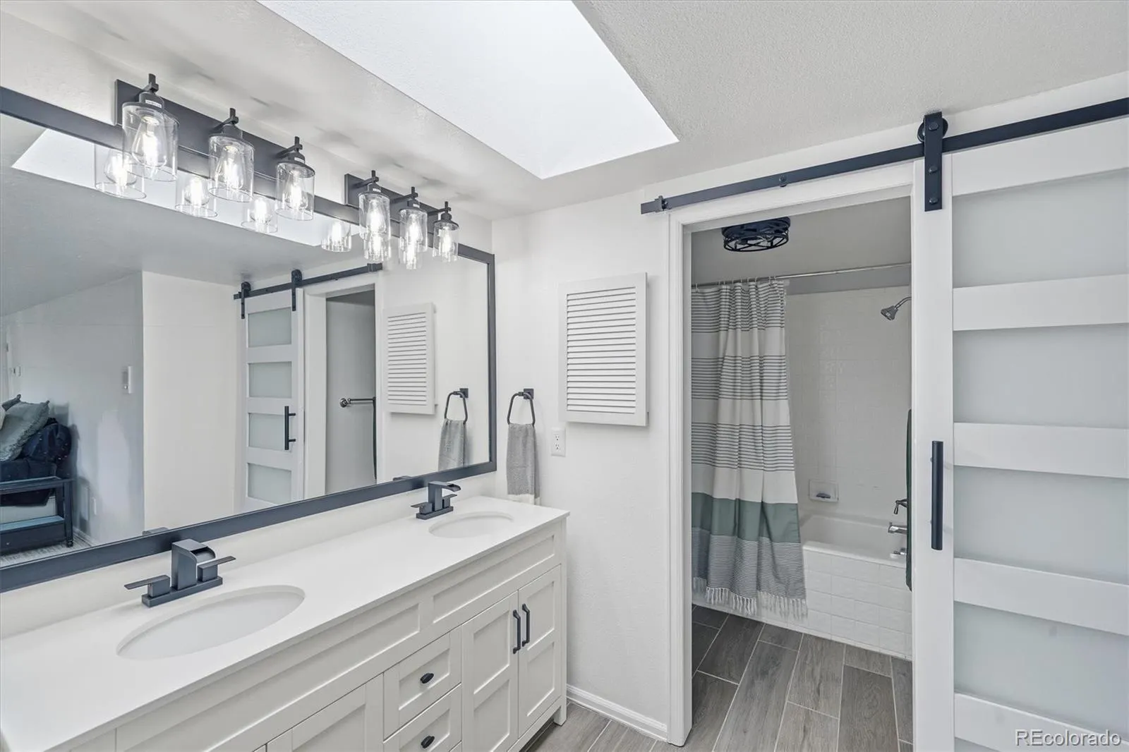 The home has been thoughtfully refreshed with new interior and exterior paint, updated lighting, and bathroom updates in two baths, highlighted by a fully updated primary bathroom featuring new vanities, fixtures, mirrors, and a custom barn-door entry to the walk-in closet.