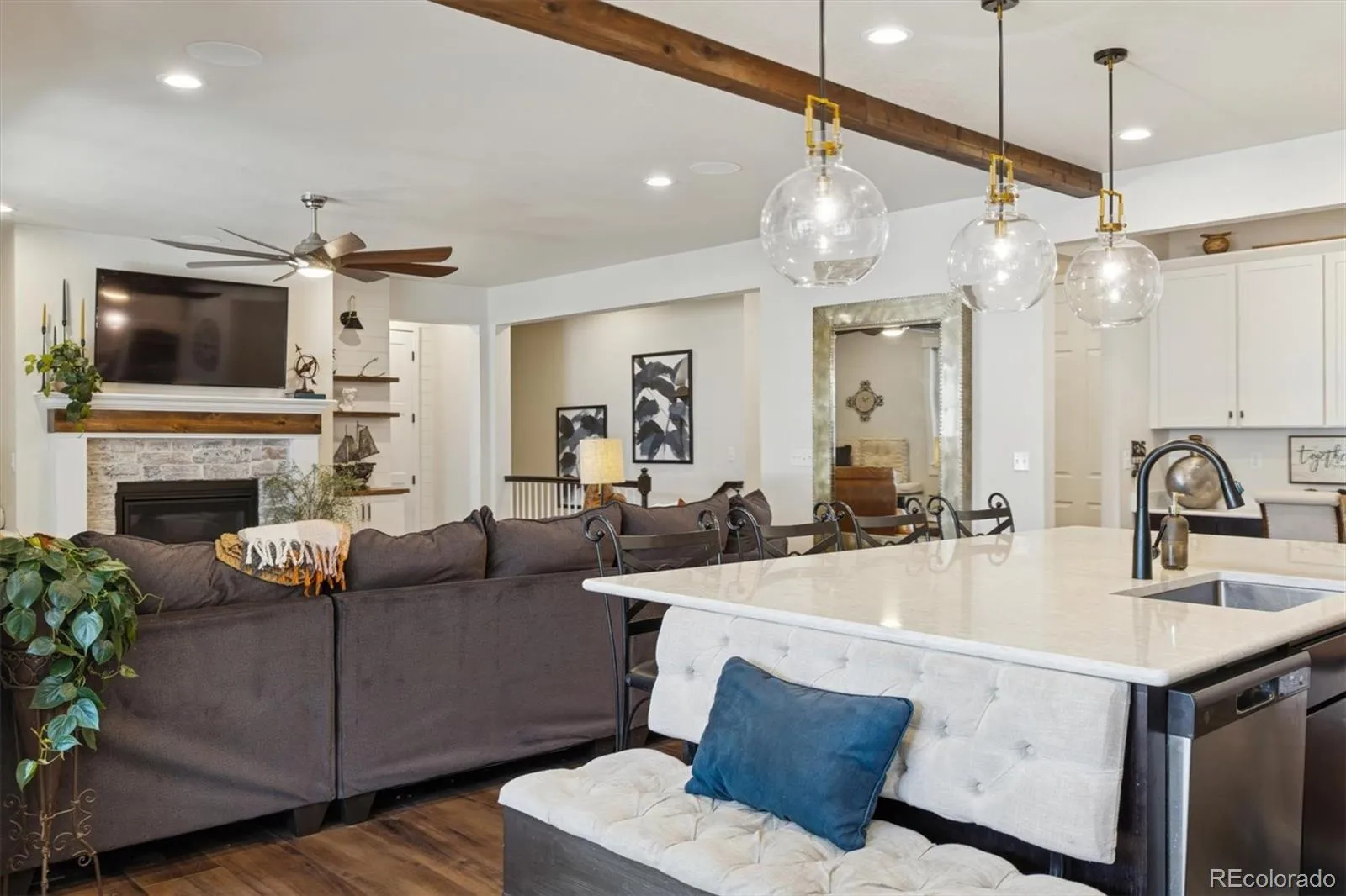 Every box is checked in this stunning home designed to impress at every turn. Situated on a beautifully landscaped corner lot, this home blends timeless elegance with modern functionality and exceptional attention to detail throughout. The heart of the home is the gourmet eat-in kitchen, featuring quartz countertops, an oversized island, abundant cabinetry space, stainless steel appliances, double ovens, a walk-in pantry, and striking pendant lighting beneath soaring 9-foot ceilings. Elegant picture-frame wall moulding and detailed built-ins elevate the space, while a cozy fireplace creates a warm, inviting atmosphere for everyday living and entertaining alike. The primary suite is a true retreat, offering a spacious walk-in closet, double sinks, and a beautifully finished shower. Three bedrooms complete the main level, complemented by a convenient main-floor laundry room. A second laundry area in the basement adds effortless functionality. Downstairs, the fully finished basement expands the living space dramatically, featuring three additional bedrooms, including a private suite with its own kitchen, entertainment space, and walk-in closet—ideal for guests or multigenerational living. Entertain with ease in the main basement living area with a stylish dry bar, or enjoy the custom built-in playhouse that adds charm and creativity. To top it off, there’s an additional full bathroom. Elegant finishes continue throughout, ensuring the lower level feels just as refined as the main floor. Outdoor living is equally impressive with a finished covered patio, an additional finished uncovered patio, low-maintenance artificial turf, and pristine landscaping—perfect for relaxing or hosting in style. Enjoy added privacy with open lawn behind the backyard, creating a peaceful, private setting. Additional highlights include a 3-car garage, German Schemer brickwork, and a seamless blend of luxury, comfort, and thoughtful design at every corner.