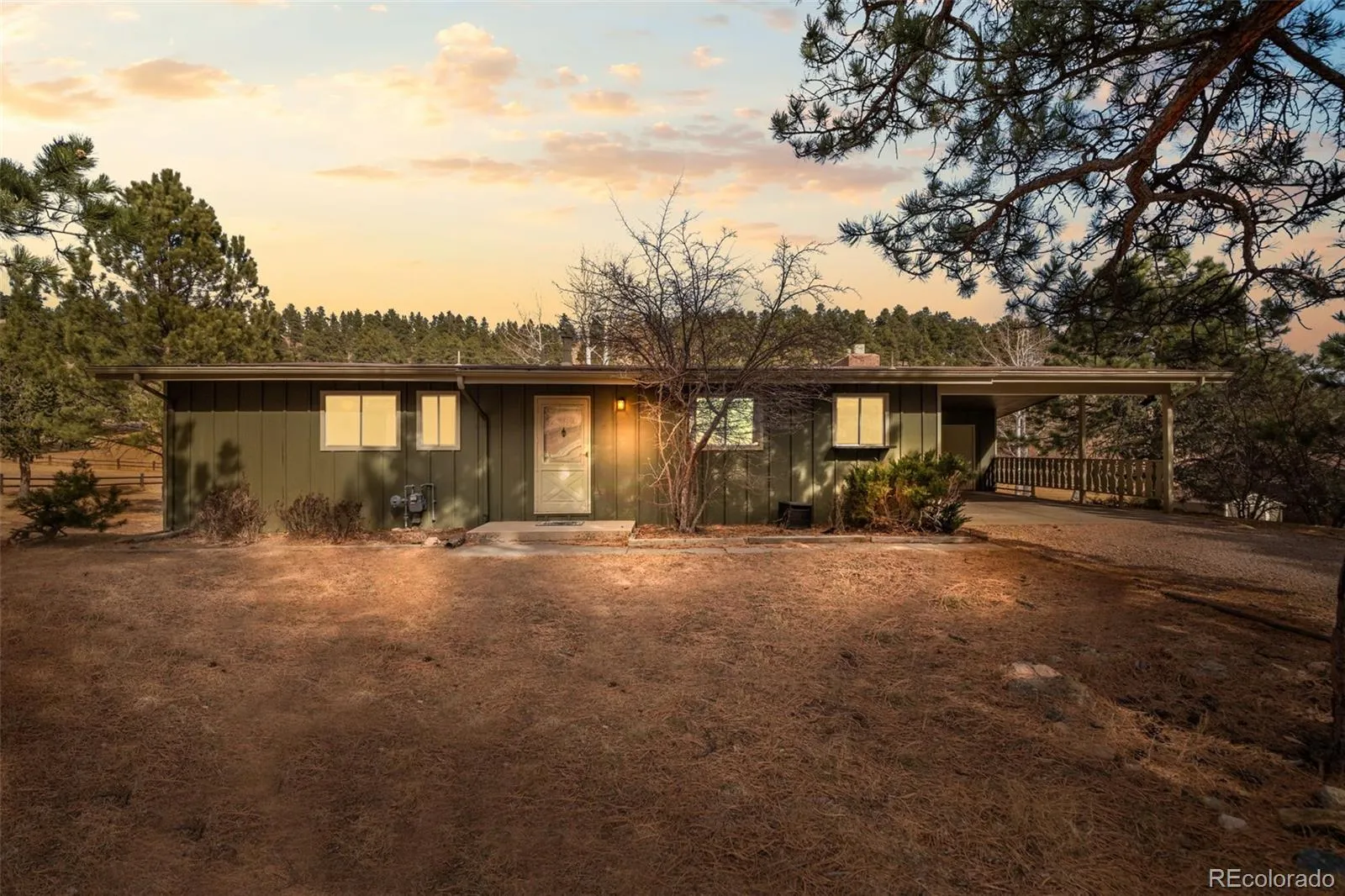 Tucked into the desirable Green Wood neighborhood of Evergreen, this inviting ranch-style home sits on a flat lot backing directly to the Evergreen Golf Course—an ideal blend of space, scenery, and location. The sun-filled main level features a large living area with high ceilings, a cozy wood-burning fireplace, and abundant natural light. The kitchen and dining room flow seamlessly, while the expansive deck offers front-row views of the golf course and Colorado skies. Three bright bedrooms and a full bathroom complete the main level. Downstairs, the fully finished walkout basement adds exceptional flexibility with a second living space, additional fireplace, large bedroom, ¾ bath, and a versatile bonus room—ideal for guests, a home office, or hobbies. Step outside to a spacious, open backyard that feels both private and connected to nature. A two-car carport and storage sheds provide ample room for vehicles and gear. Just minutes from Evergreen Lake, downtown shopping and dining, neighborhood schools, and miles of incredible trails, this home is a rare opportunity in a location that’s hard to beat.