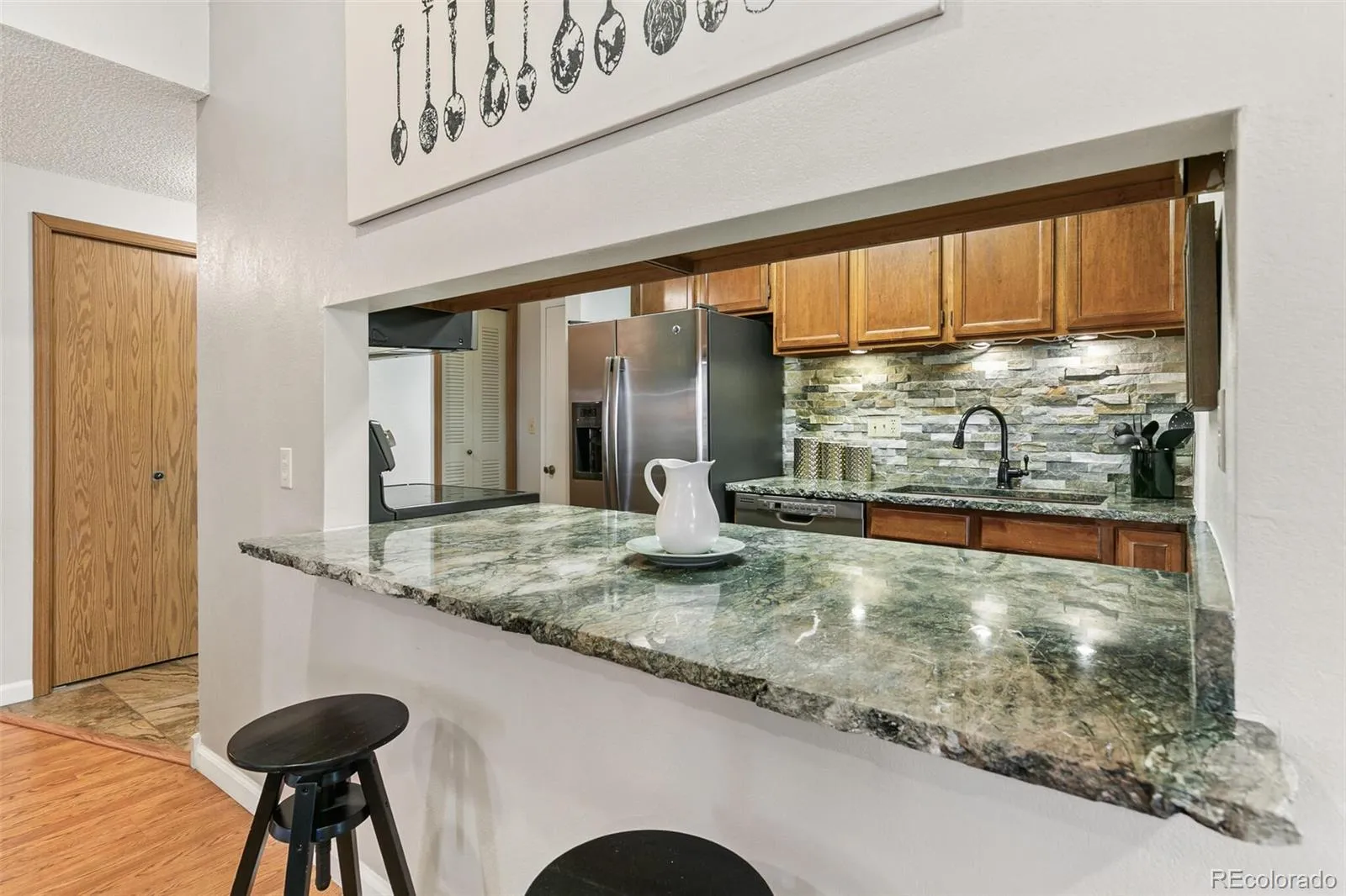 Nestled in the quiet tree-lined community, this well-maintained— lightly lived in, 2-bedroom, 2-bath end-unit in the Timbercove Condos offers comfort, convenience, and an excellent Arvada central location. Step inside to an open floor plan where the living and dining areas flow seamlessly together. The inviting living room centers around a cozy fireplace — perfect for crisp Colorado evenings — and opens directly onto your spacious private patio. Fire up the included BBQ grill and enjoy outdoor dining, morning coffee, or sunset lounging. With a small greenbelt right next door, you get an extra dose of openness and privacy rarely found in condo living. Just off the dining area, the updated kitchen shines with stainless steel appliances, generous cabinetry, and a stunning designer stone wall with granite counters that instantly elevates the space. A pantry and nearby laundry closet (with upper cabinets and included washer/dryer) keep everything organized and within reach. A secondary bedroom—ideal for guests or a home office—and a full hallway bath provide flexibility. The primary suite offers a peaceful retreat with a walk-in closet, updated lighting, and a beautifully finished ensuite featuring a custom-tiled walk-in shower and semi-frameless glass doors. Both bathrooms echo the same thoughtful upgrades and clean, modern feel. This home includes an ATTACHED one-car garage with a large storage closet and built-in shelving, plus an additional reserved parking space directly behind the garage. Guests will love the ample parking near your front door — which feels like your own private entrance thanks to the end-unit location. Live moments away from local favorites like Highland Tap & Burger, Sweet Bloom Coffee Roasters, and a variety of restaurants, parks, and everyday conveniences. It’s the perfect blend of suburban calm and urban access!