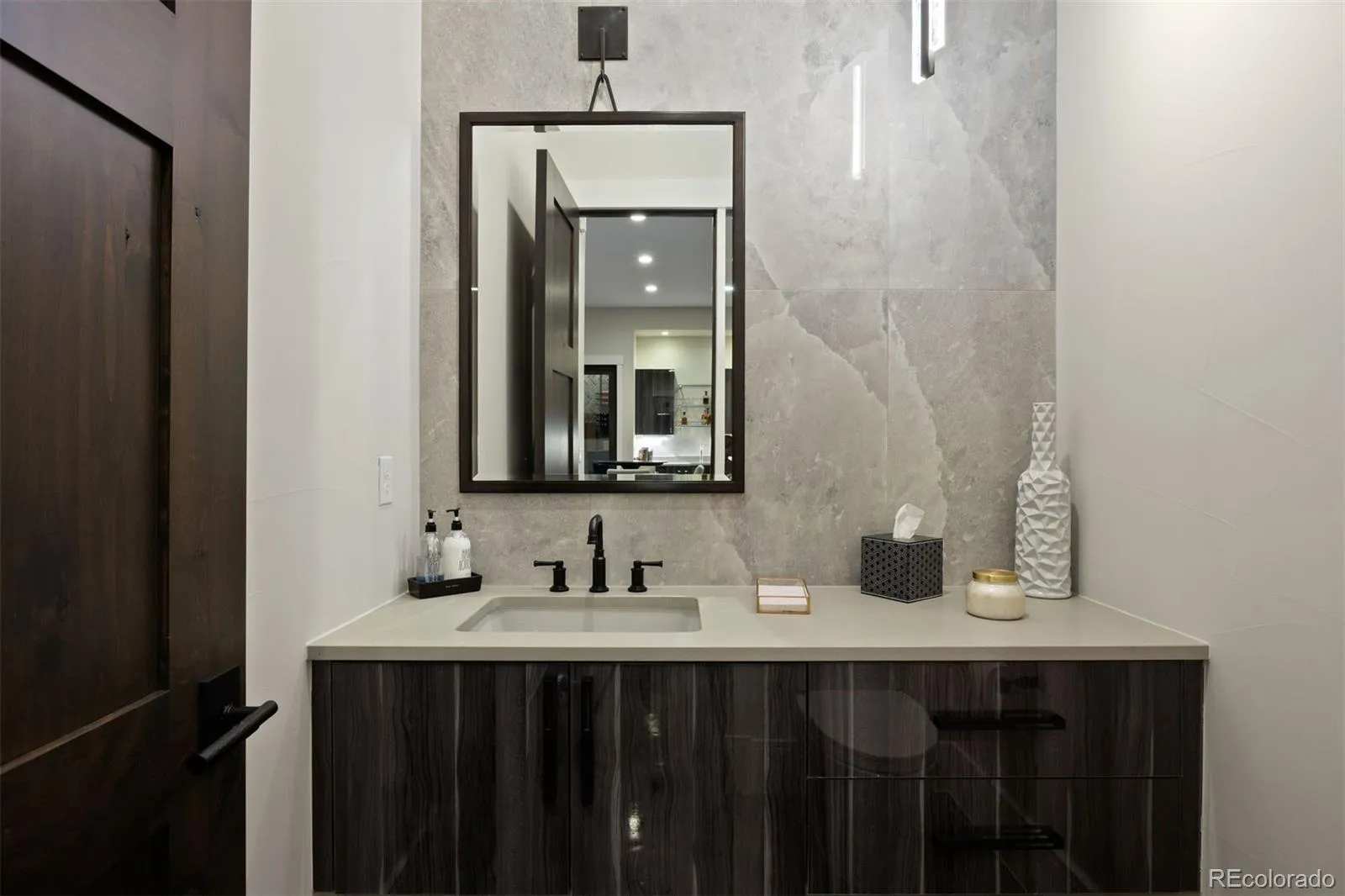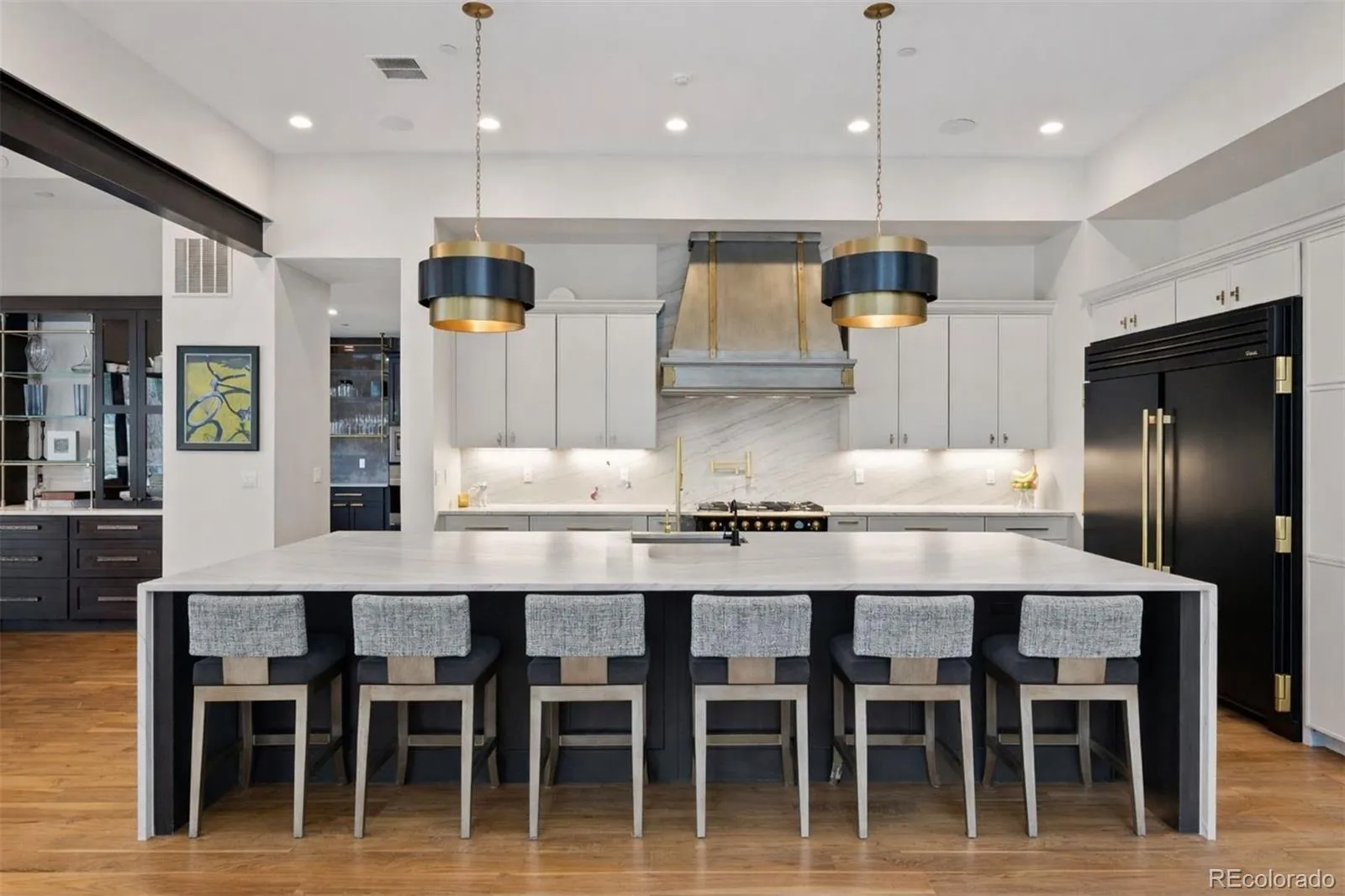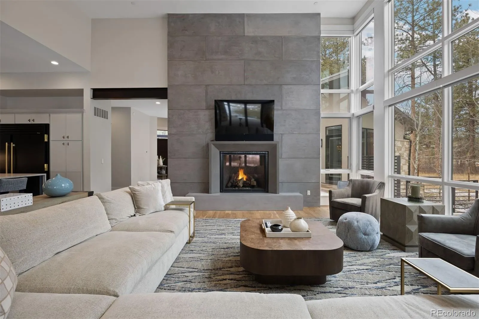 Distinctive in design and uncompromising in craftsmanship, this 5 bed | 6 bath custom home, meticulously planned from inception to completion, is almost beyond belief: every design element carefully considered, every finish intentionally selected. In a premier location on the 6th fairway of the private Country Club at Castle Pines, it’s perfectly positioned for true Colorado indoor | outdoor living. A one-of-a-kind front fire feature sets a visionary tone on entering, complemented by glass walls all around that fill this striking residence with natural light at every angle. The statuesque great room flows directly to the exceptionally planned chef’s kitchen grounded by an oversized waterfall-edge island, Le Cornue range, sculptural François & Co hood, quartzite counters, and an oversized True refrigerator. Tucked behind the main kitchen is the most amazing back kitchen you’ve ever seen including a wine column, 2nd dishwasher, Wolf oven, floating built-in bar, pantry, and substantial prep space that elevate entertaining beyond the expected. The dining area is framed by three fully retractable NanaWalls, opening the space to a sizable yard and covered patio with 2nd outdoor linear fire pit. The main level primary suite features a spa-inspired bathroom with steam shower, heated floors, and a huge walk-in closet. A private office, powder room, laundry room adjacent to the primary closet, dog wash, and a 4-car garage complete the main level. Upstairs, the guest suite offers a coffee bar and large bathroom with a tub and heated floors. The entire lower level features heated epoxy floors and a rec | media room with a golf simulator, 1,250-bottle wine cellar with kegerator, 2 large en suite bedrooms, a 5th flex bedroom, secondary laundry room, workout room, and powder room. Walnut floors extend across the main and upper levels, complemented by curated designer lighting throughout, promising an incomparable home that’s as thoughtfully engineered as it is visually striking.