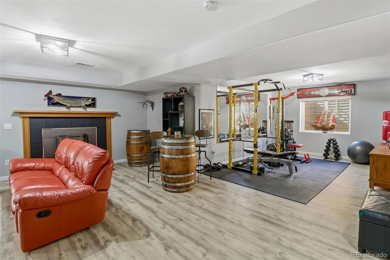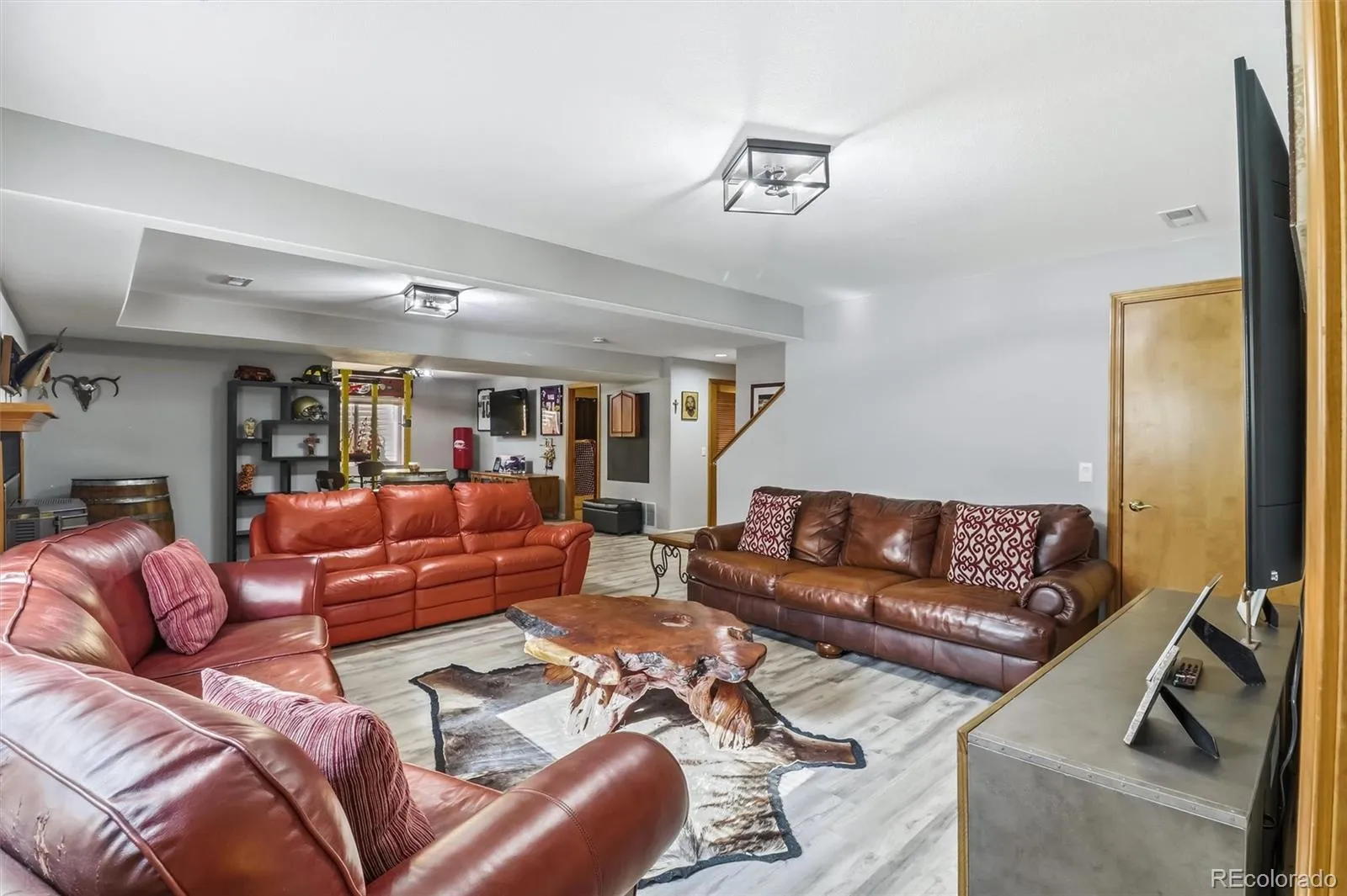 A light-filled sunroom or study opens to an oversized patio, perfect for enjoying Colorado’s outdoor lifestyle, complete with a gas hookup for grilling. The finished basement expands the living space with a large family room featuring a pellet stove insert, two additional bedrooms, a full bath, and an impressive storage area.