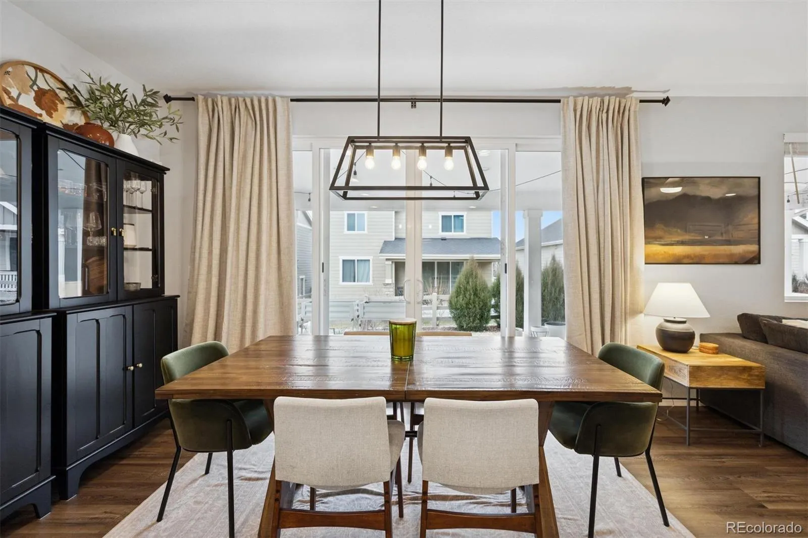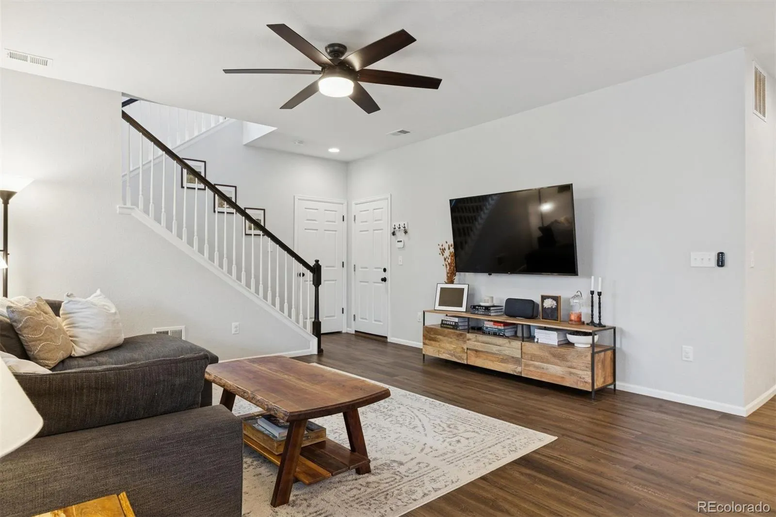 Striking curb appeal is complemented by manicured landscaping, front and rear sprinkler systems, and a fully fenced backyard—an inviting outdoor setting designed for both entertaining and quiet enjoyment. The covered back porch provides the perfect backdrop for Colorado evenings, enhanced by privacy shades that create a tranquil retreat.