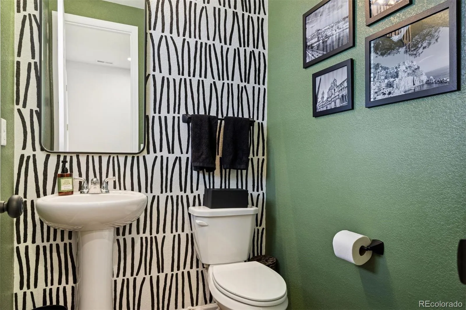 Inside, the open-concept main level is defined by durable laminate vinyl flooring, plush carpeting, updated lighting and ceiling fans, and custom window coverings throughout. A stylish powder room with a thoughtfully curated accent wall adds a subtle yet distinctive design statement.