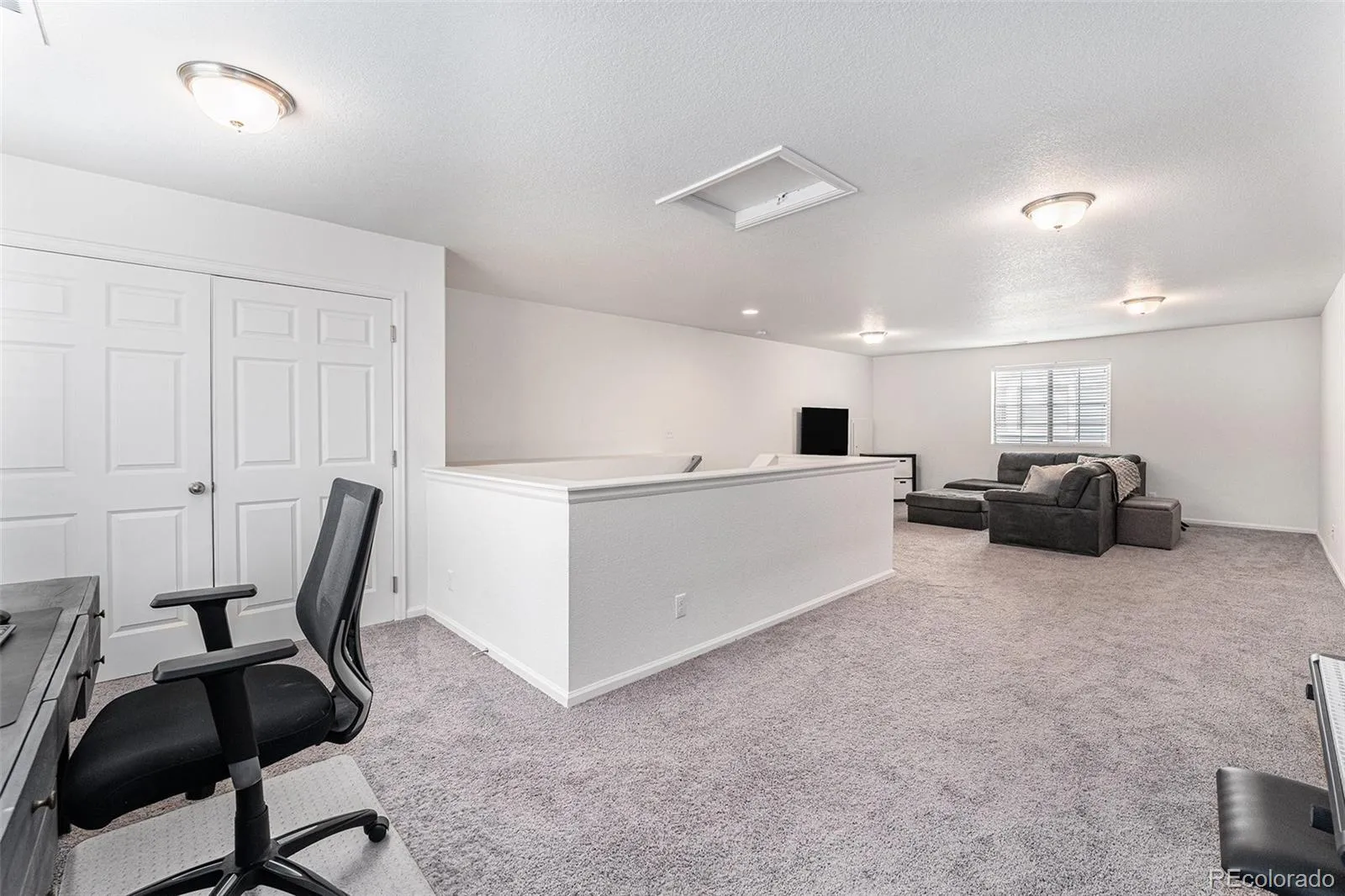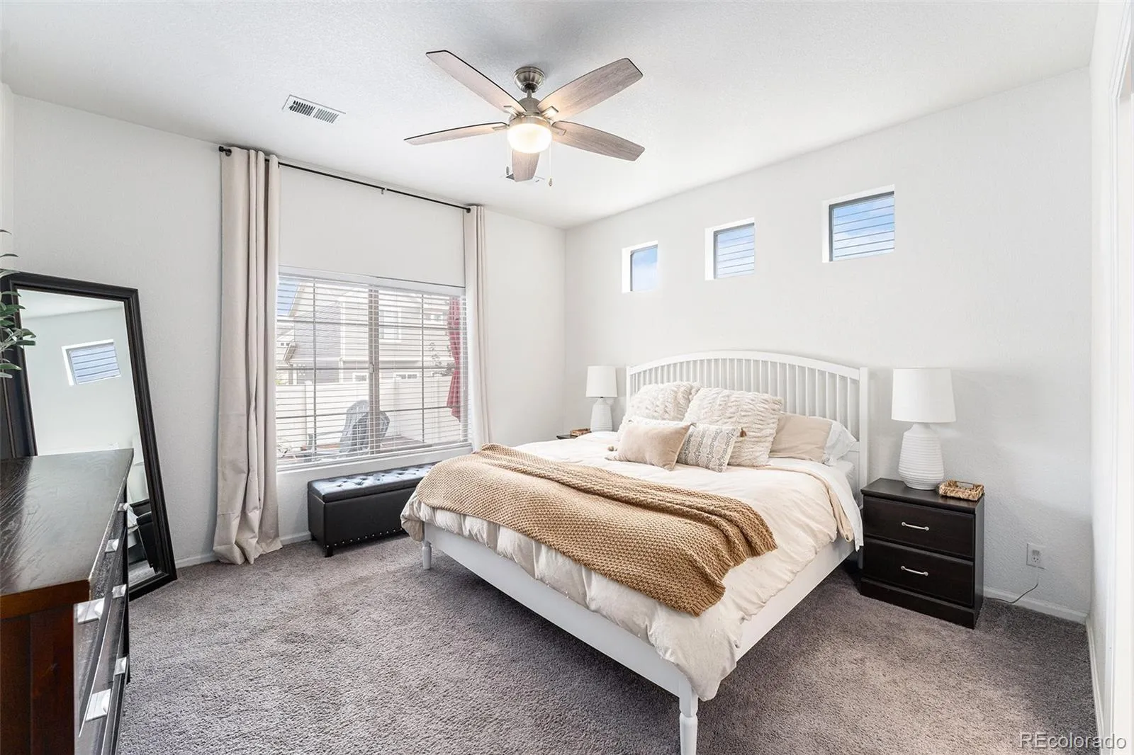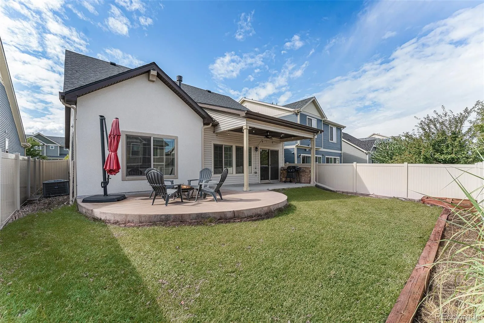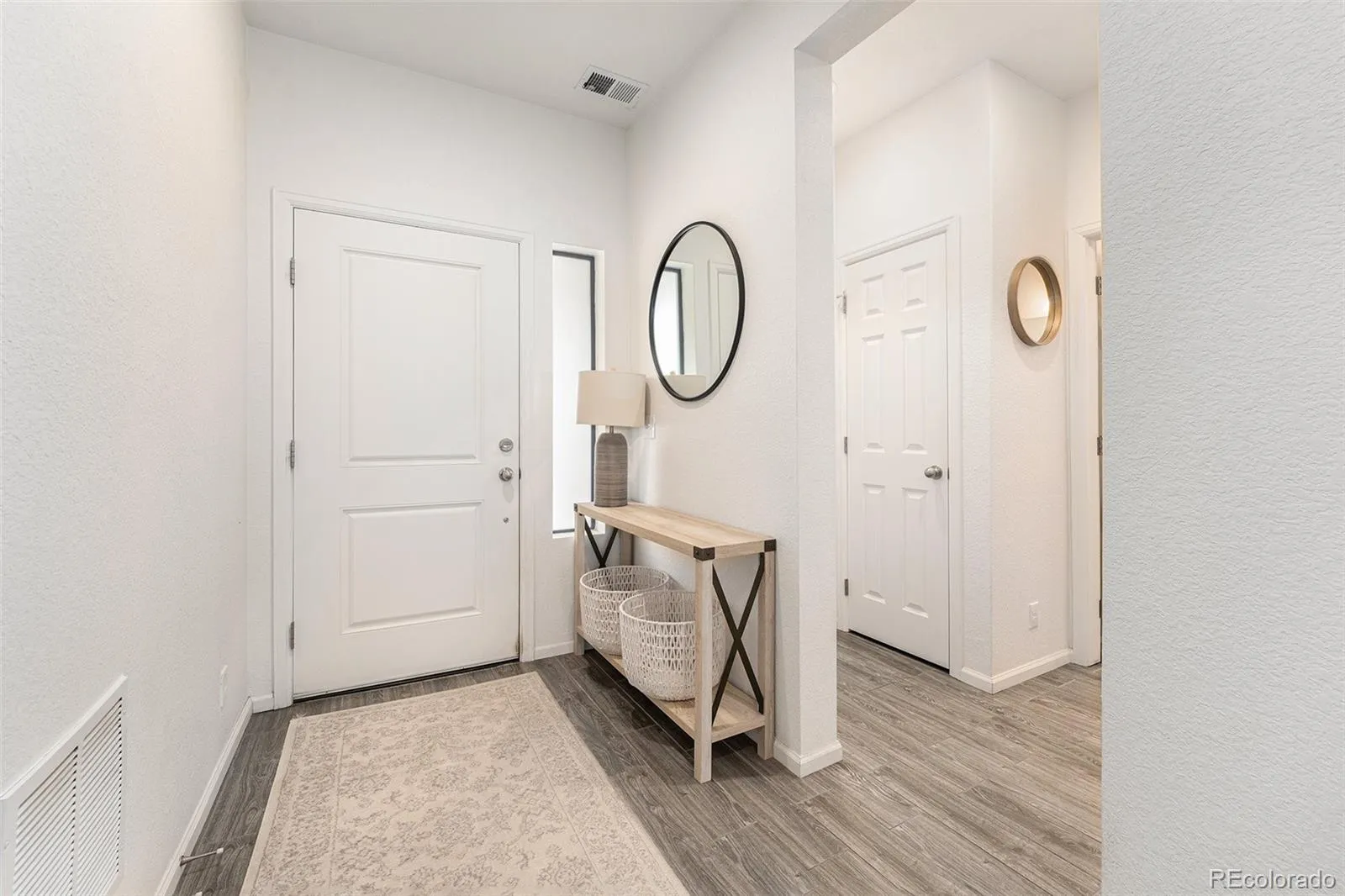 Welcome to this picture-perfect single-family home offering over 2,000 sq. ft. above ground and a thoughtful floor plan with a main-level primary suite. Step inside through the charming covered entry to a bright foyer where you’re instantly welcomed by the open and inviting floor plan. The kitchen is a true showstopper, featuring an expansive two-door pantry, upgraded cabinetry, and a statement island topped in rich granite. Designed for entertaining, the kitchen flows seamlessly into the dining area and spacious living room with a modern tiled gas fireplace. Sliding doors open to your backyard retreat, complete with a full-length patio for sun or shade, a private yard and garden beds ready for flowers or fresh vegetables. The fully fenced yard ensures both privacy and a safe space for pets. The main-floor primary suite boasts a large walk-in closet and double vanity, thoughtfully set apart from a secondary bedroom, full bathroom, and a walk-in laundry room with built-in storage. Upstairs, the large flex space offers endless possibilities—whether you need a media room, home gym, office, guest space, or a combination. *New roof in February 2025!* All appliances and major mechanics are from 2017!* Located just minutes from DIA, Green Valley Ranch Golf Club, Gaylord Rockies Resort, shopping, dining, parks, and schools!