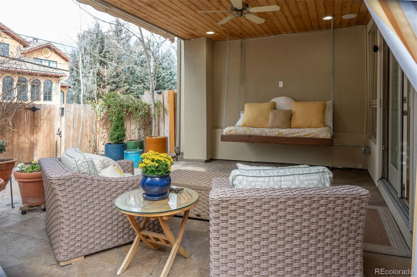 Enjoy the Cherry Creek Lifestyle in this impeccably maintained, light-filled townhome, ideally located near all the premier shopping, dining, and amenities that Cherry Creek has to offer. This lovely home features a spectacular updated custom eat-in Kitchen with sleek quartz countertops and high-end appliances, along with expansive living and dining areas, well suited for both everyday living and posh entertaining. Dreamy outdoor spaces include a rare private backyard, with a flagstone patio and covered outdoor Living Room, surrounded by breathtaking mature rose bushes and trees, a secluded paradise, perfect for morning coffee and warm-weather parties. Multiple drip lines for garden pots and side beds for the gardening enthusiast, as well as a gas-line for the grill. An elegant tiled front veranda, accessible through French doors, adds to the home’s charm. Cozy fireplaces enhance both main level living areas.