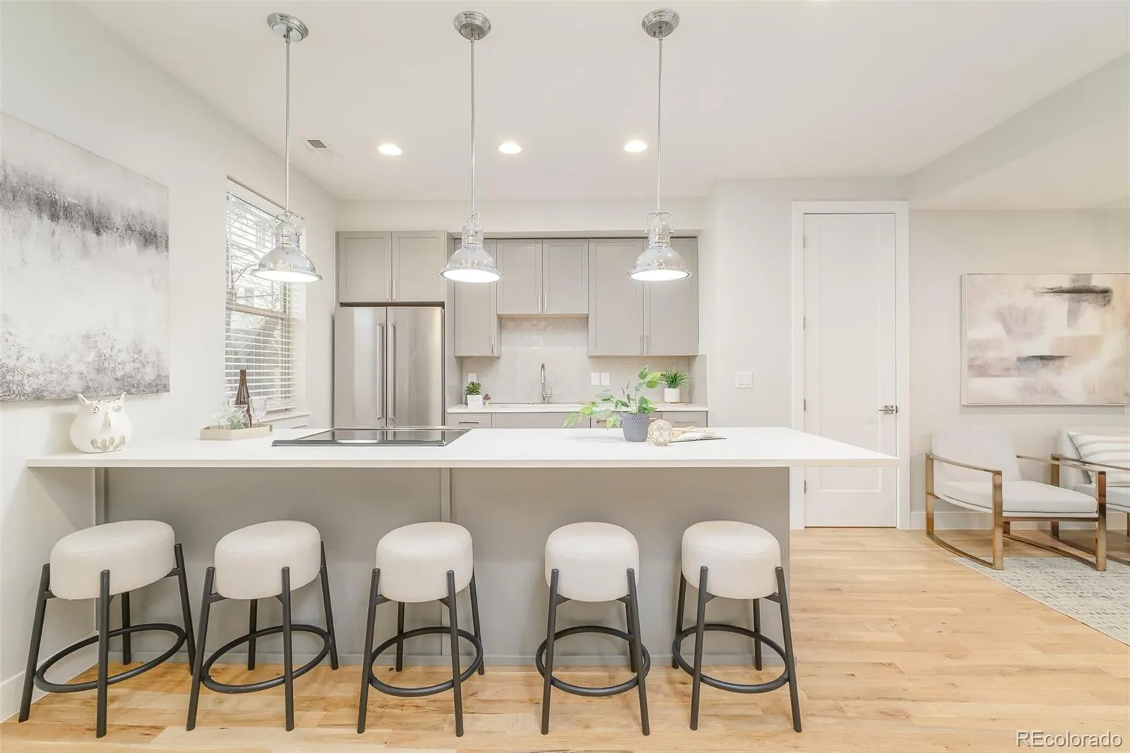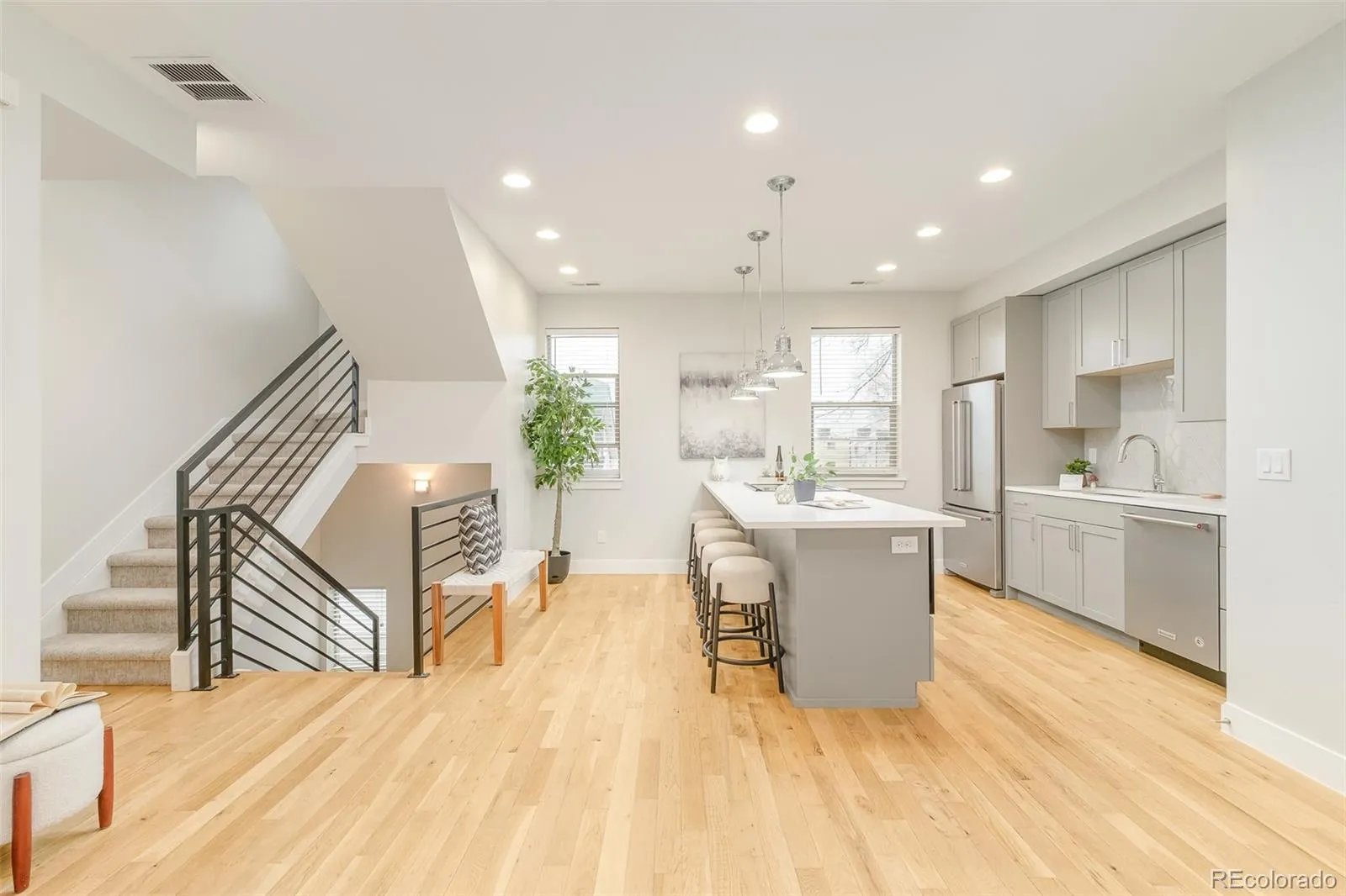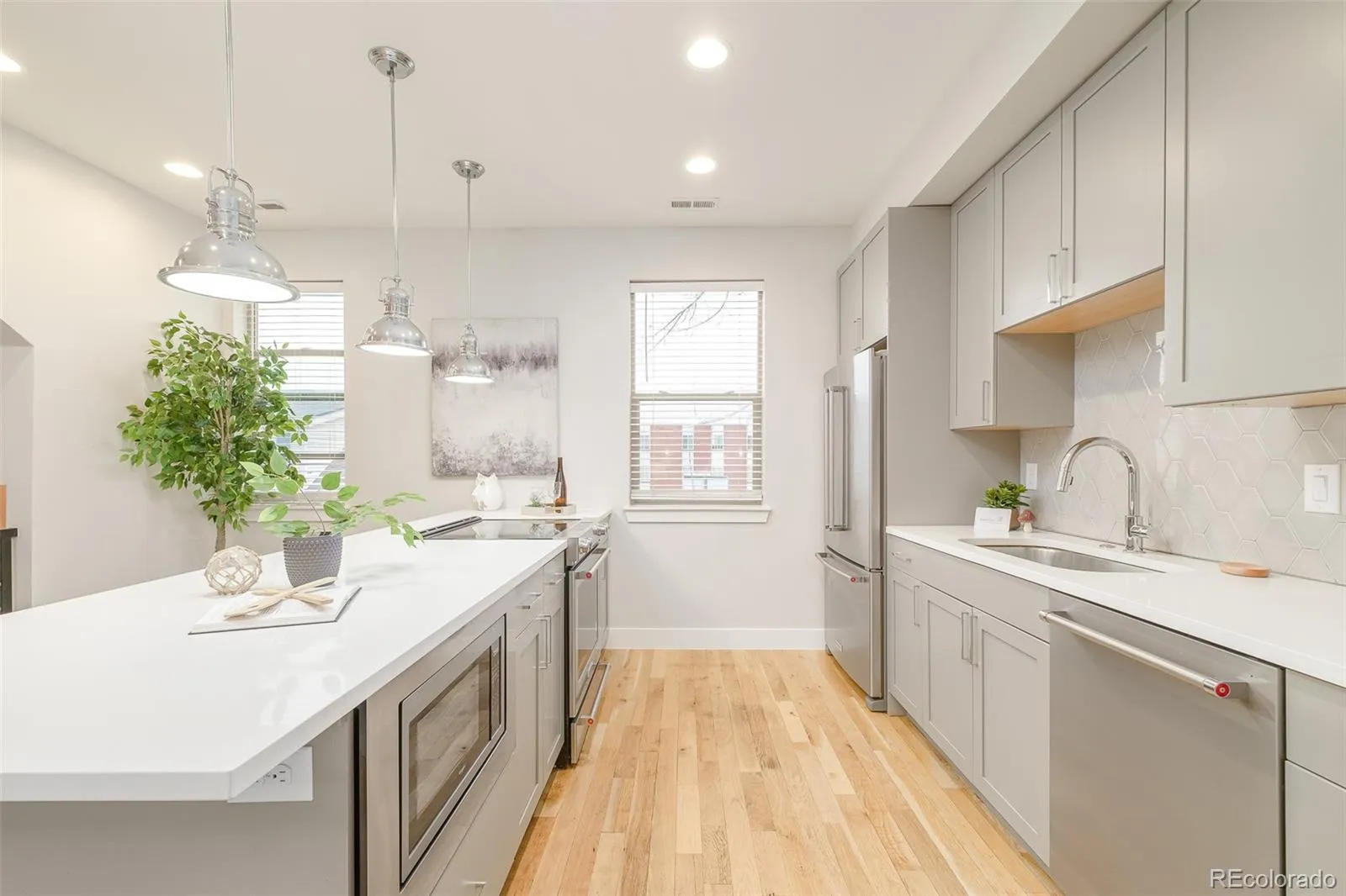 This exceptional townhome reflects a thoughtful balance of modern architecture and elevated finishes in Denver’s coveted University Park neighborhood—with the rare benefit of NO HOA and an expansive rooftop deck offering mountain views. The open, light-filled floor plan is accented by hardwood flooring, modern metal banisters, stylish fixtures, creating a touch of sophistication and appeal! The Great Room features a sleek gas fireplace that serves as a striking focal point and the inviting open floor plan provides effortless access to the impressive kitchen/dining area that provides convenient living space! Quartz countertops, premium stainless steel appliances, and an expansive breakfast bar enhance everyday living and casual entertaining. The primary suite is a private retreat, featuring an oversized three-quarter shower, dual vanities, and a walk-in closet. The secondary bedroom, full bath, and laundry area are ideally situated in close proximity to the primary suite. With a well-planned front entry and mudroom adjacent to the garage you will enjoy the convenience and practicality the main level features, including a spacious half-bath. The remarkable outdoor space is equally suited for entertaining, quiet relaxation, and an play area for your pets! Thoughtfully designed, it blends a private outdoor retreat with practical urban living! An ideal location in the University Park neighborhood you are within minutes to Light Rail, entertainment, restaurants, shopping, and an easy commute to DTC or downtown Denver.