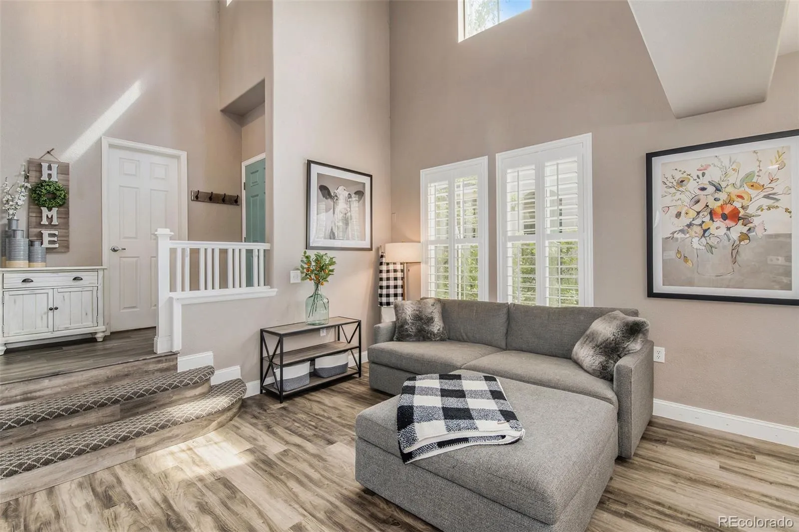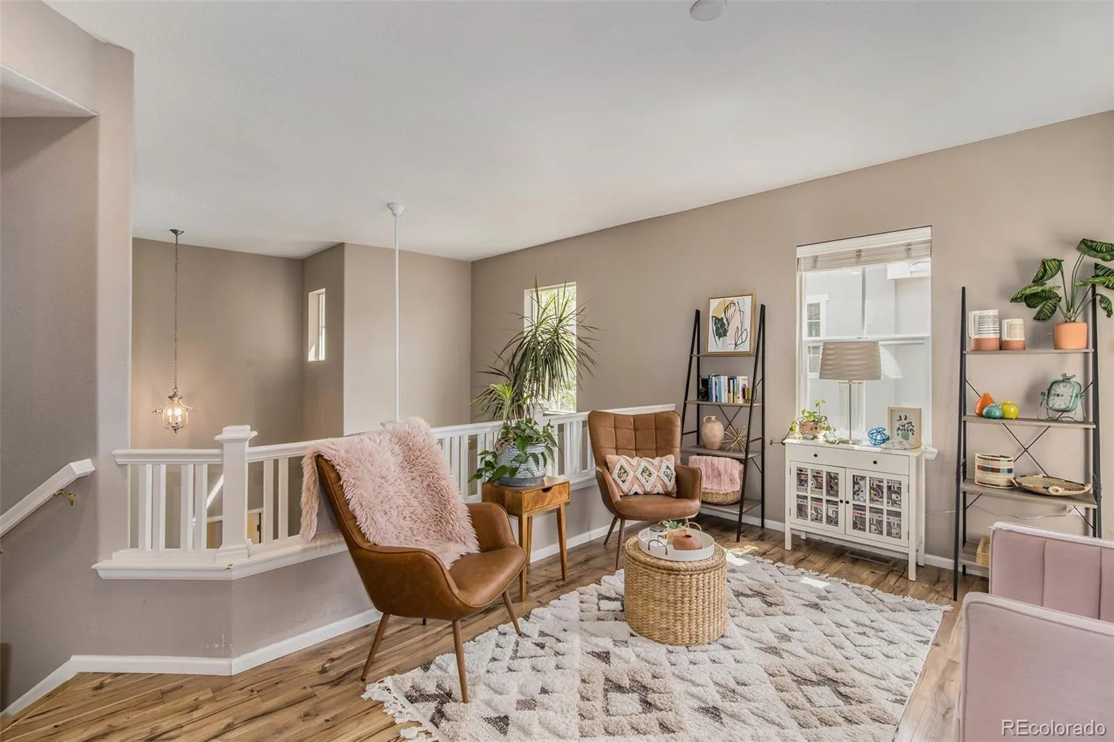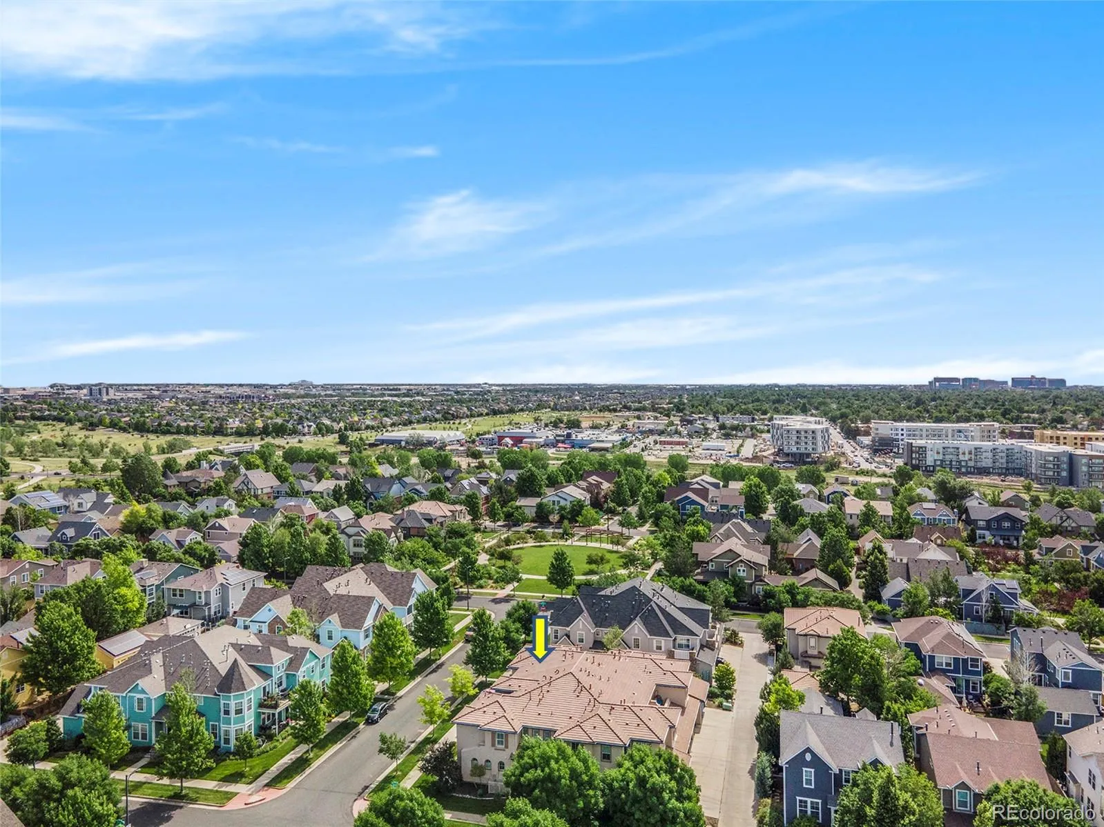 Beautiful end-unit townhome, lovingly maintained by the original owner. A soaring two-story living area fills the great room and kitchen with abundant natural light, creating an inviting and open feel. Quality low-maintenance flooring and designer carpet flow seamlessly throughout the thoughtfully designed floor plan. The focal gas fireplace anchors the main living space, while the open kitchen makes entertaining friends and family effortless. Upstairs, a spacious loft provides a second living area and opens to a private balcony—perfect for relaxing or working from home. Lovely primary bedroom with custom walk-in closet cabinetry. Two full bathrooms, including a five-piece primary bath, add to the comfortable, home-like feel. An oversized two-car garage offers excellent space for both vehicles and storage. Enjoy an unbeatable location just steps from pocket parks and Westerly Creek Trail, with the 80-acre Central Park and community recreation center only a short walk away. This is truly a must-see home in an exceptional setting.