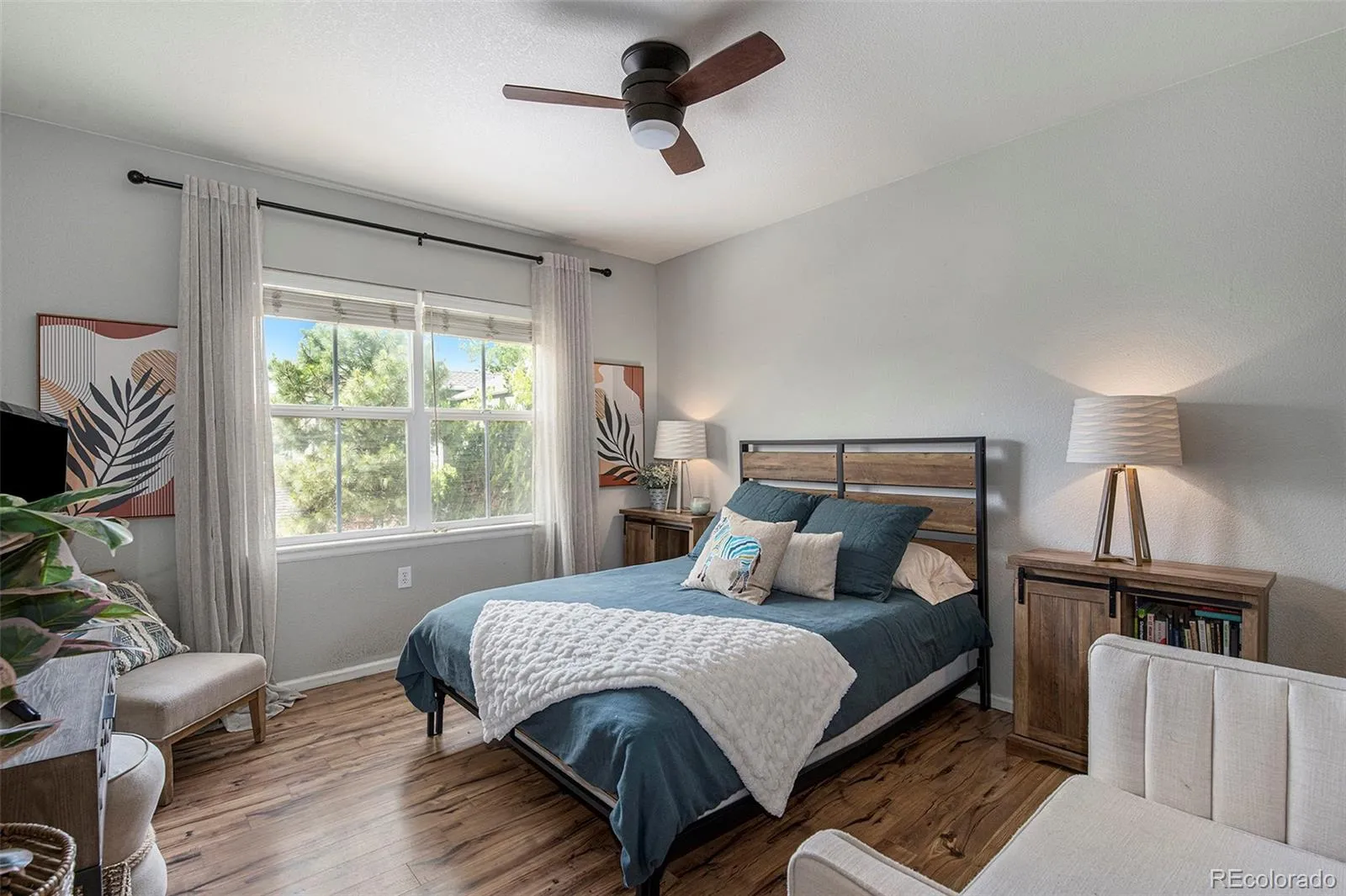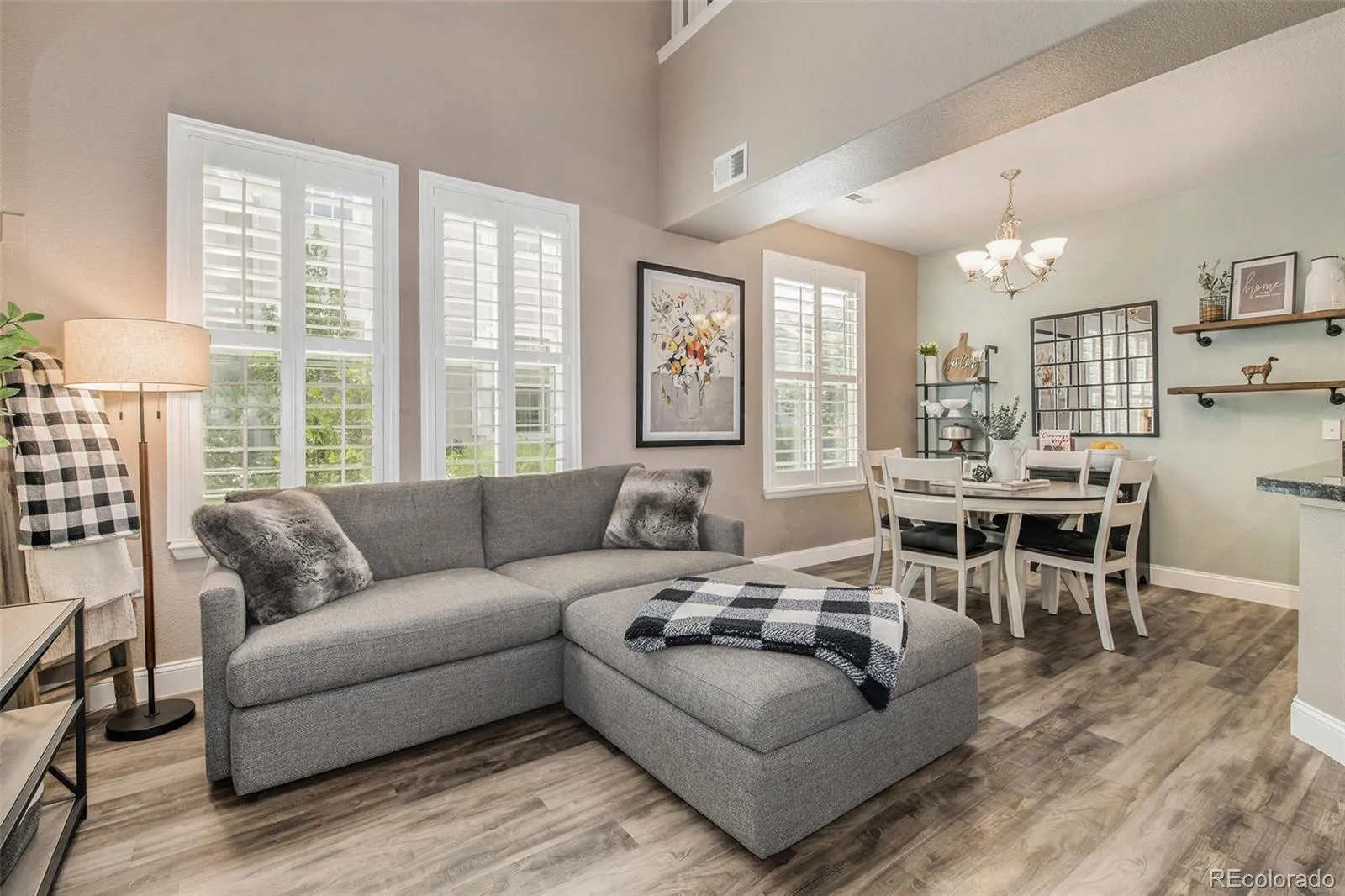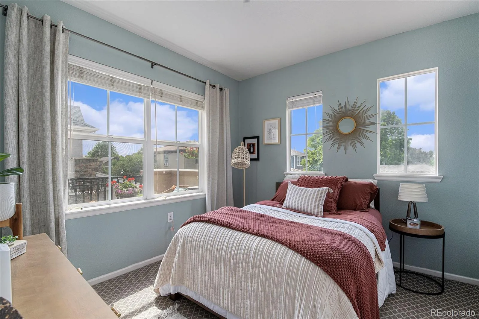 Beautiful end-unit townhome, lovingly maintained by the original owner. A soaring two-story living area fills the great room and kitchen with abundant natural light, creating an inviting and open feel. Quality low-maintenance flooring and designer carpet flow seamlessly throughout the thoughtfully designed floor plan. The focal gas fireplace anchors the main living space, while the open kitchen makes entertaining friends and family effortless. Upstairs, a spacious loft provides a second living area and opens to a private balcony—perfect for relaxing or working from home. Lovely primary bedroom with custom walk-in closet cabinetry. Two full bathrooms, including a five-piece primary bath, add to the comfortable, home-like feel. An oversized two-car garage offers excellent space for both vehicles and storage. Enjoy an unbeatable location just steps from pocket parks and Westerly Creek Trail, with the 80-acre Central Park and community recreation center only a short walk away. This is truly a must-see home in an exceptional setting.