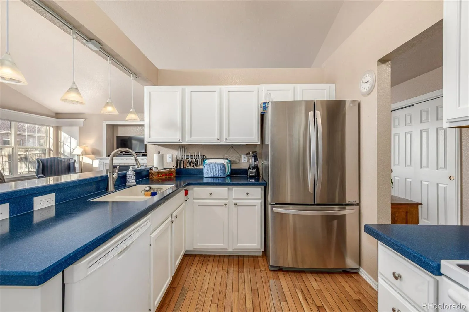 Step into this 3 bed 3 bath residence where warmth, space, and thoughtful design converge in a setting that feels both inviting and refined. Morning light filters through mature trees, tracing a quiet path to a charming facade set back from the street, where an extra long driveway and an attached two car garage create a sense of privacy and arrival. Inside, vaulted ceilings and oversized windows introduce an open, airy living room anchored by a classic fireplace beneath a refined built in, establishing a natural gathering point that feels both warm and intentional. Soft modern carpet underfoot and a soothing neutral palette reinforce the inviting tone, while polished hardwood floors carry warmth into the dining and kitchen spaces. The dining area descends from the vaulted ceiling beneath a statement chandelier and opens to the backyard through glass doors, creating an easy rhythm between indoor and outdoor living. A classic breakfast bar connects dining and kitchen, offering flow without sacrificing definition. The kitchen itself is designed for everyday ease, with abundant modern white cabinetry, solid surface counters, and an intuitive layout that supports both quiet mornings and lively evenings. The primary suite continues the sense of retreat, with vaulted ceilings, generous proportions, and a private ensuite bath featuring dual sinks and a walk-in closet. Downstairs, a finished basement unfolds into a large, flexible family room that invites creativity, from media lounge to play space or home studio, complemented by a dedicated workshop with built-in cabinetry for projects and storage. Out back, a large private yard extends the living space outdoors, framed by greenery and centered around a covered deck ideal for lingering summer evenings. This single family residence in Sun Valley Estates blends charm, space, and thoughtful design in a location that feels both connected and quietly removed, offering a lifestyle shaped by comfort, light, and everyday appeal.